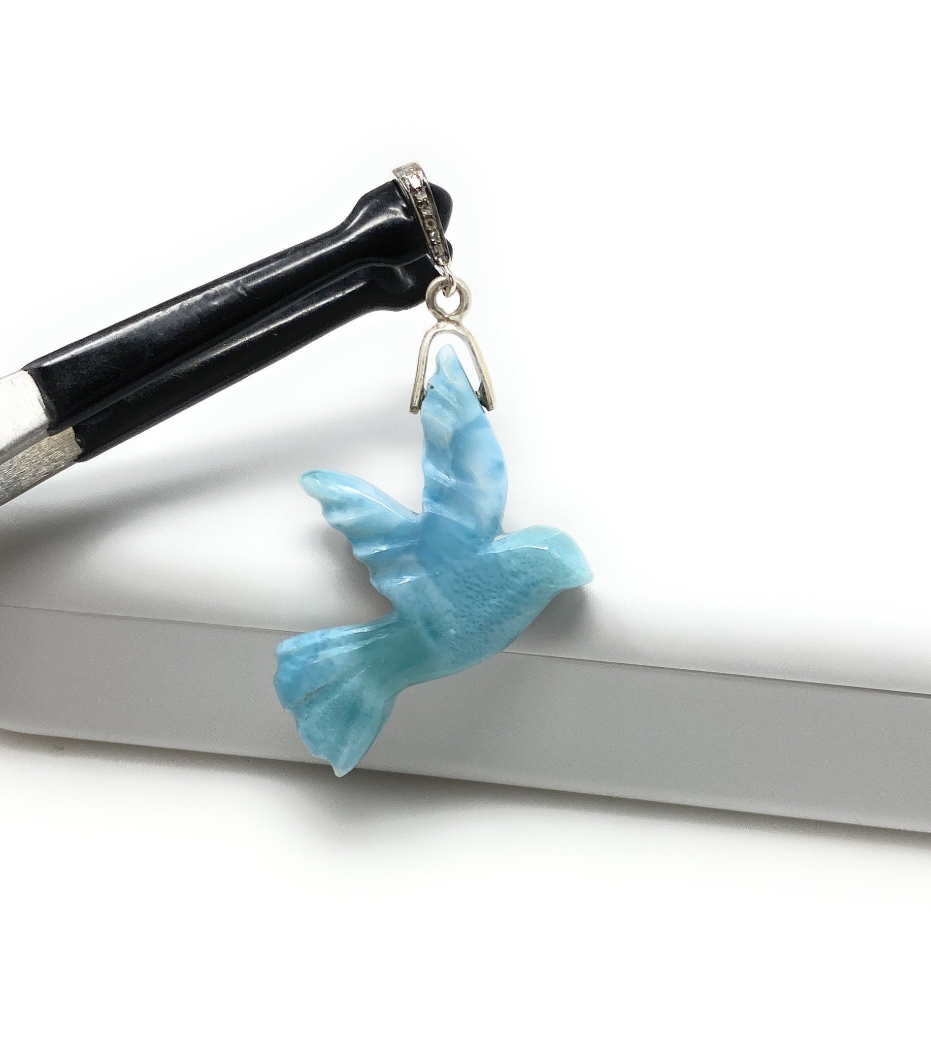 12g Rare Large Larimar Bird Pave Diamond Pendant, Silver Bohemian Jewelry, Dominican Republic Larimar Bird Pendant