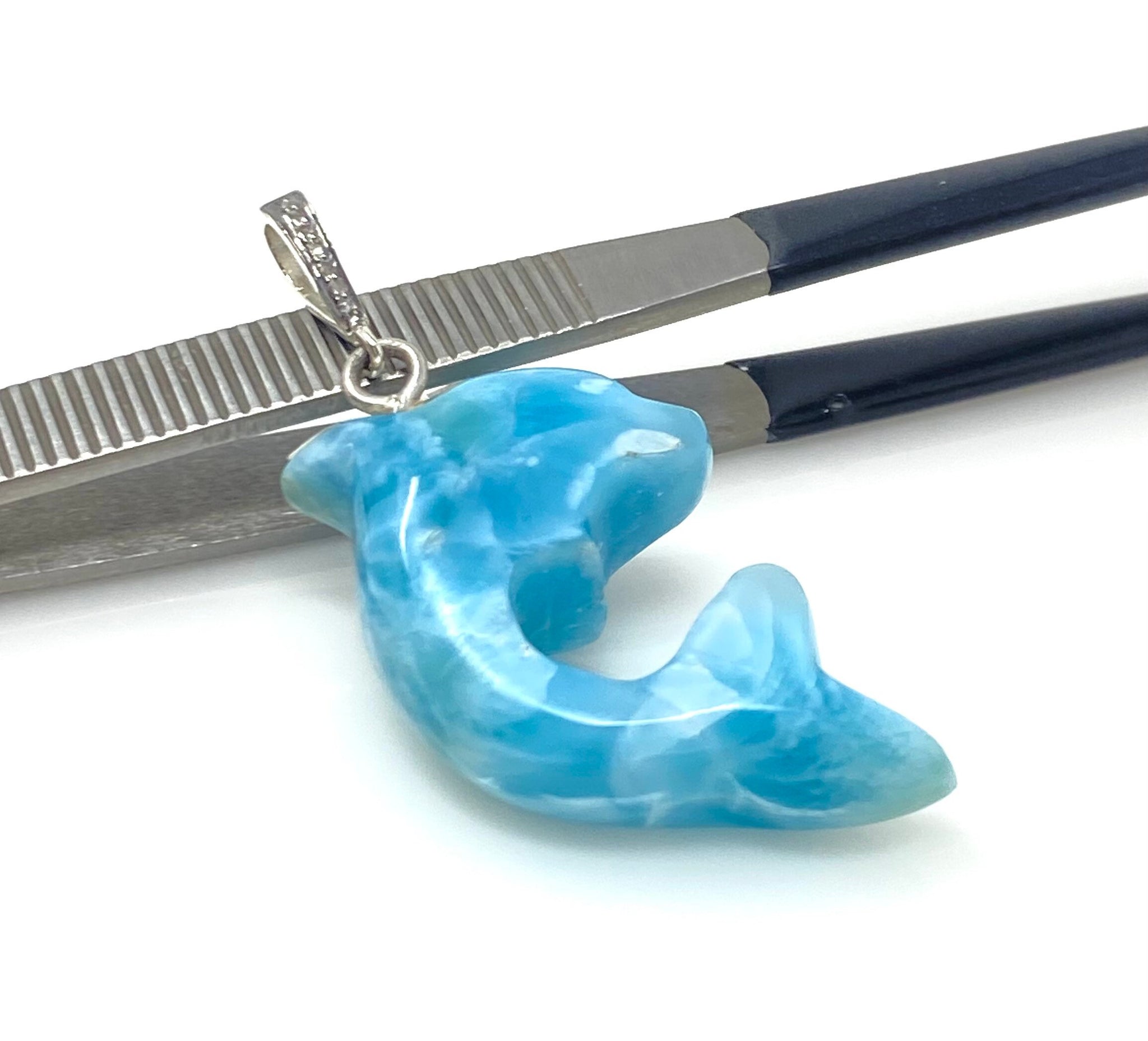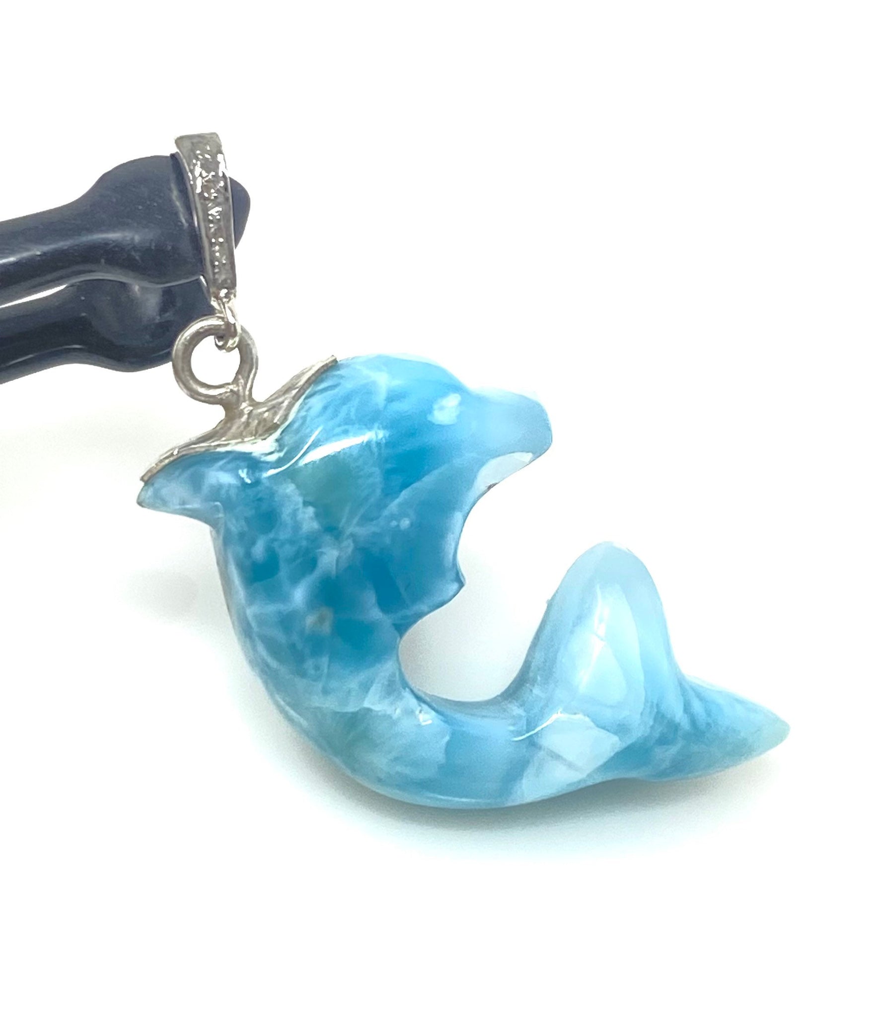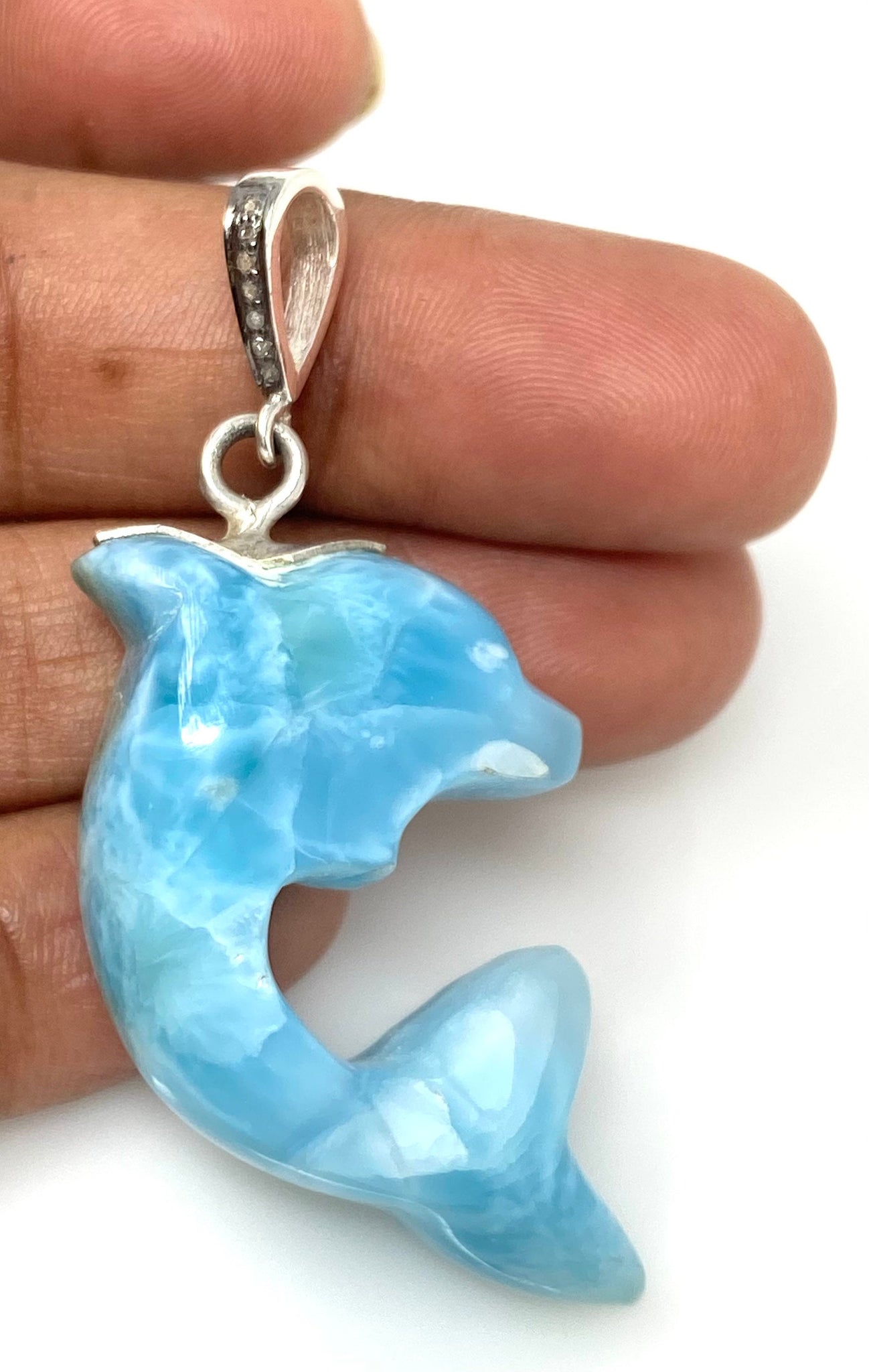 14g Larimar Dolphin Pendant, Silver Pave Diamond Larimar Pendant, Bohemian Jewelry, Dominican Republic Larimar Pendant