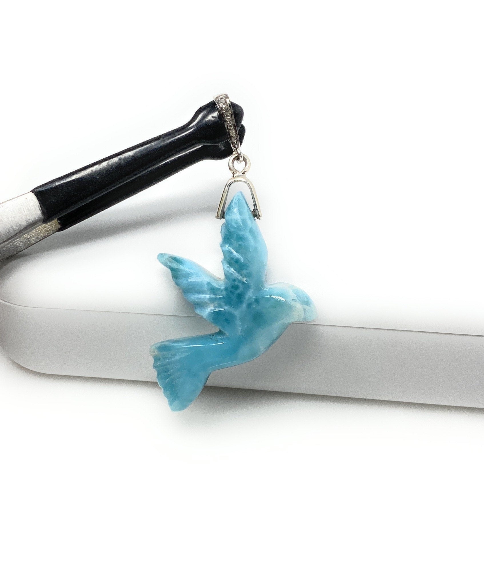 14g Rare Large Larimar Bird Pave Diamond Pendant, Silver Bohemian Jewelry, Dominican Republic Larimar Pendant, Larimar Bird Pendant