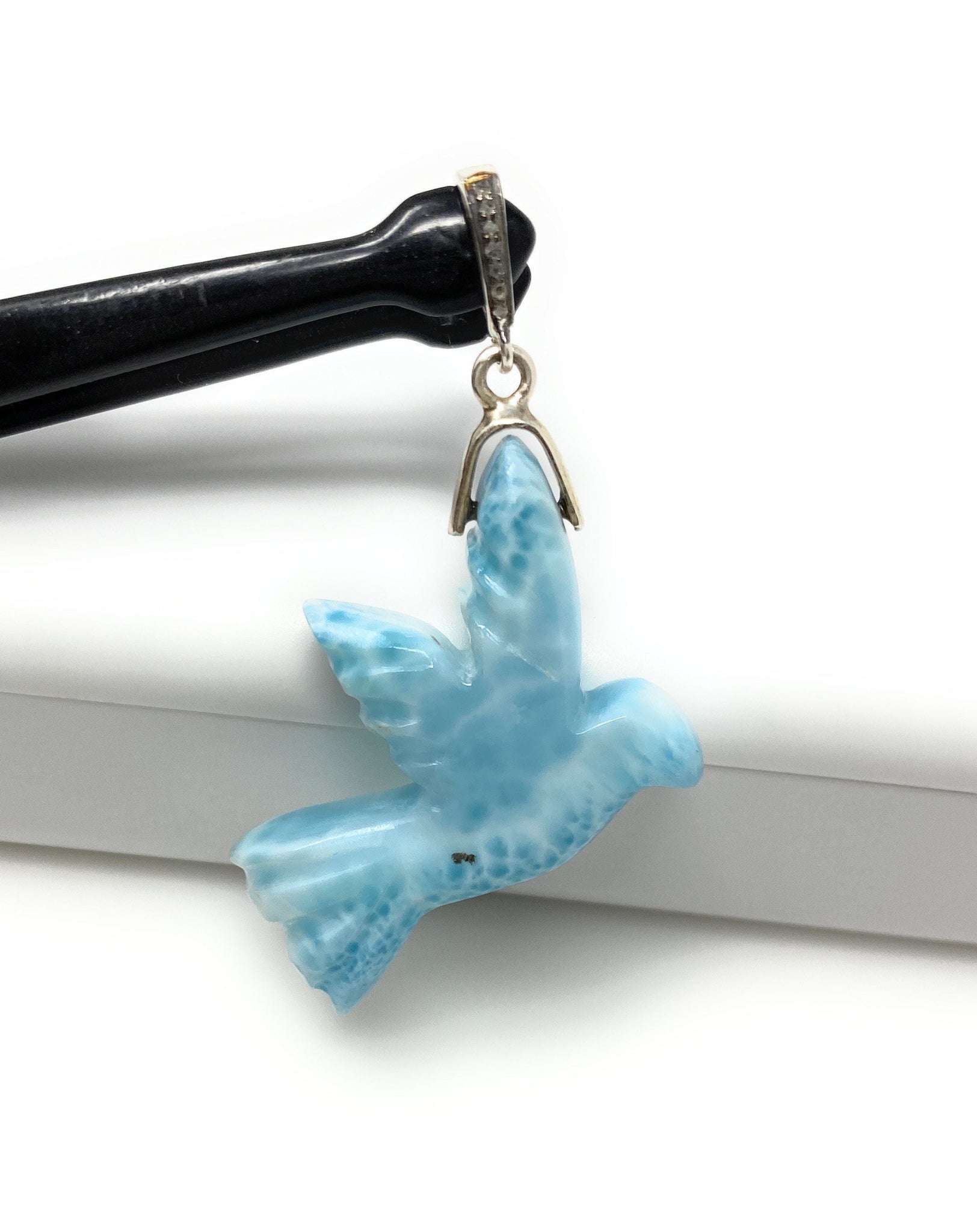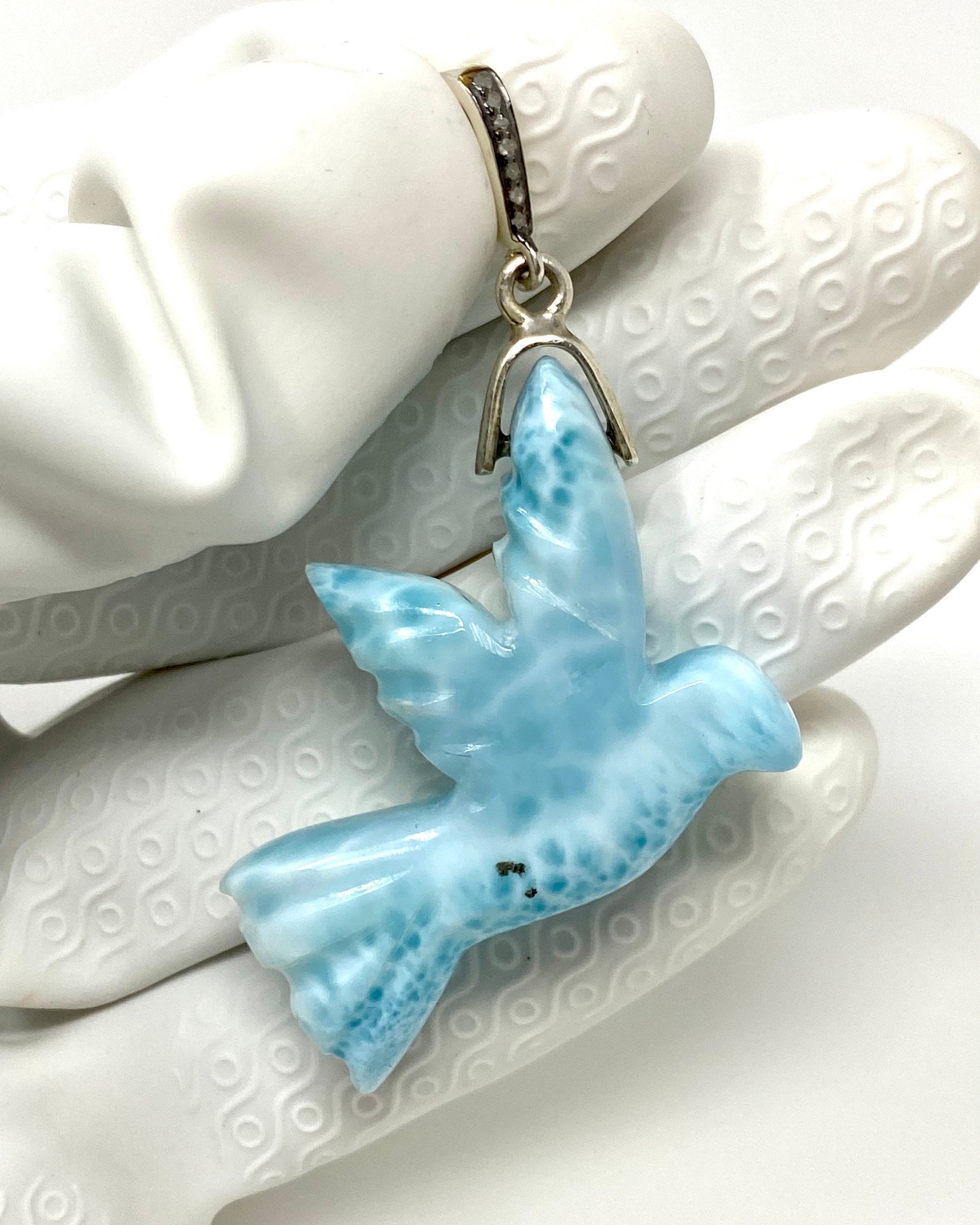 14g Rare Large Larimar Bird Pave Diamond Pendant, Silver Bohemian Jewelry, Dominican Republic Larimar Pendant, Larimar Bird Pendant