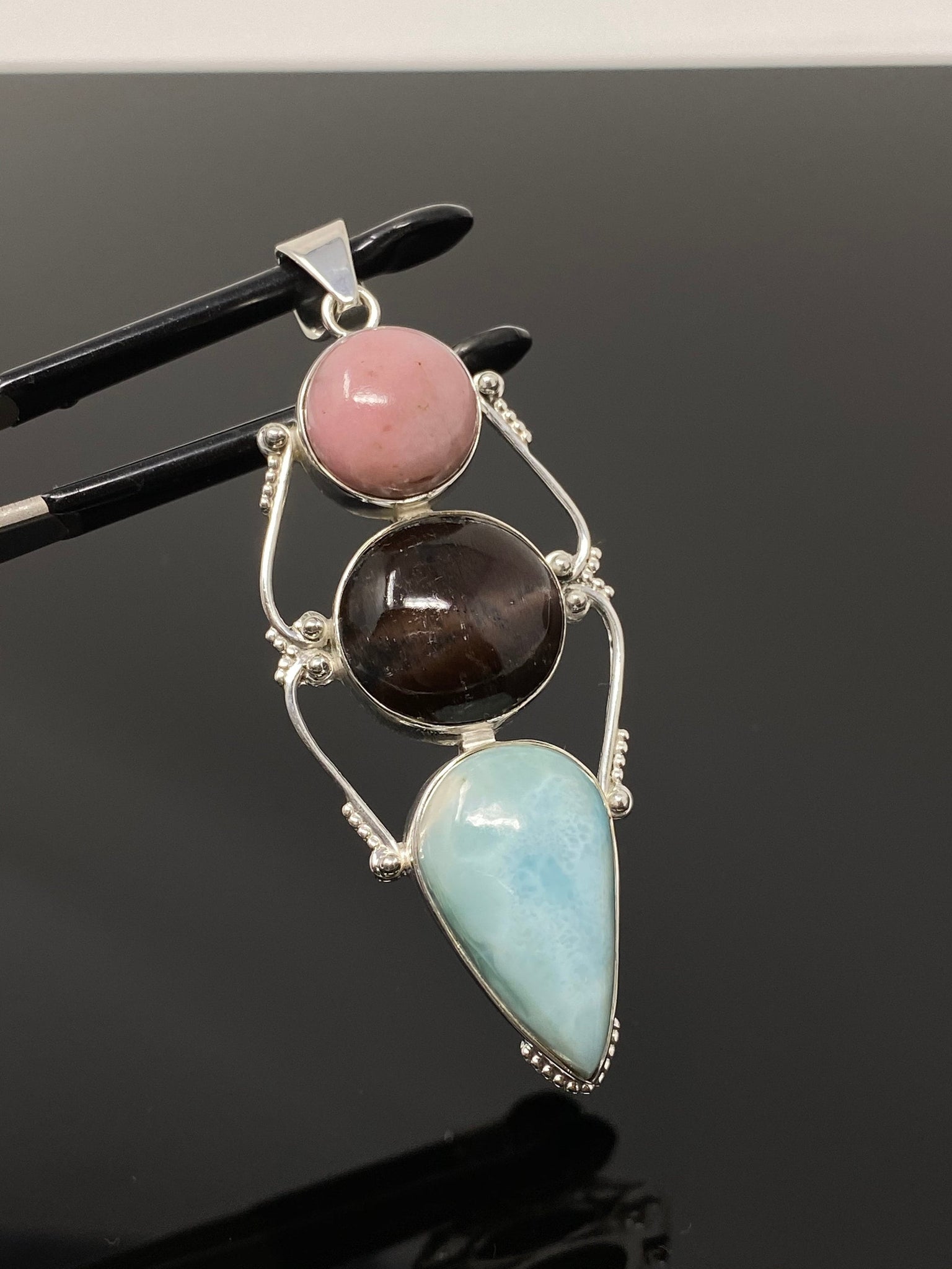 This beautiful Handmade Natural Cats Eye, Natural Pink Opal and Natural Dominican Republic Larimar 925 Sterling Silver Pendant is made with the wire wrapped design which makes the pendant unique and designer and is an excellent choice for any occasion and makes a great gift for the loved ones.