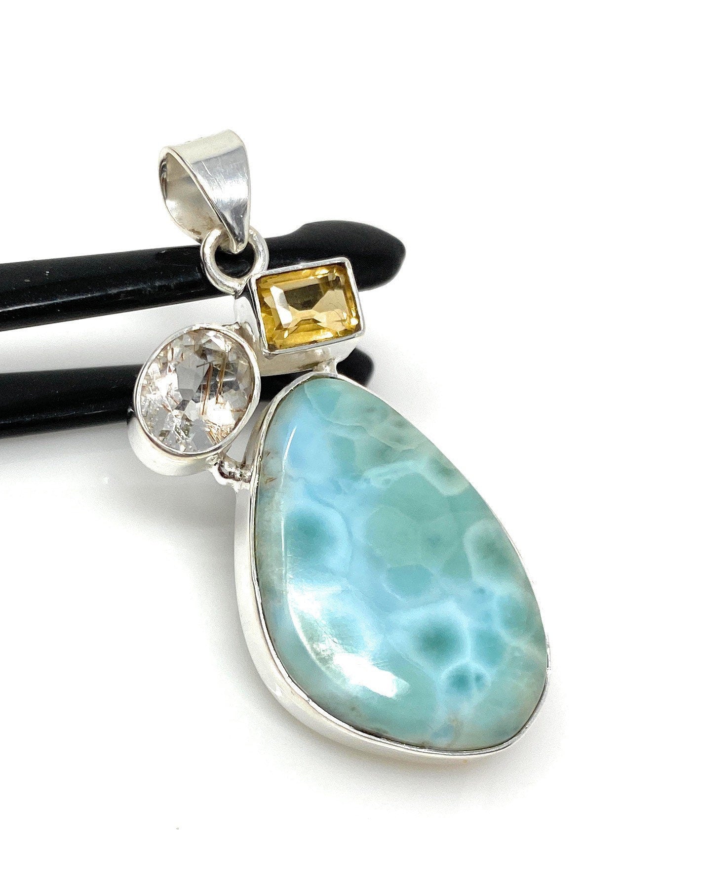 Gemstone Pendant - Larimar, Citrine and Golden Rutile, Bohemian Jewelry, Larimar Pendant, Sterling Silver Jewelry
