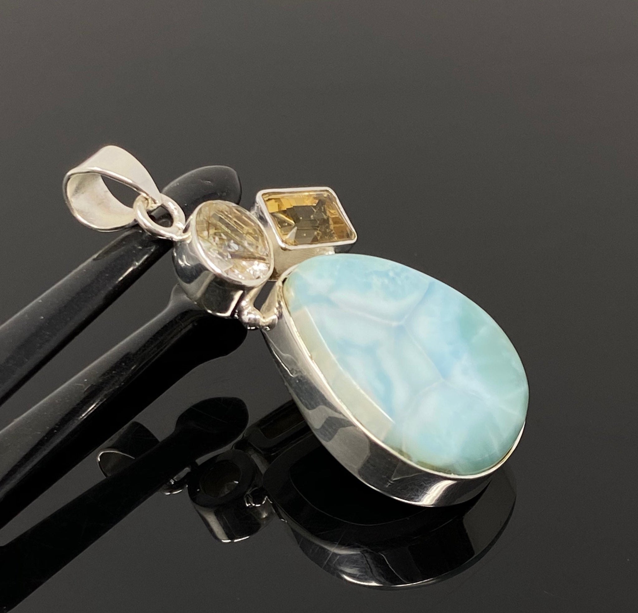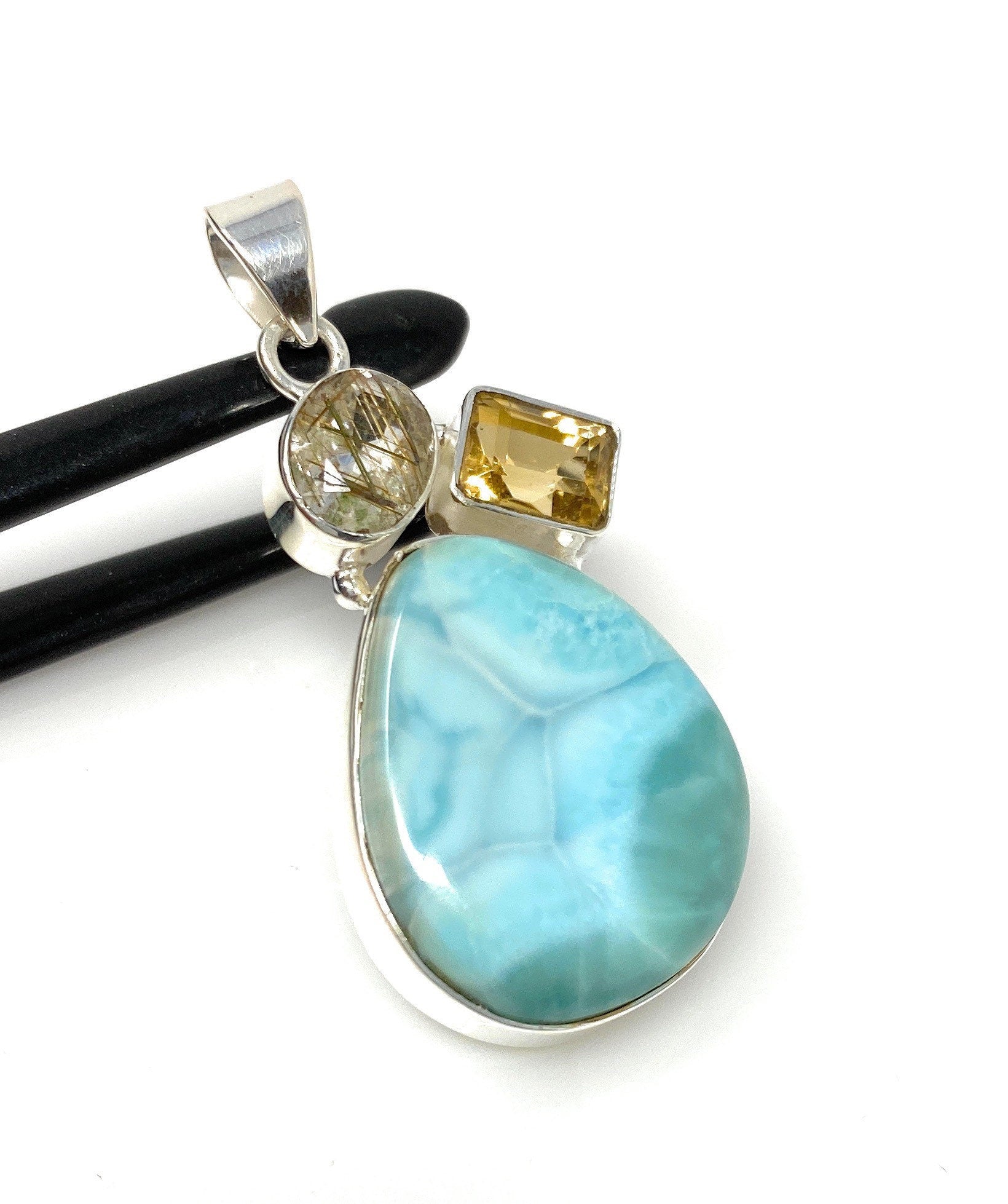 This Beautiful Handmade 925 Sterling Silver Designer Pendant is made with using Smooth Larimar Cabochon and Cut Stone Golden Rutile and Citrine. It is an excellent choice for any occasion and makes a great gift for the loved ones.