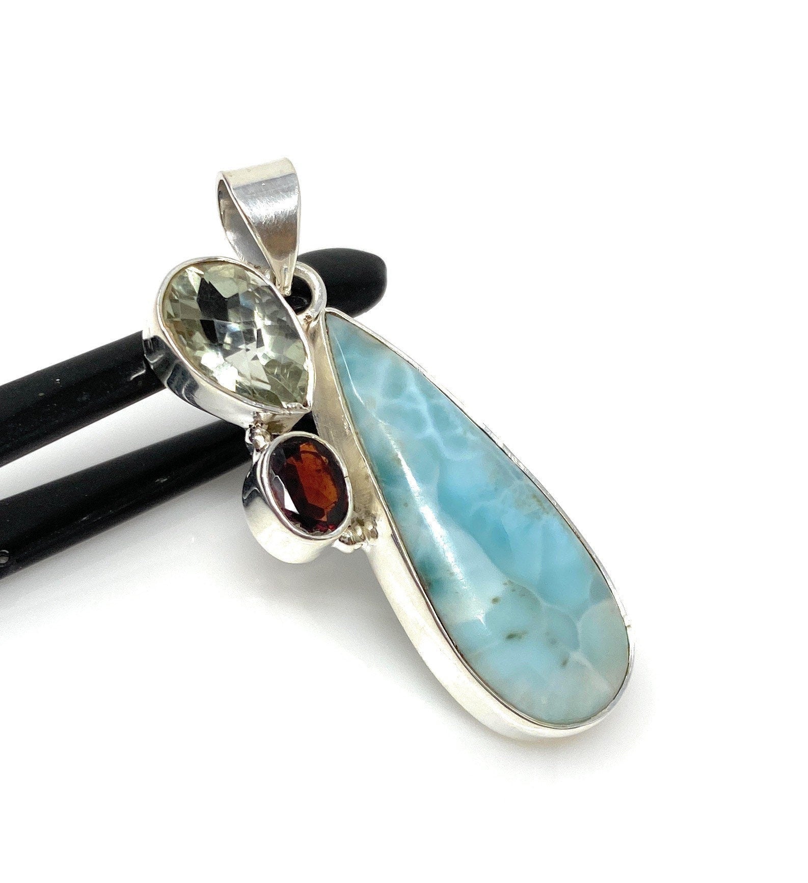 This Beautiful Handmade 925 Sterling Silver Pendant is made with using Smooth Larimar Cabochon, Garnet and Green Amethyst and is an excellent choice for any occasion and makes a great gift for the loved ones.