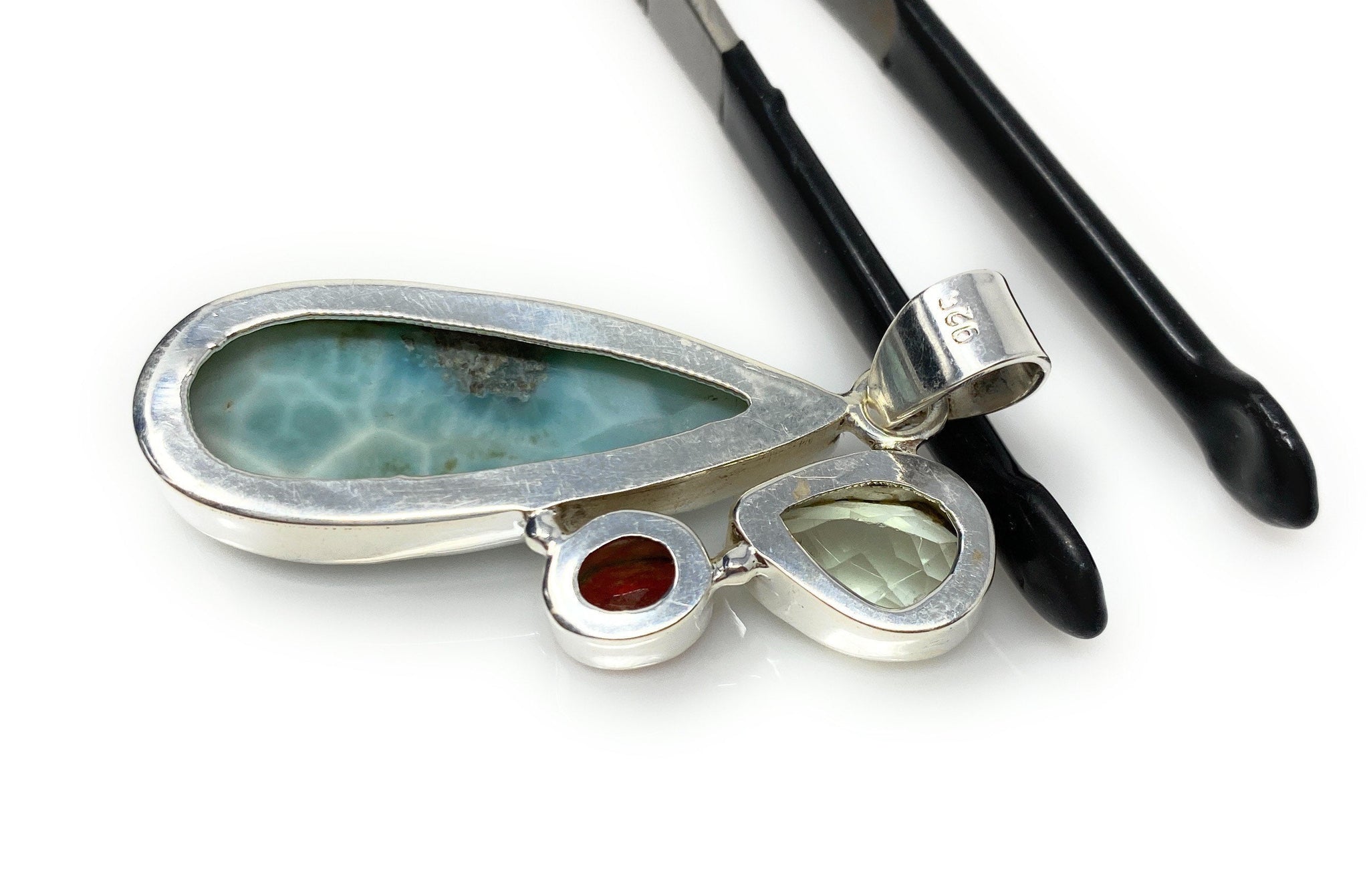 Natural Larimar with Green Amethyst and Garnet Gemstone Sterling Silver Pendant DIY Jewelry at Wholesale Price.