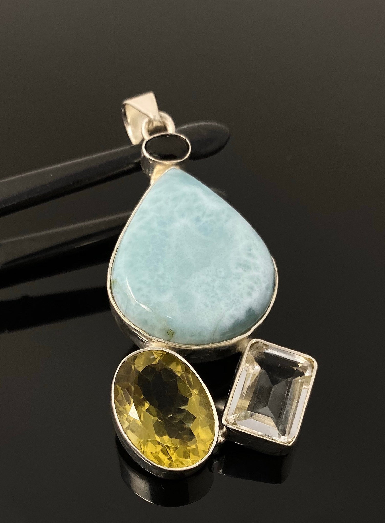 This Beautiful Handmade 925 Sterling Silver Designer Large Pendant is made with using Smooth Larimar Cabochon, Cut Stone Lemon Quartz, Smokey Quartz and Clear Quartz and is an excellent choice for any occasion and makes a great gift for the loved ones.