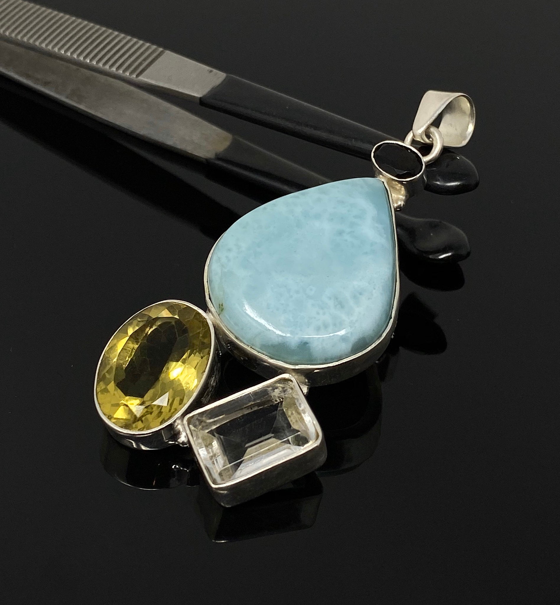 Natural Larimar with Smoky Quartz , Clear Quartz and Lemon Quartz Gemstone Sterling Silver Pendant DIY Jewelry at Wholesale Price.