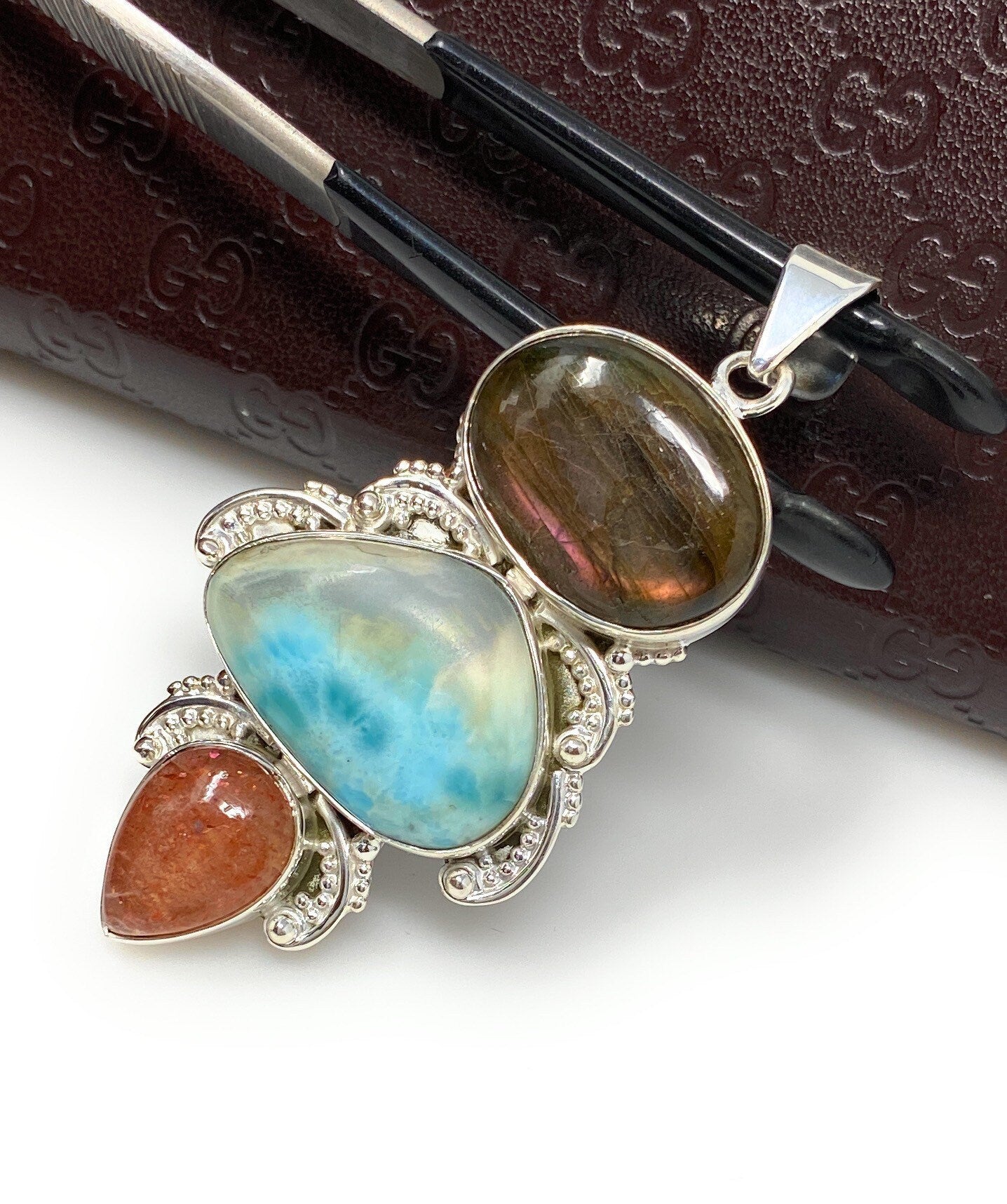 This beautiful Handmade Natural Sunstone, Natural Labradorite and Natural Dominican Republic Larimar 925 Sterling Silver Pendant is made with the wire wrapped design which makes the pendant unique and designer and is an excellent choice for any occasion and makes a great gift for the loved ones.