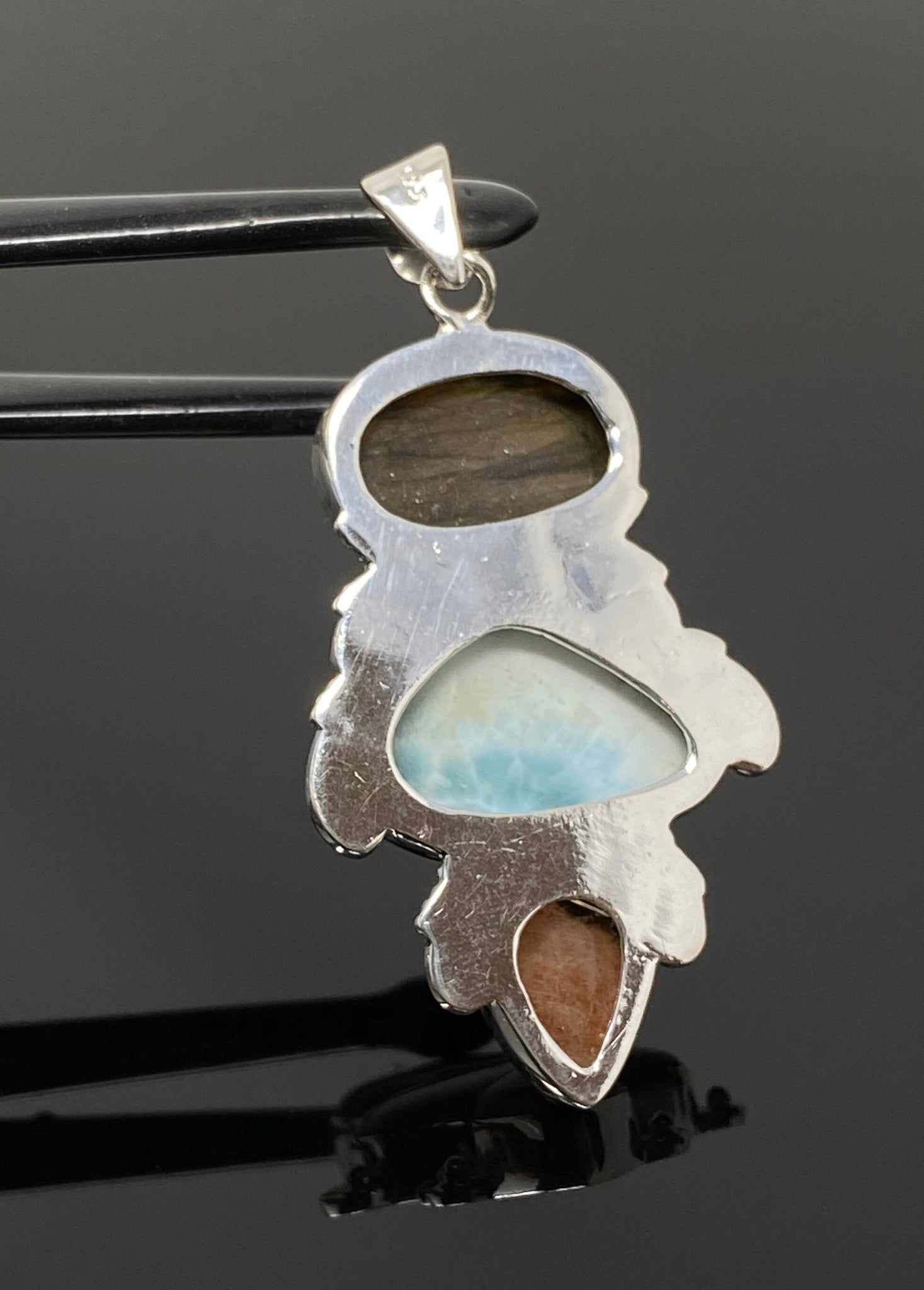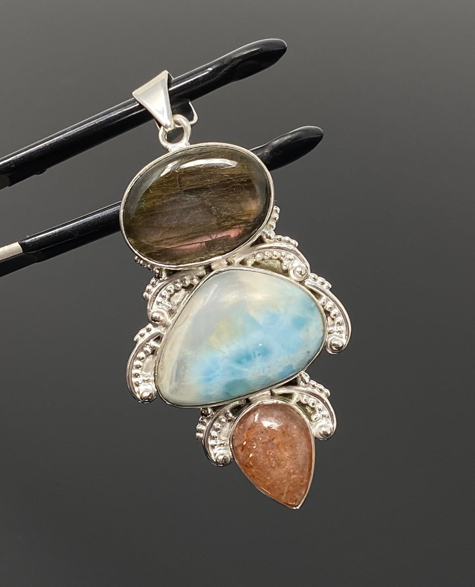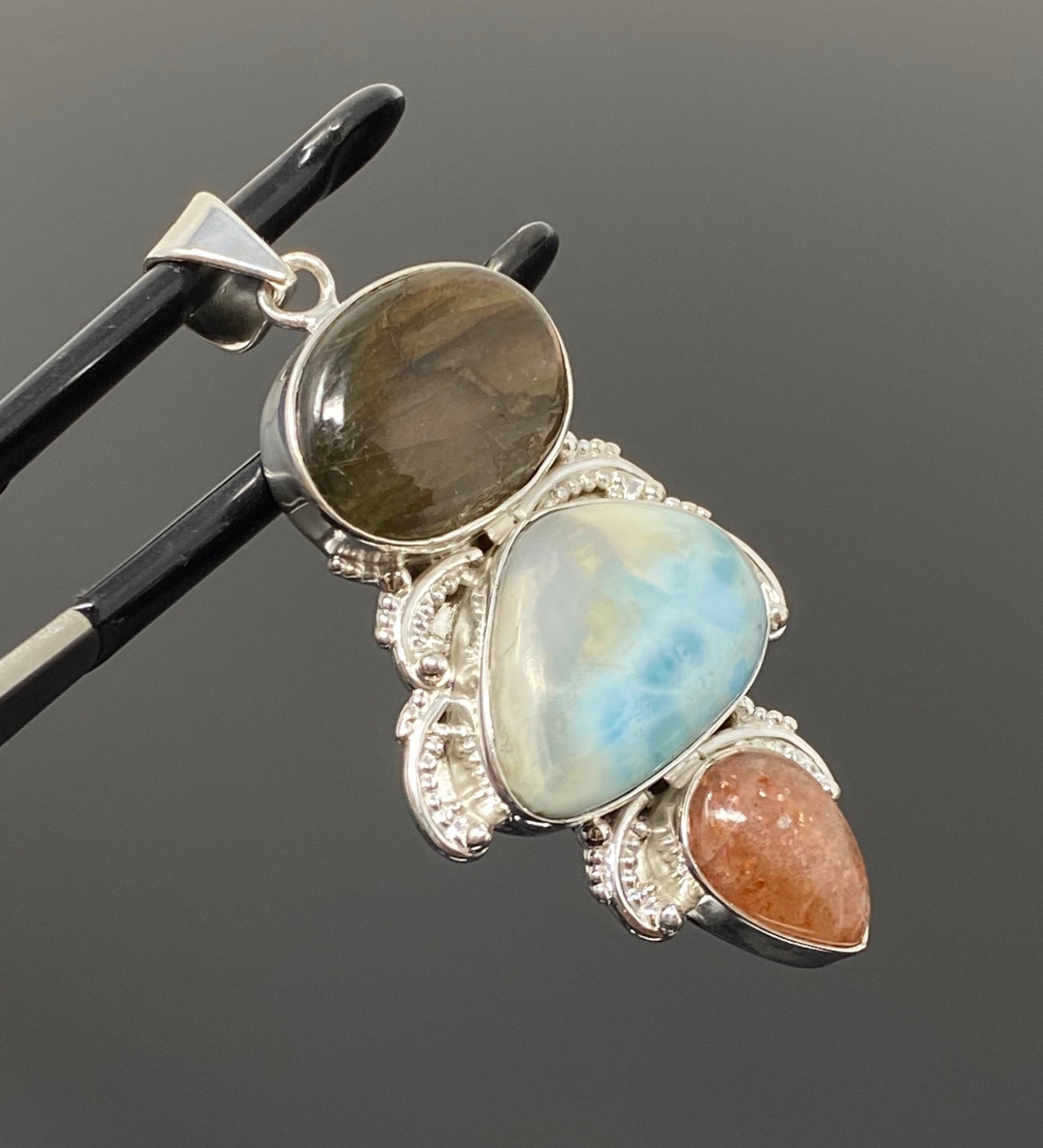 Larimar, Sunstone and Labradorite Gemstone Sterling Silver Wire Wrapped Pendant Jewelry at Wholesale Price.