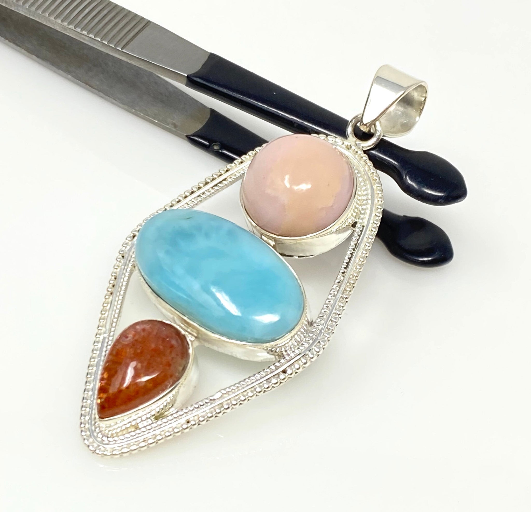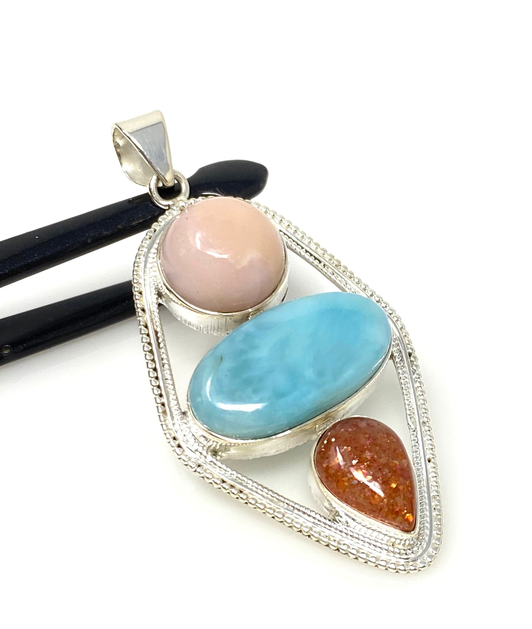 Larimar, Sunstone and Pink Opal Gemstone Sterling Silver Wire Wrapped Pendant Jewelry at Wholesale Price.