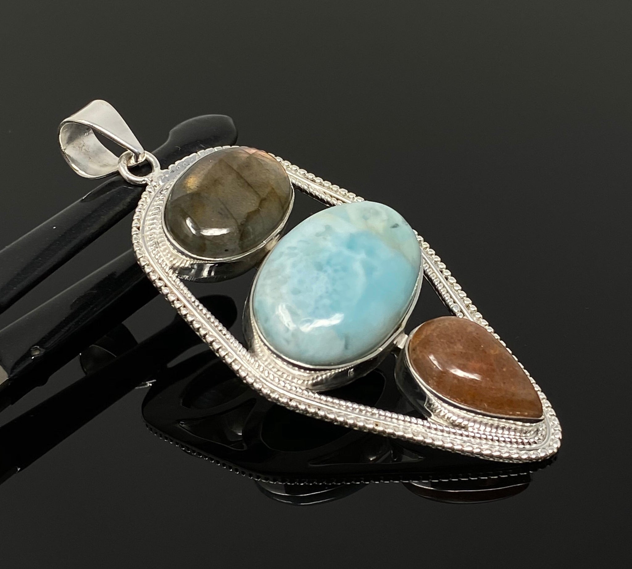Larimar, Sunstone and Labradorite Gemstone Sterling Silver Wire Wrapped Pendant Jewelry at Wholesale Price.