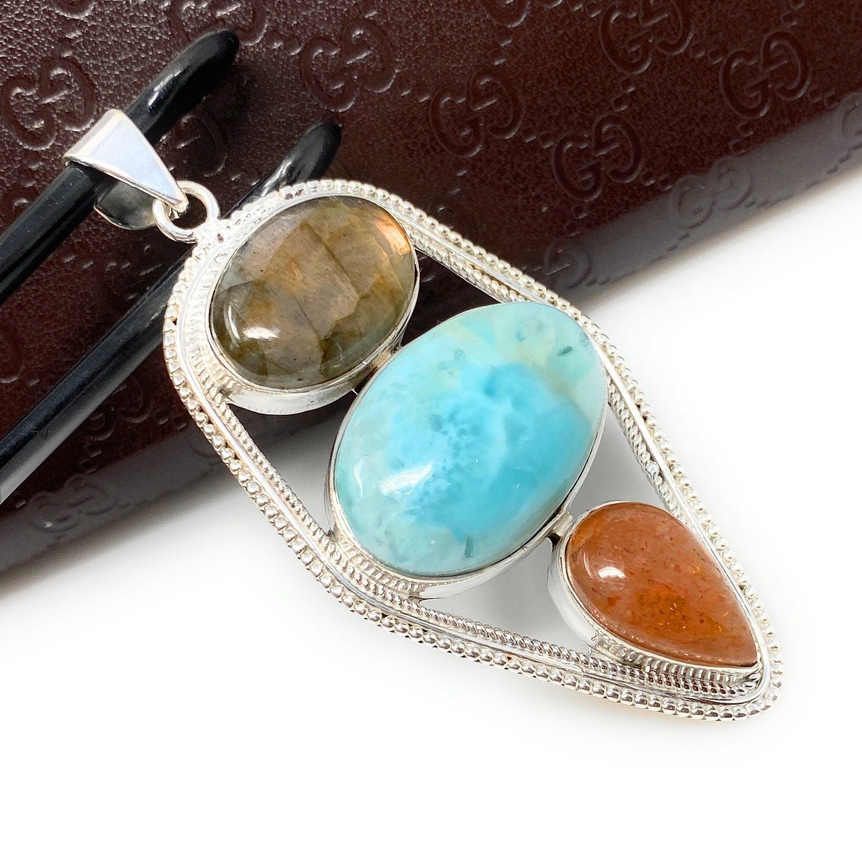This beautiful Handmade Natural Sunstone, Natural Labradorite and Natural Dominican Republic Larimar 925 Sterling Silver Pendant is made with the wire wrapped design which makes the pendant unique and designer and is an excellent choice for any occasion and makes a great gift for the loved ones.