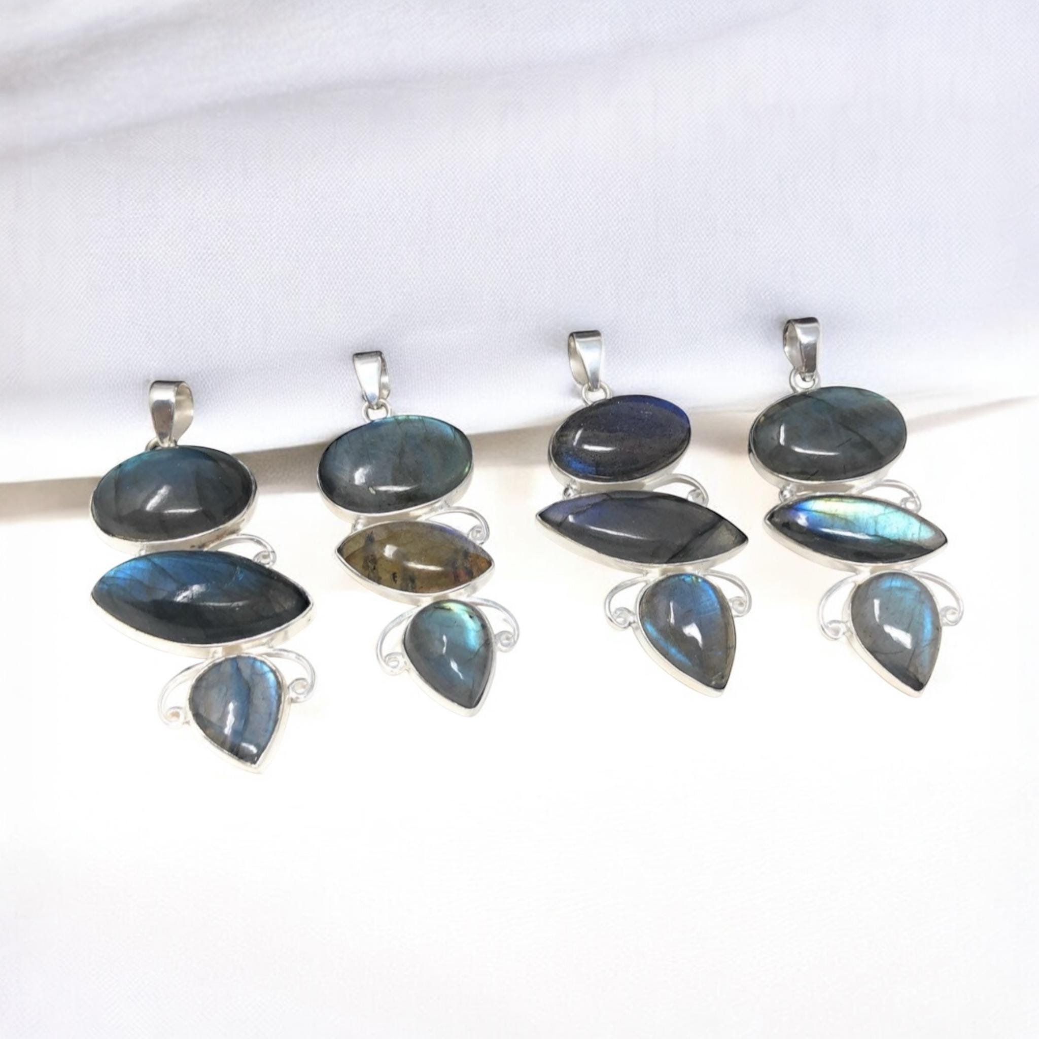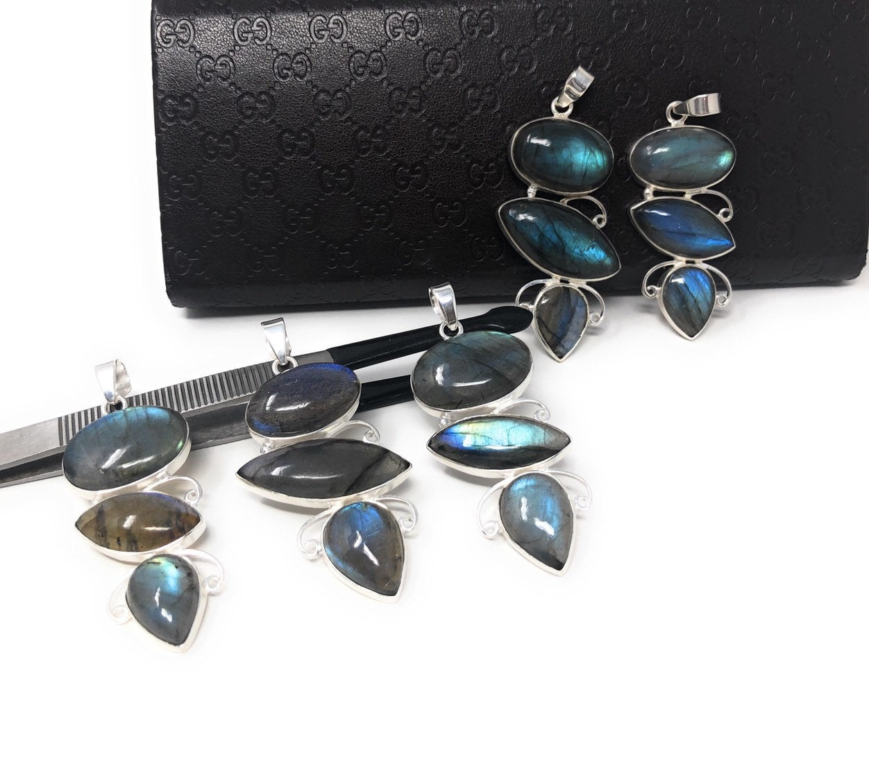 This beautiful Handmade Natural Labradorite Blue and Green Flash 925 Sterling Silver Pendant is made with using 3 different shapes of Labradorite Cabochon and bezel set in designer pattern in Sterling silver in wire wrapped design.