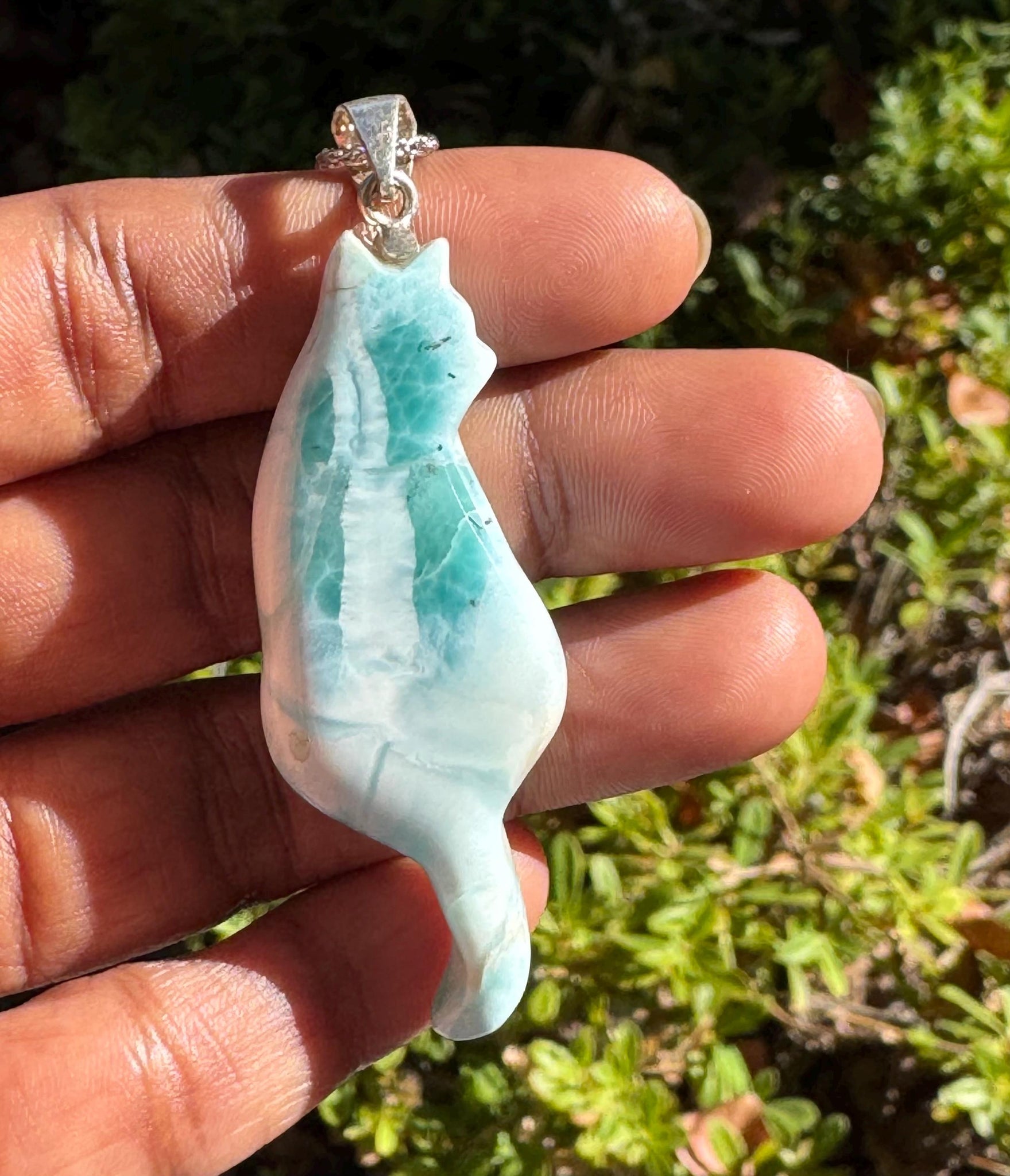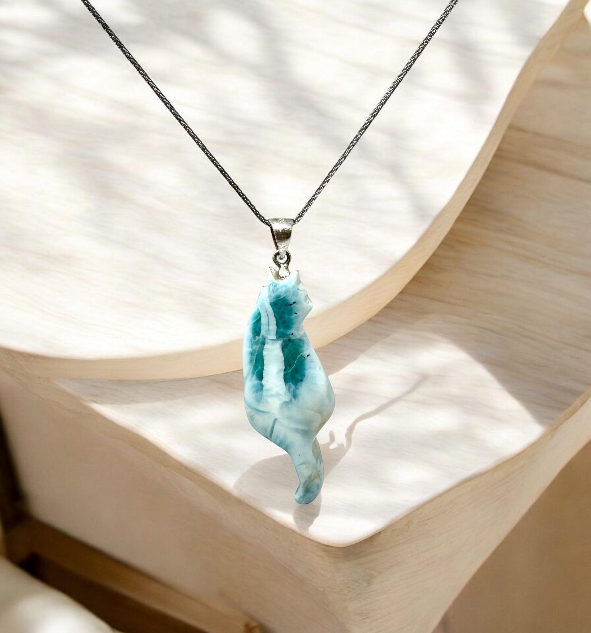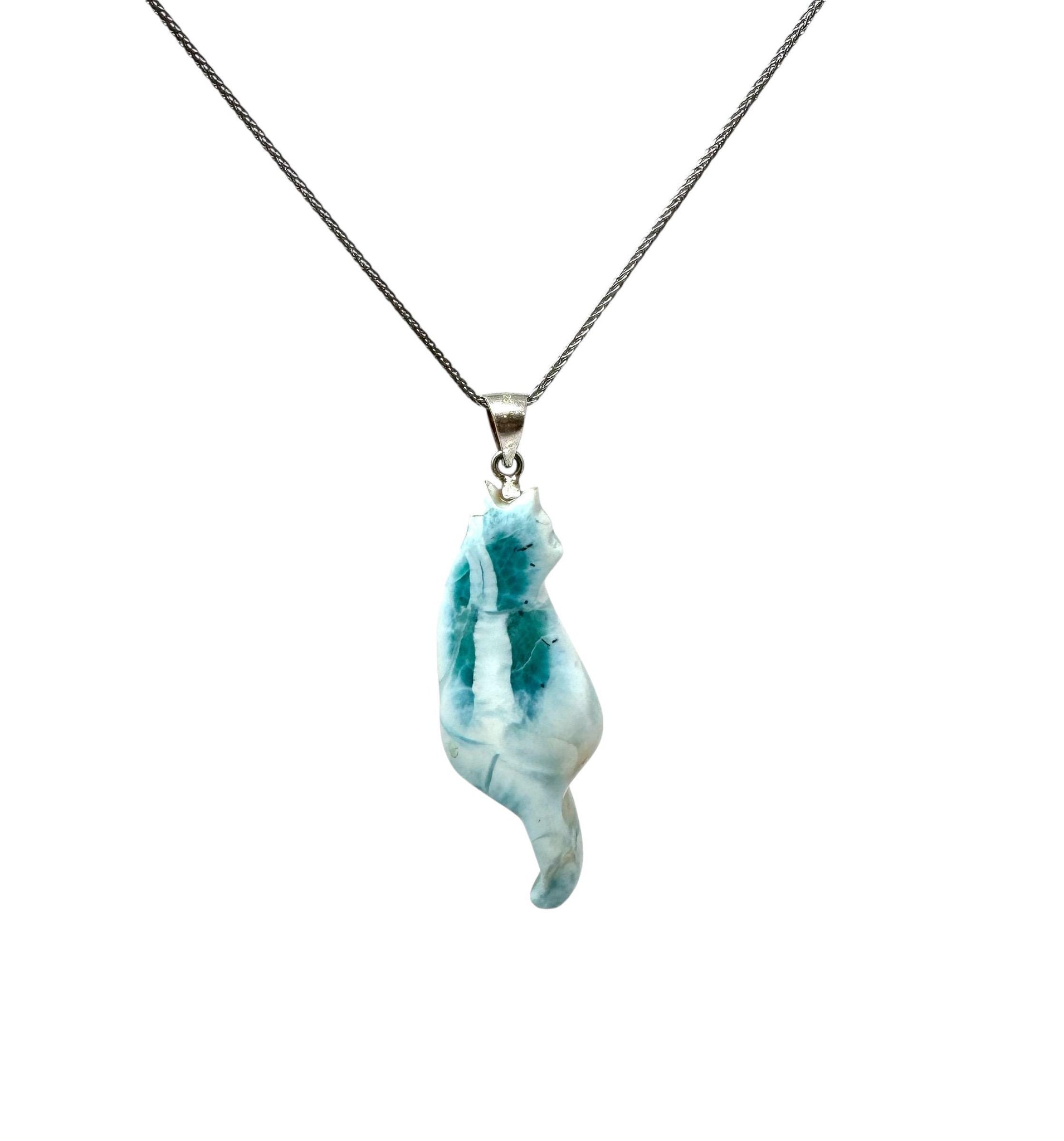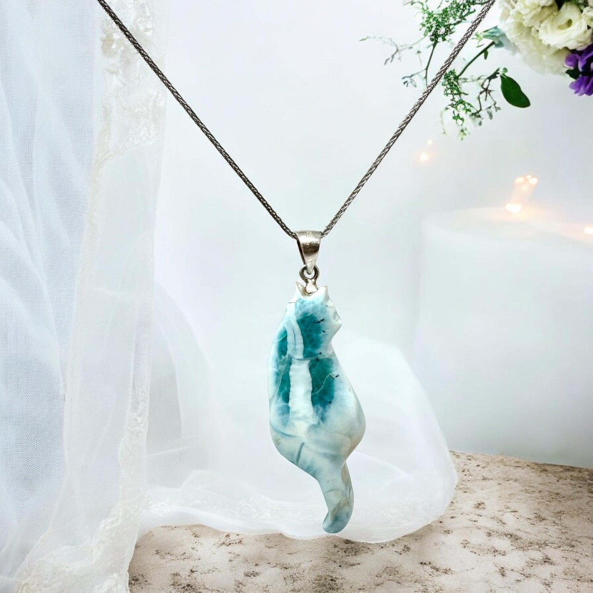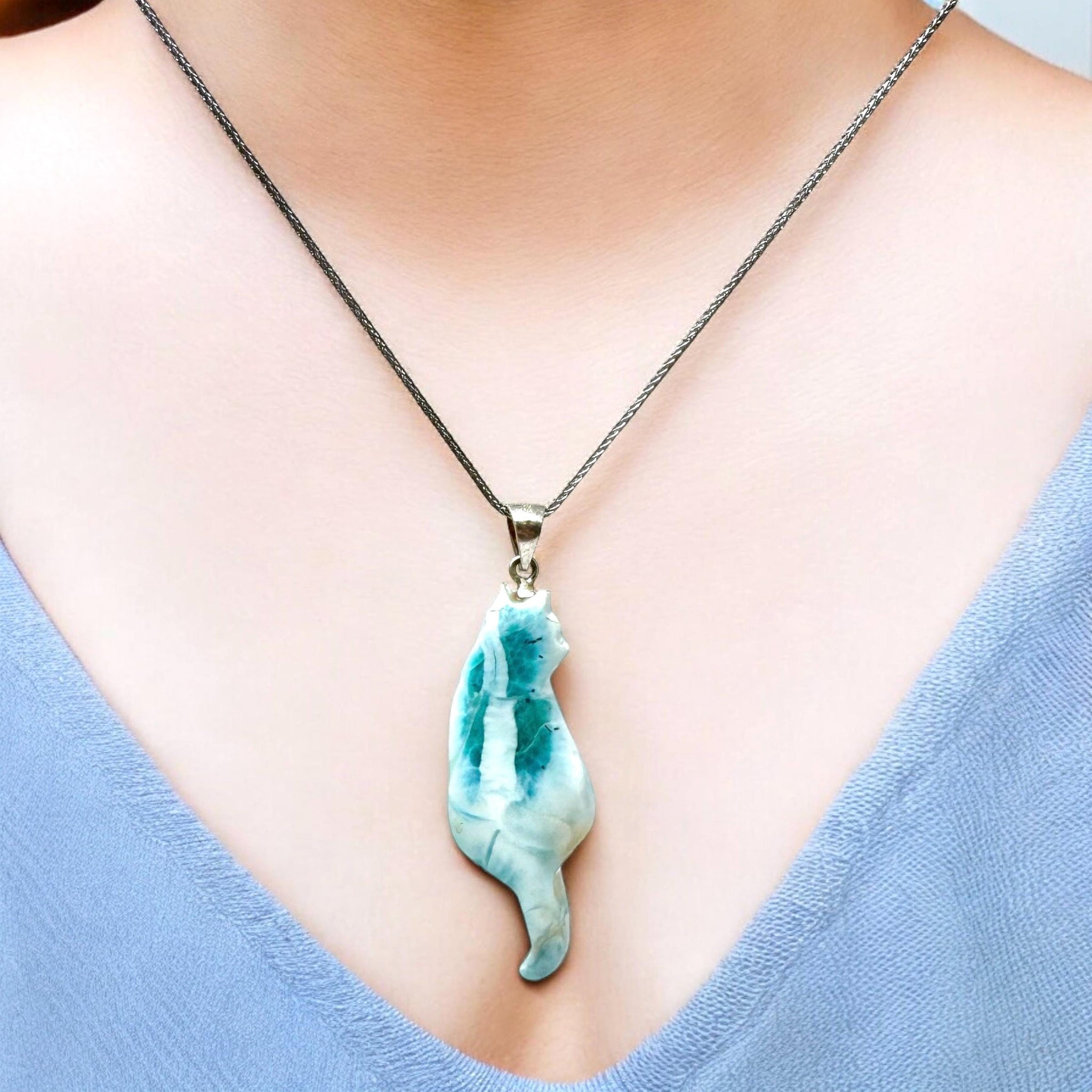 Larimar Cat Pendant Necklace, Larimar Necklace, Bohemian Jewelry, Dominican Republic Larimar Pendant Healing Stone Jewelry , 2.65” x0.75”