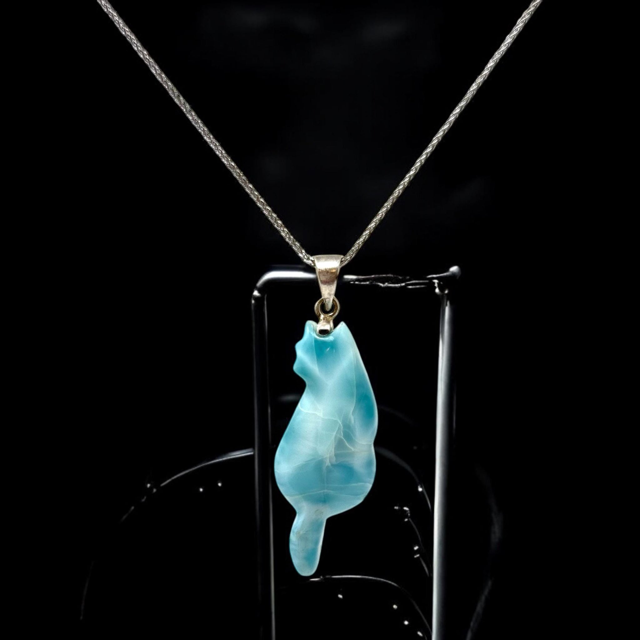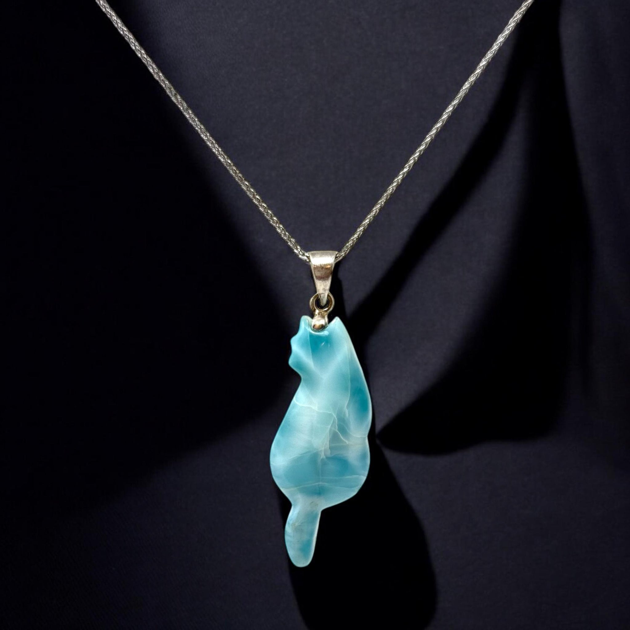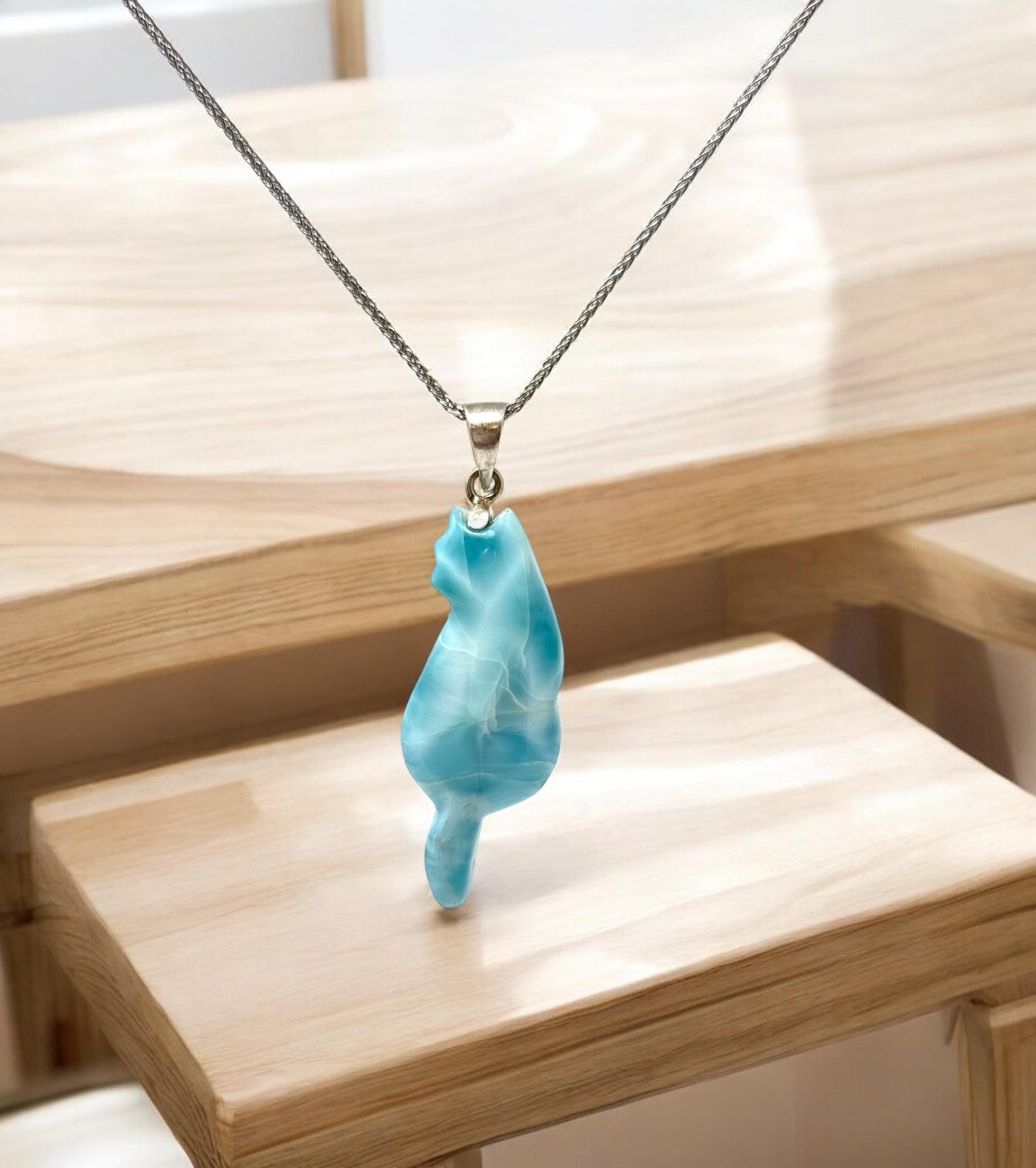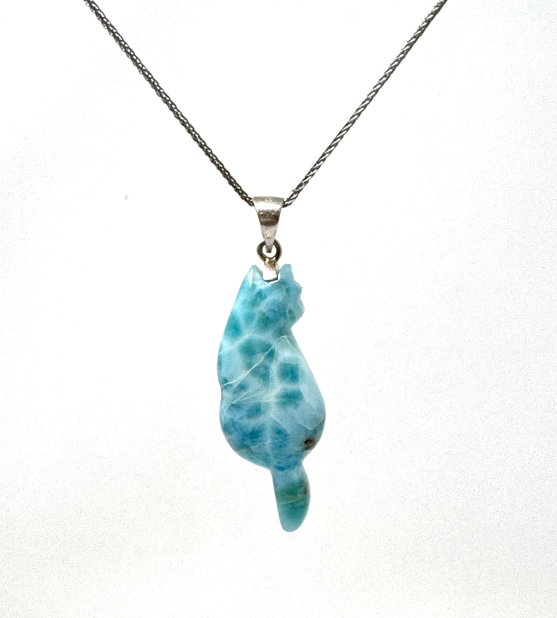 Larimar Cat Pendant Necklace, Larimar Necklace, Bohemian Jewelry, Dominican Republic Larimar Pendant Healing Stone Jewelry, 2.15” x 0.70”