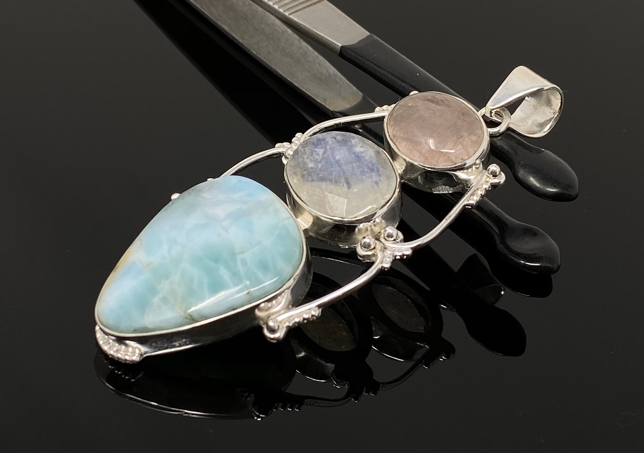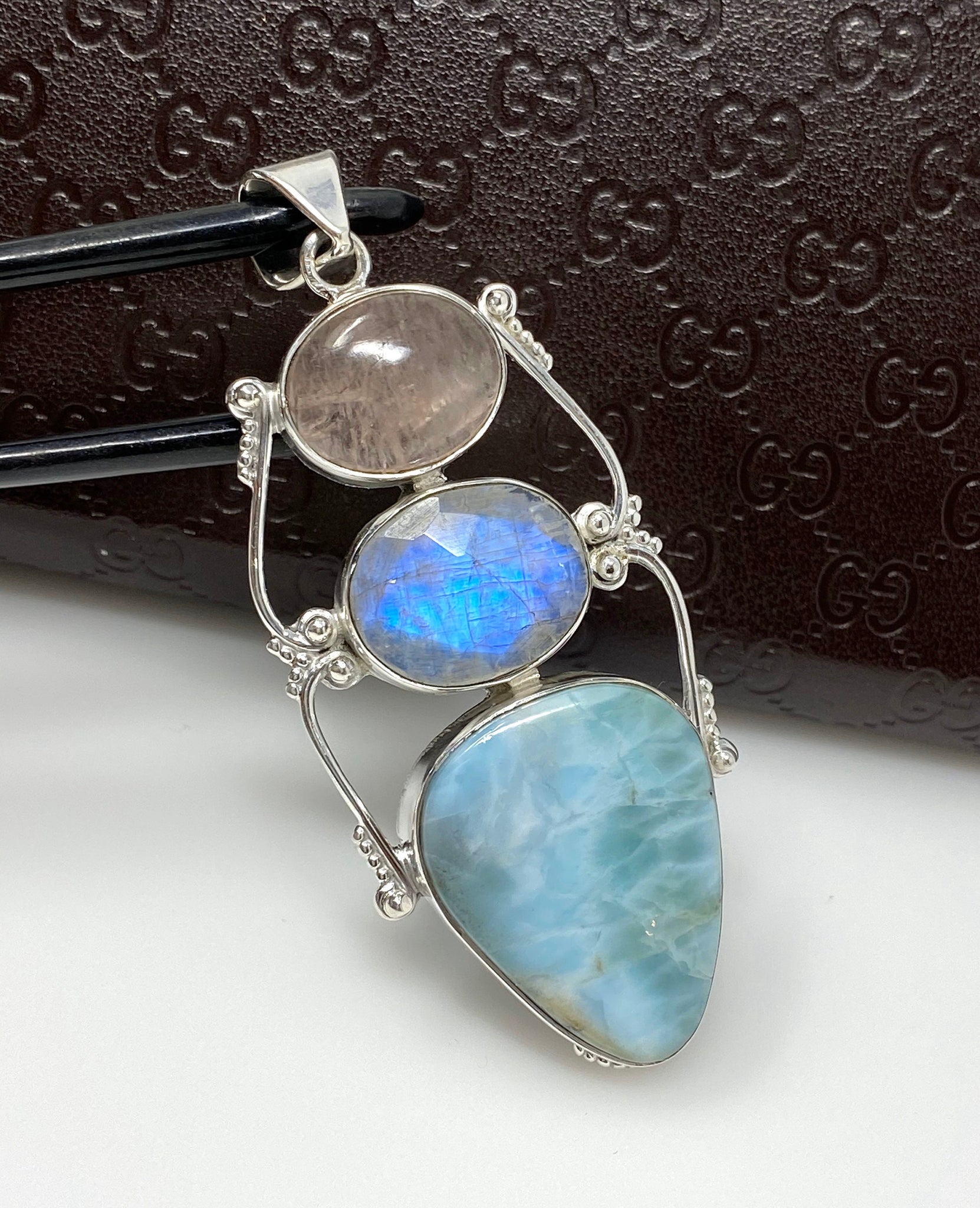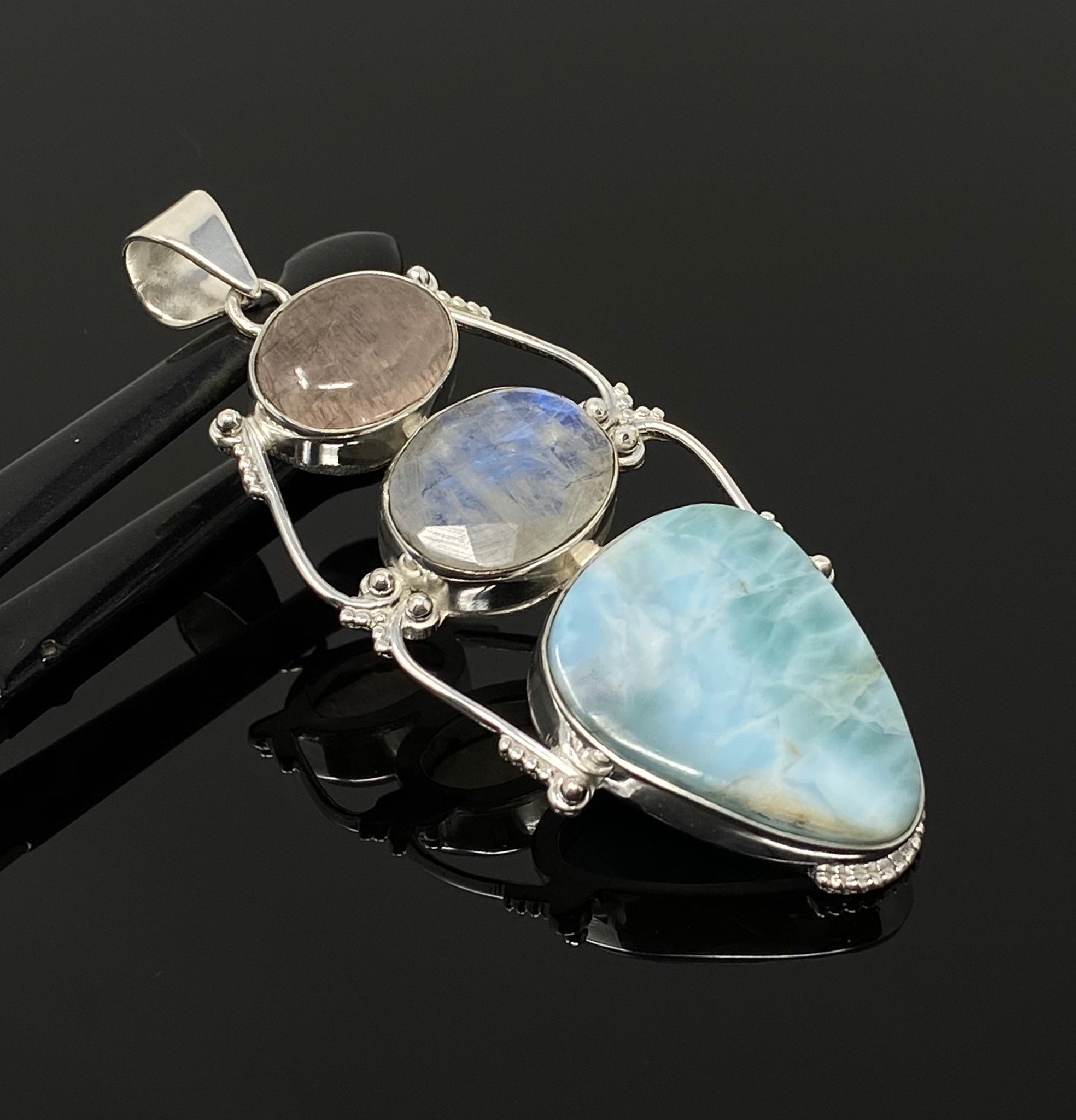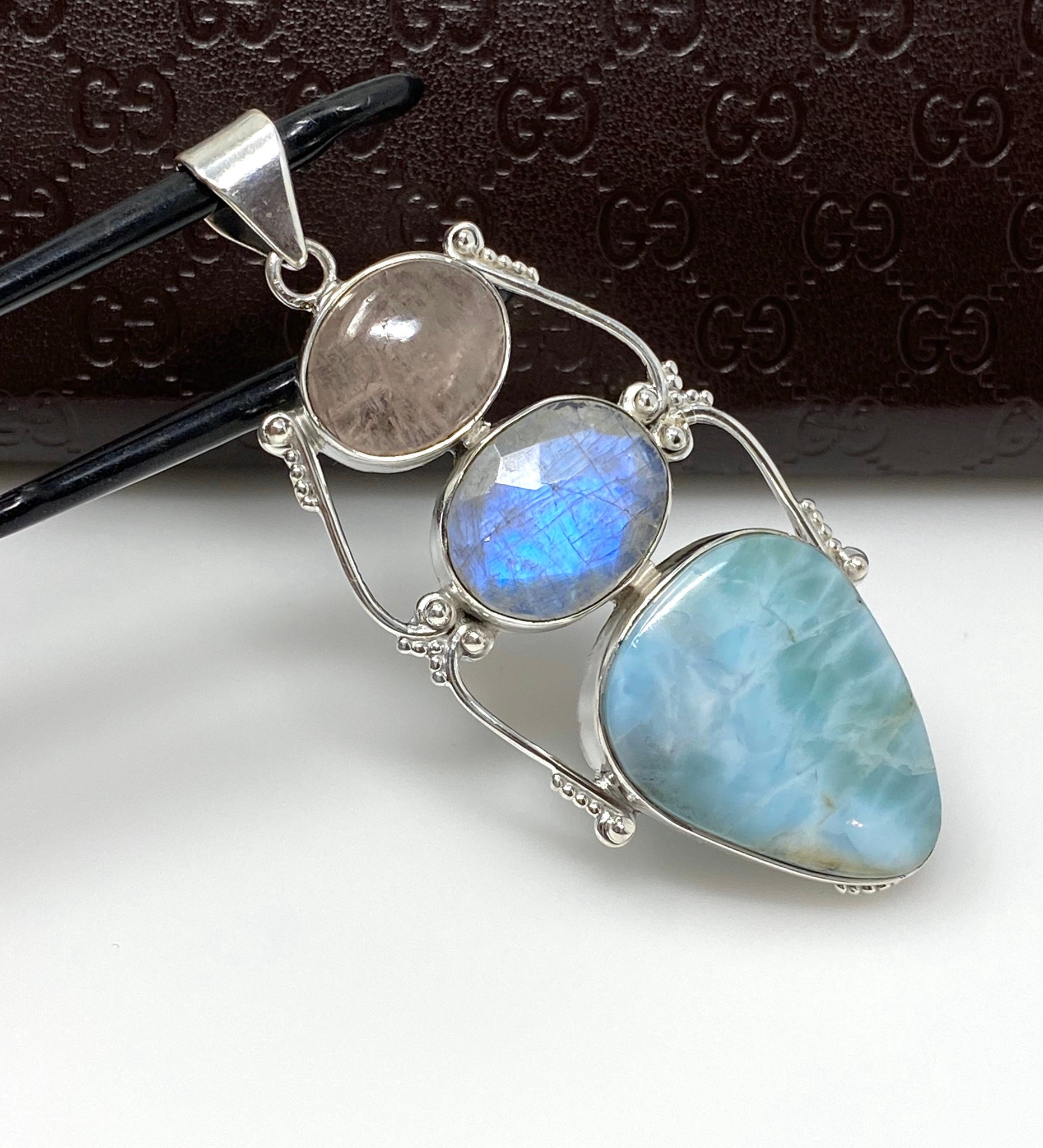 Larimar with Blue Flash Moonstone and Morganite Gemstone Sterling Silver Pendant Jewelry at Wholesale Price.