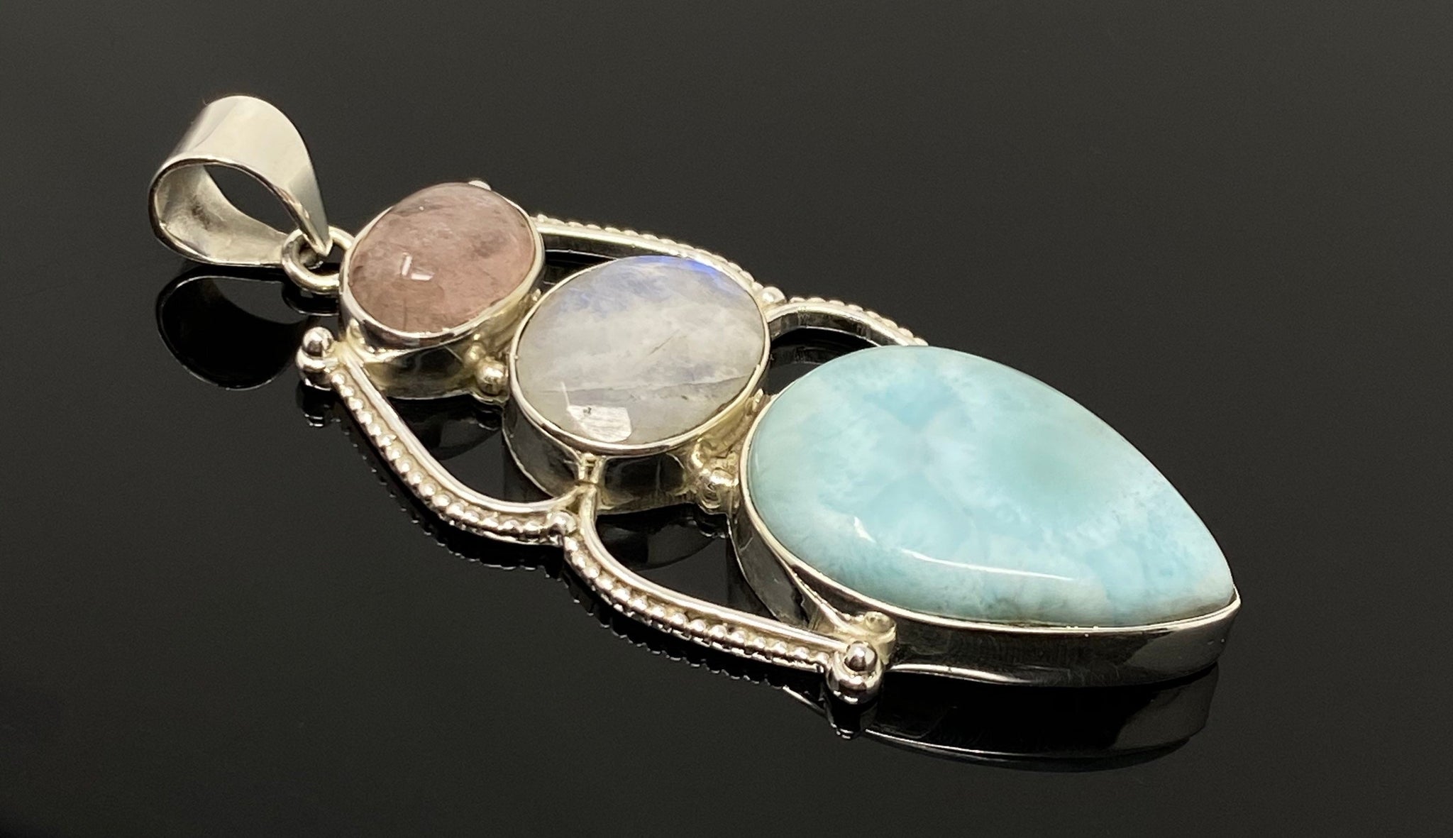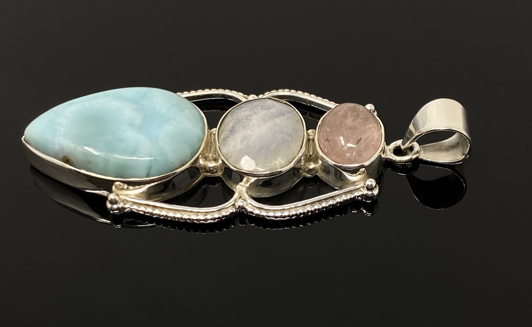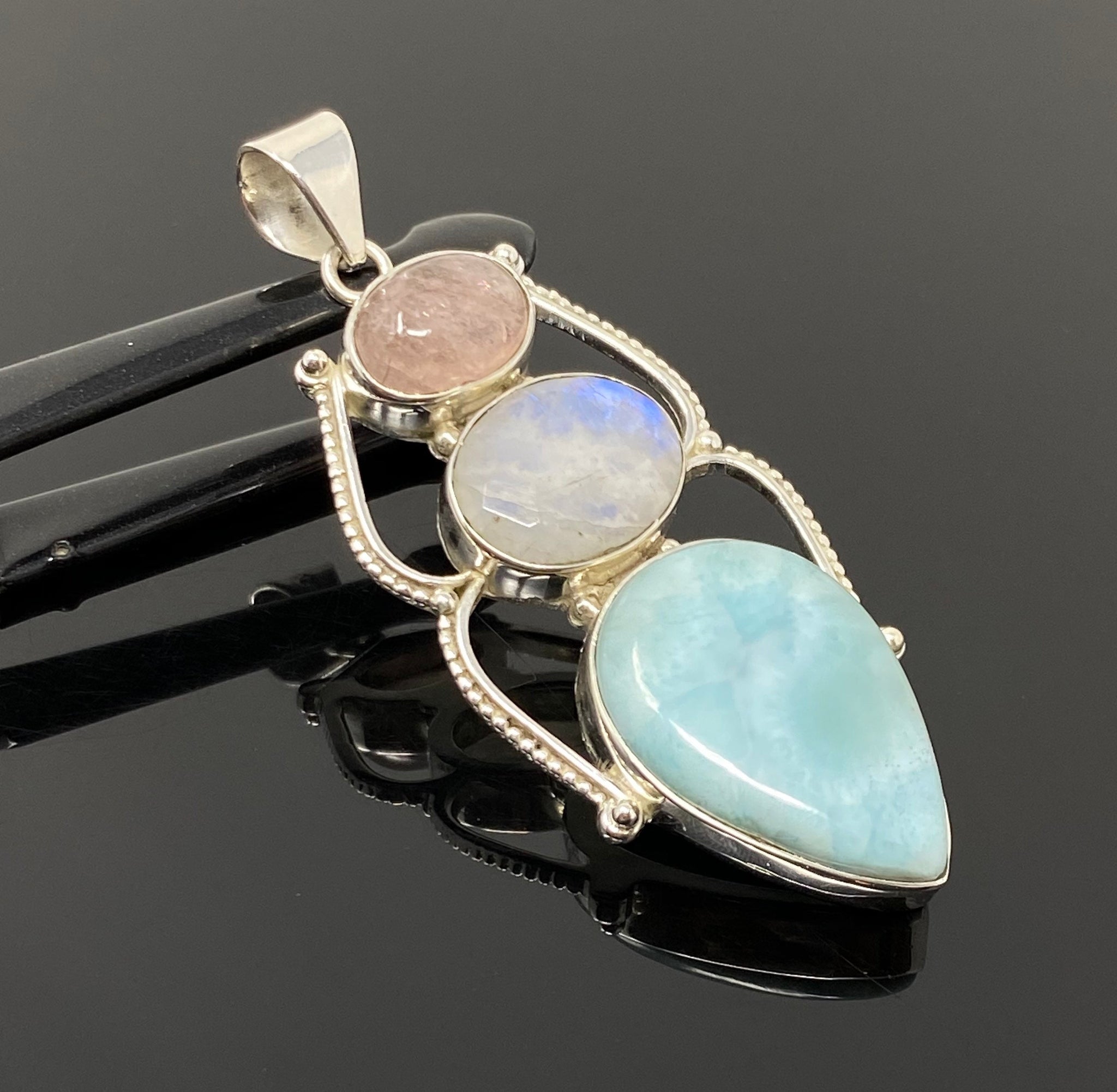 Larimar with Blue Flash Moonstone and Morganite Gemstone Sterling Silver Pendant Jewelry at Wholesale Price.