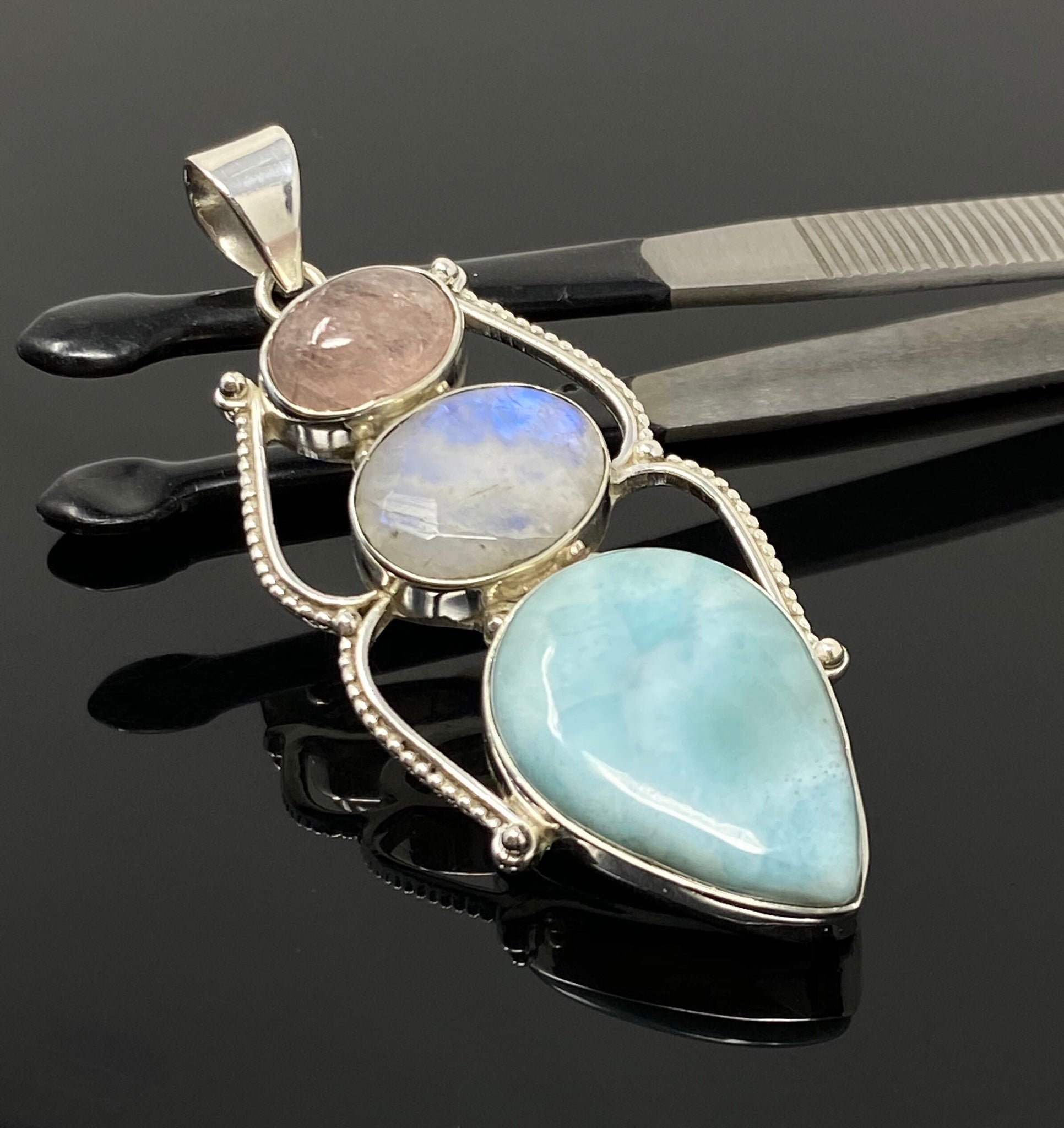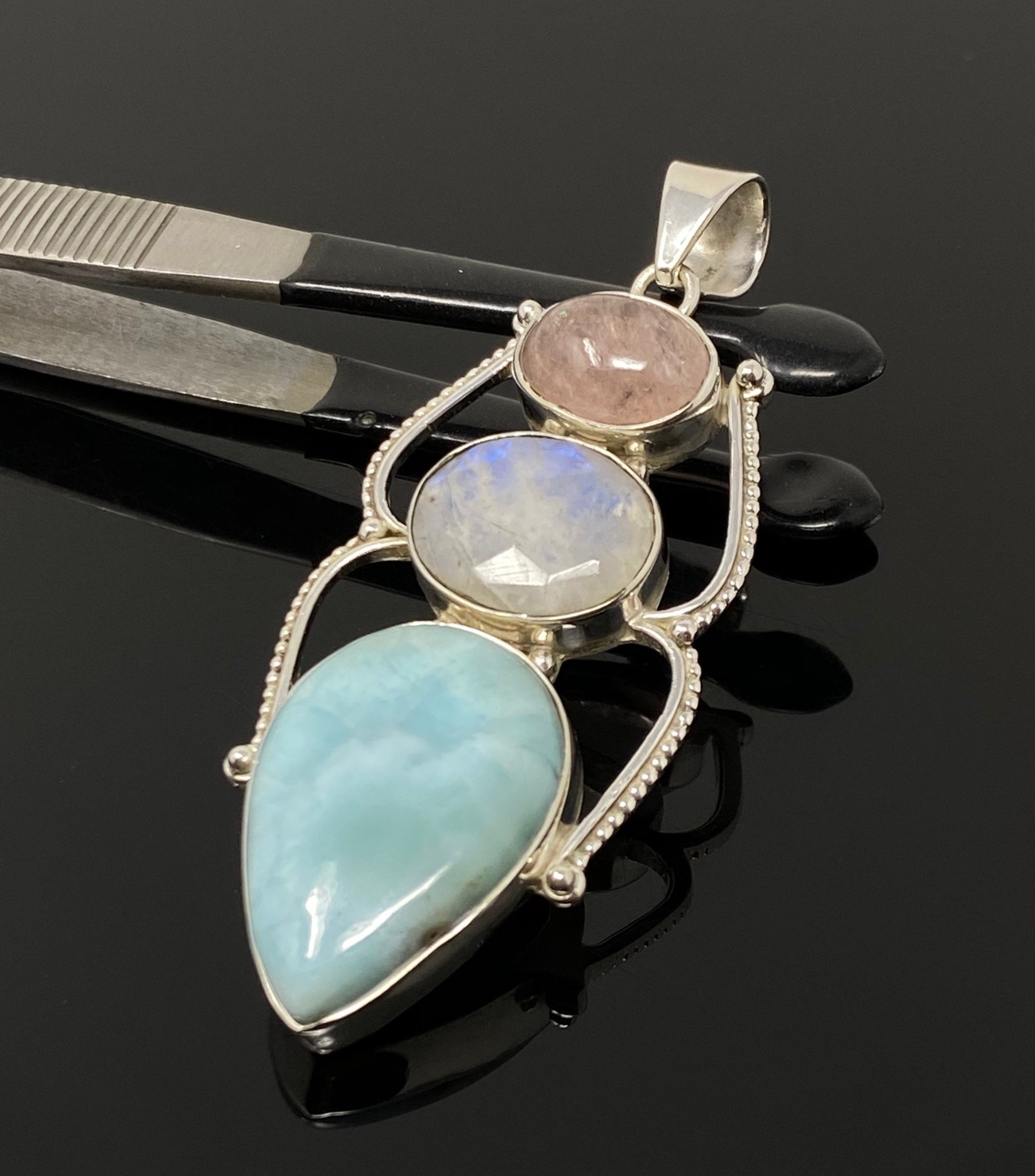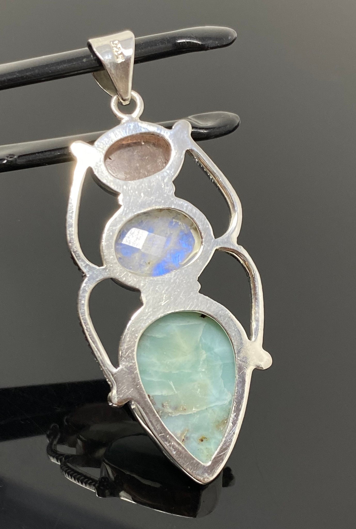 Larimar with Blue Flash Moonstone and Morganite Gemstone Sterling Silver Pendant Jewelry at Wholesale Price.