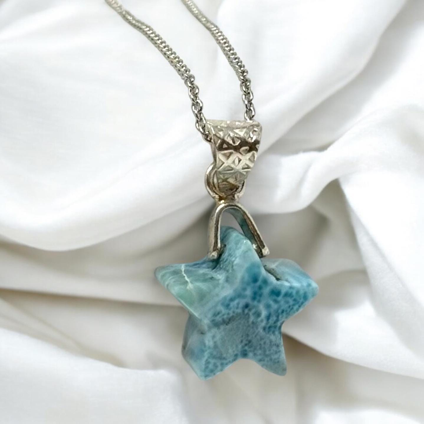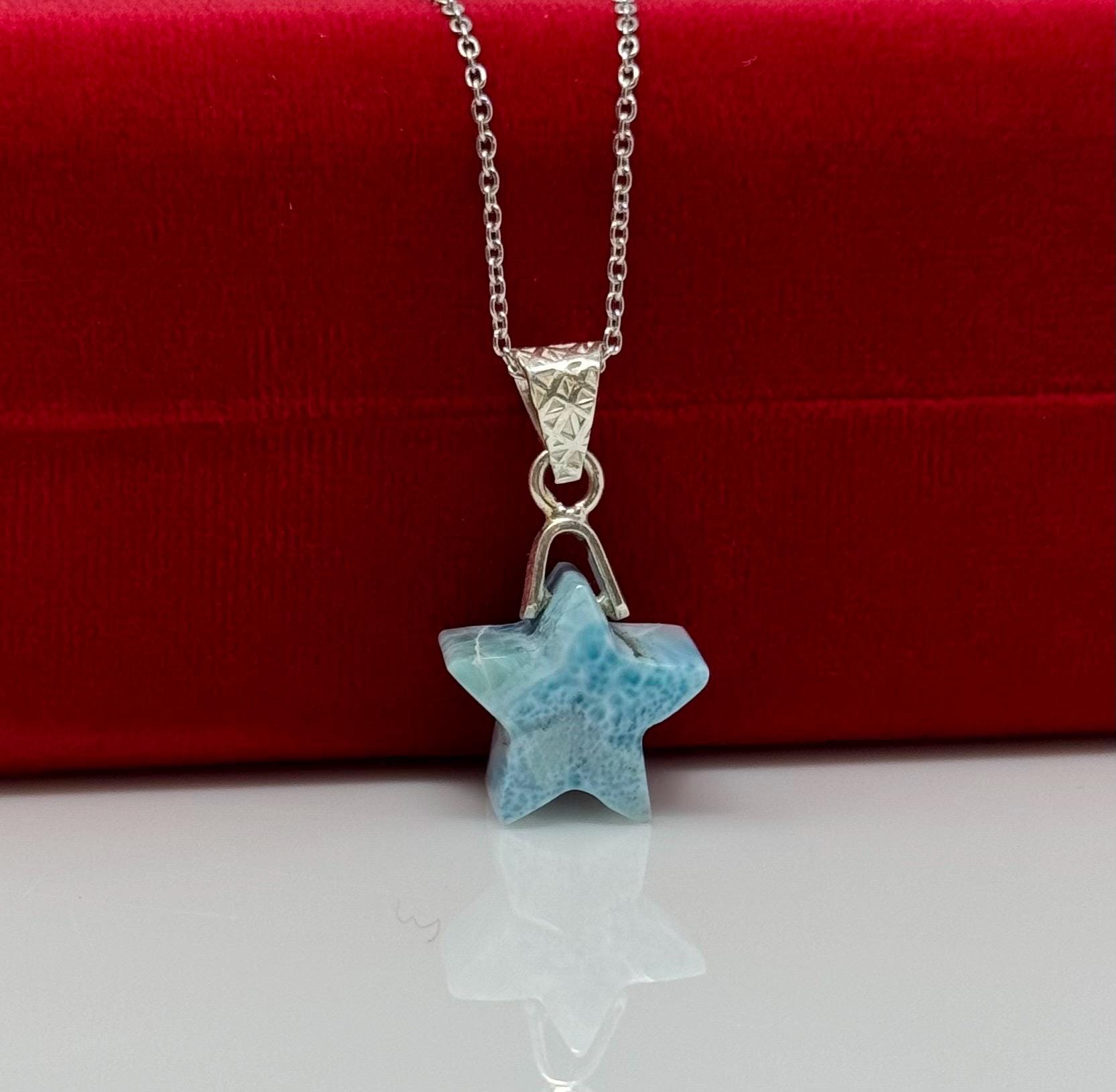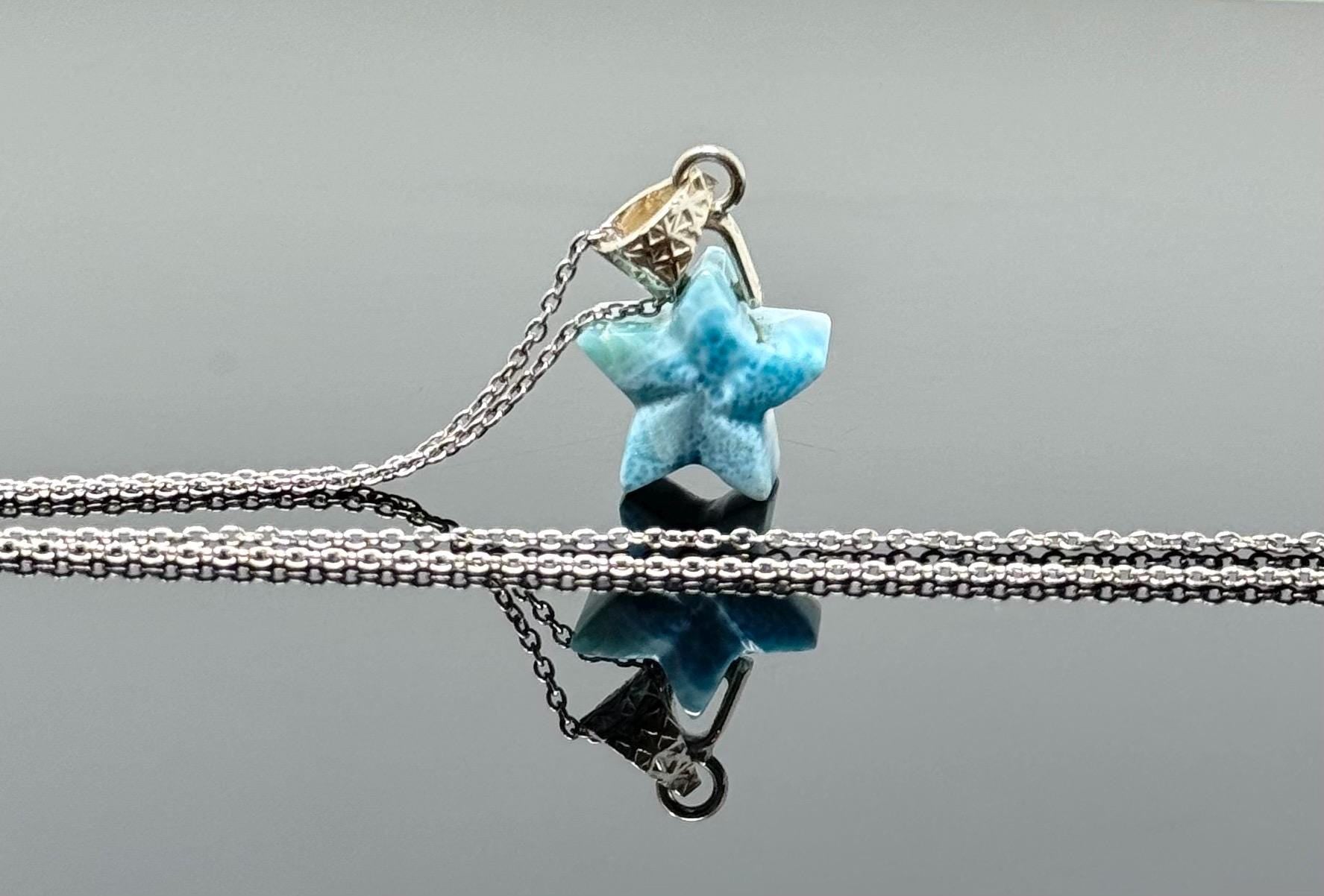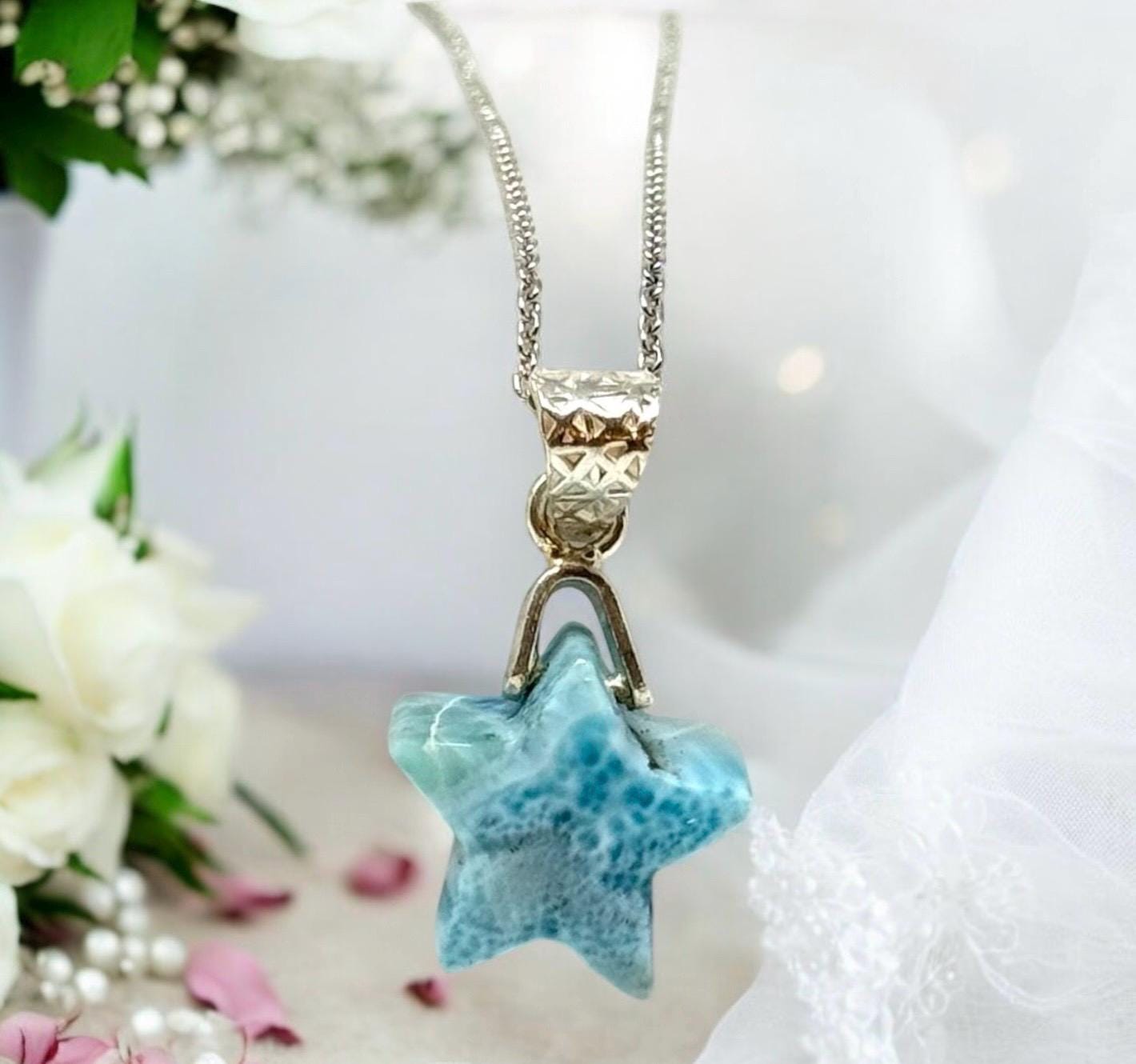 Larimar Necklace, Atlantis Healing Stone Necklace, Silver Bohemian Jewelry, Dominican Republic Larimar Star Jewelry Gifts, 1.25”x0.65”