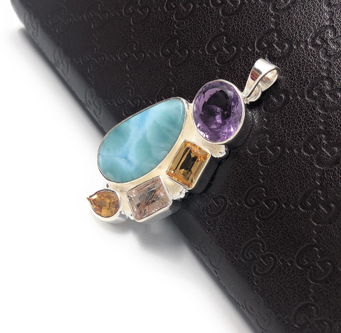 This Beautiful Handmade 925 Sterling Silver Designer Large Pendant is made with using Larimar, Citrine , Golden Rutile and Amethyst and is an excellent choice for any occasion and makes a great gift for the loved ones.