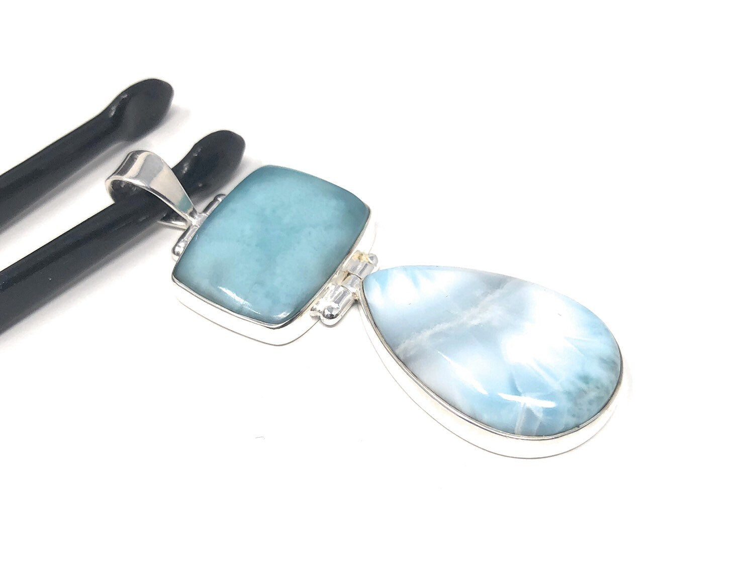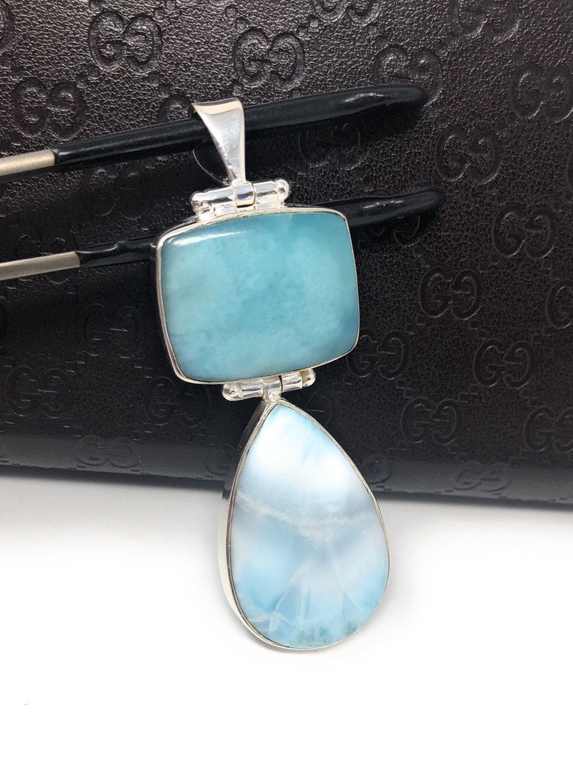 This beautiful Handmade AAA Grade Natural Larimar Gemstone 925 Sterling Silver Large Pendant is made with exclusive design by attaching two pieces of Larimar Gemstone using a hinge pattern to give the pendant flexibility and is an excellent choice for any occasion and makes a great gift for the loved ones.