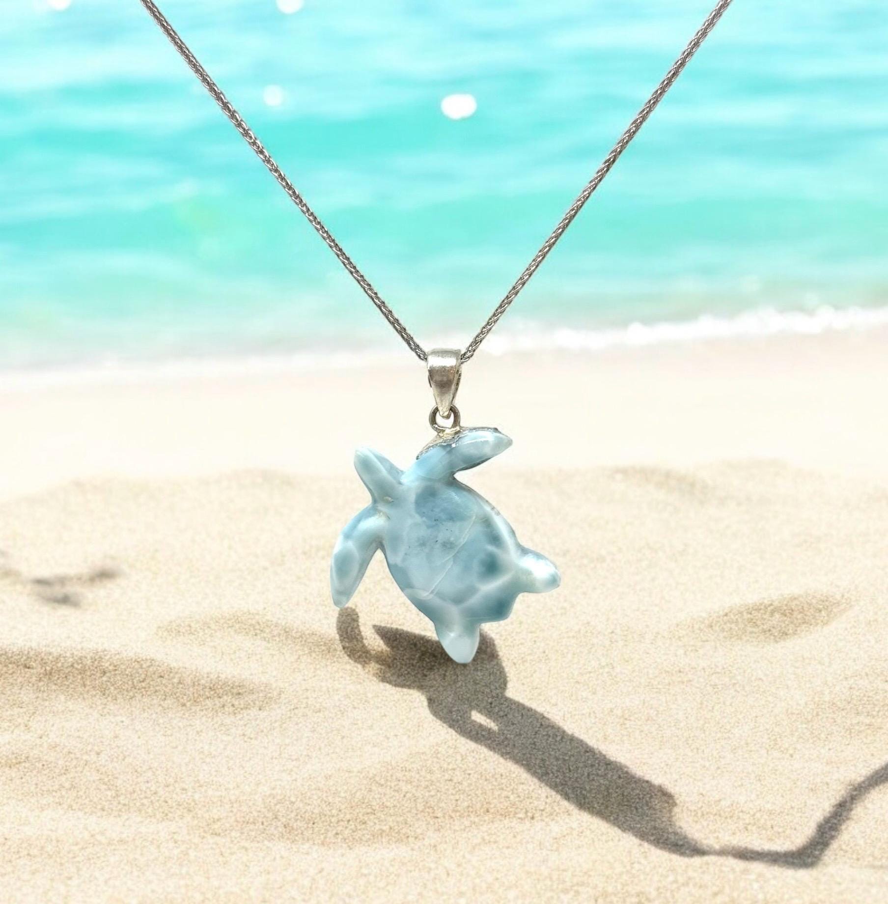 Larimar Sea Turtle Tortoise Pendant Necklace , Silver Bohemian Jewelry, Dominican Republic Larimar Necklace Gifts for Her, 1.75"x 1.25”