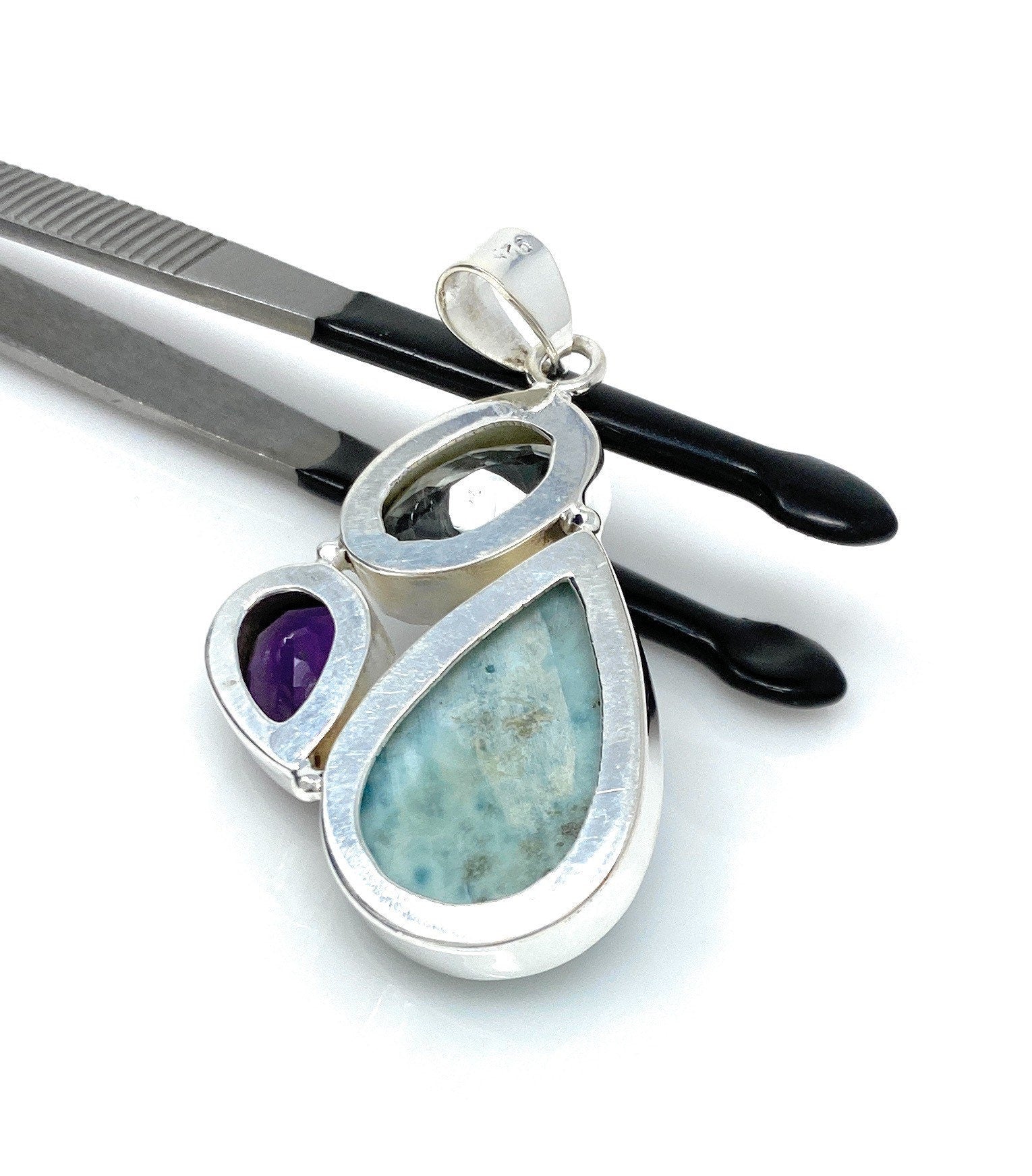 Natural Gemstone Pendant - Larimar, Amethyst and Prasiolite, Sterling Silver Jewelry, Bohemian Jewelry