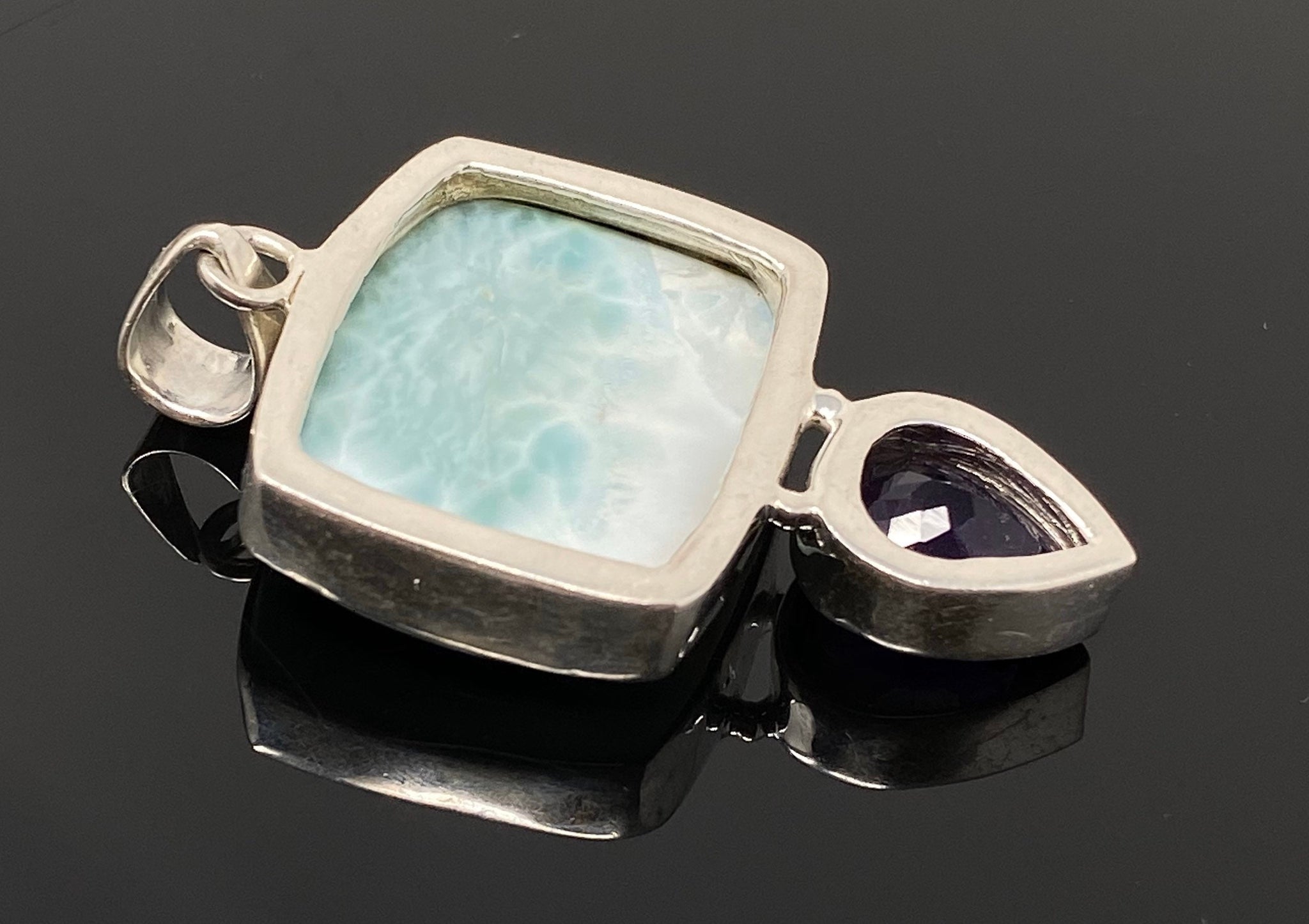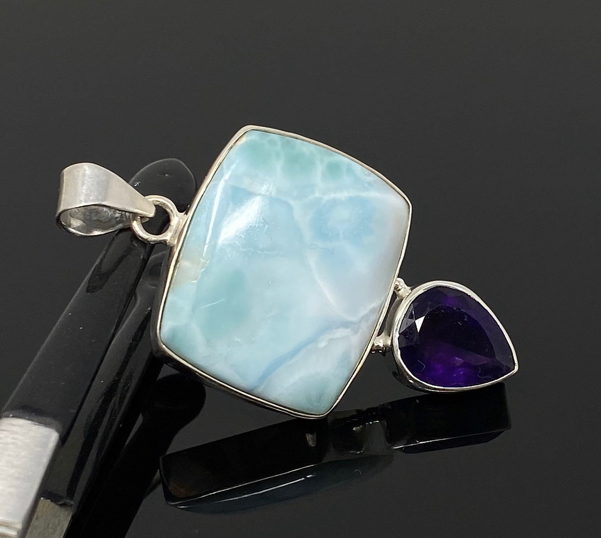 This Beautiful Handmade 925 Sterling Silver Designer Large Pendant is made with using Smooth Larimar Cabochon and Cut Stone Purple Amethyst and is an excellent choice for any occasion and makes a great gift for the loved ones.