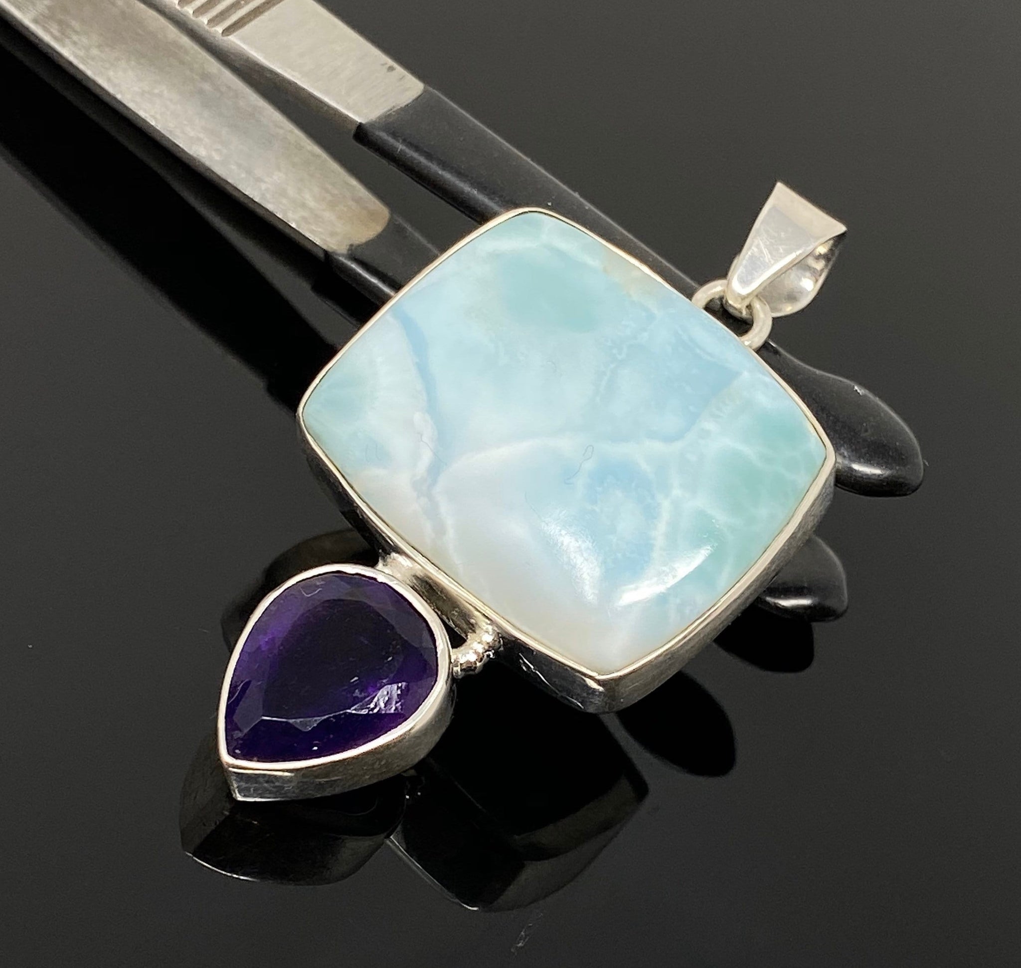 Natural Larimar and Amethyst Gemstone Pendant, Sterling Silver Jewelry, Larimar Pendant, Amethyst Pendant, Bohemian Jewelry