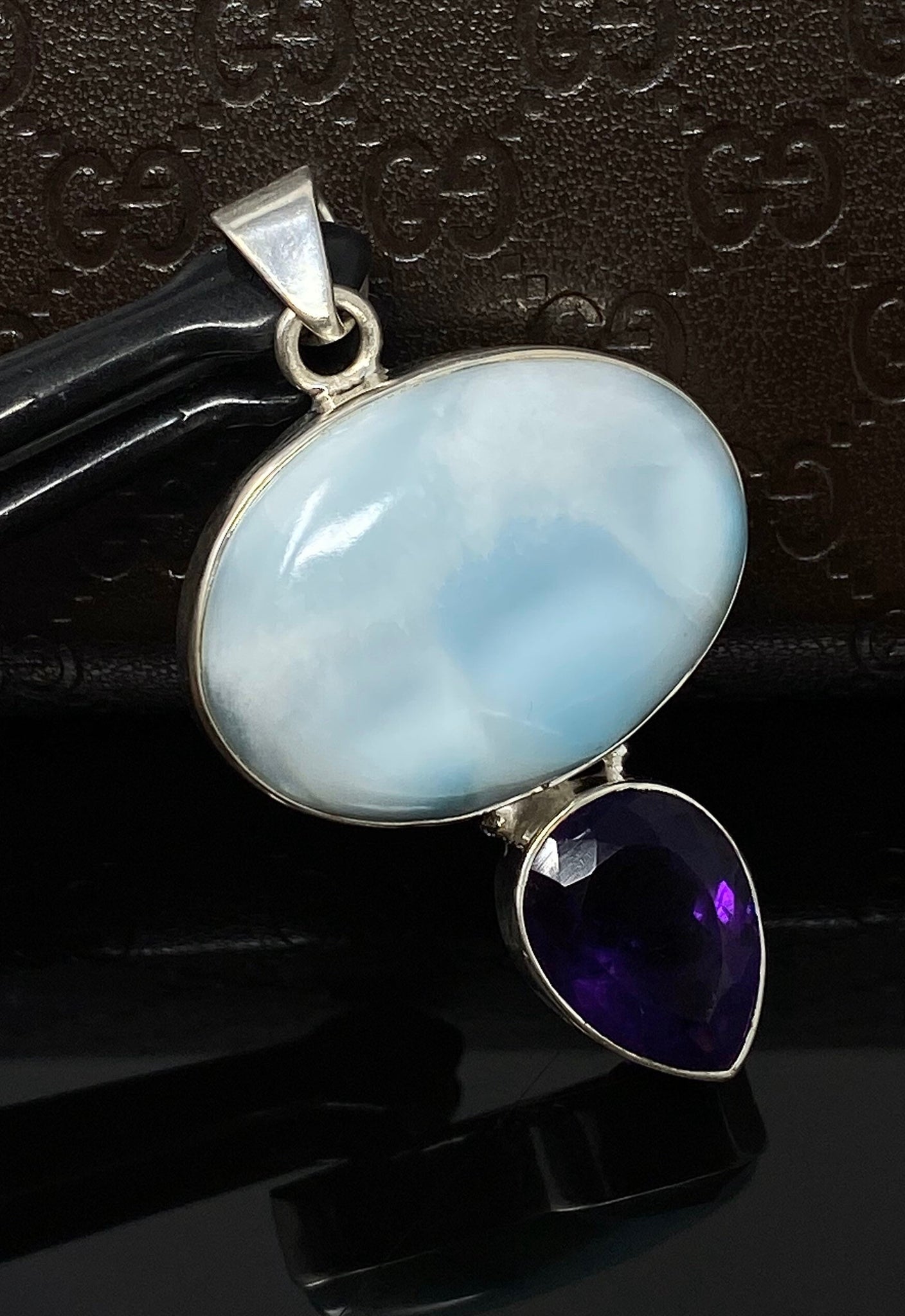 This Beautiful Handmade 925 Sterling Silver Designer Large Pendant is made with using Smooth Larimar Cabochon and Cut Stone Purple Amethyst and is an excellent choice for any occasion and makes a great gift for the loved ones.