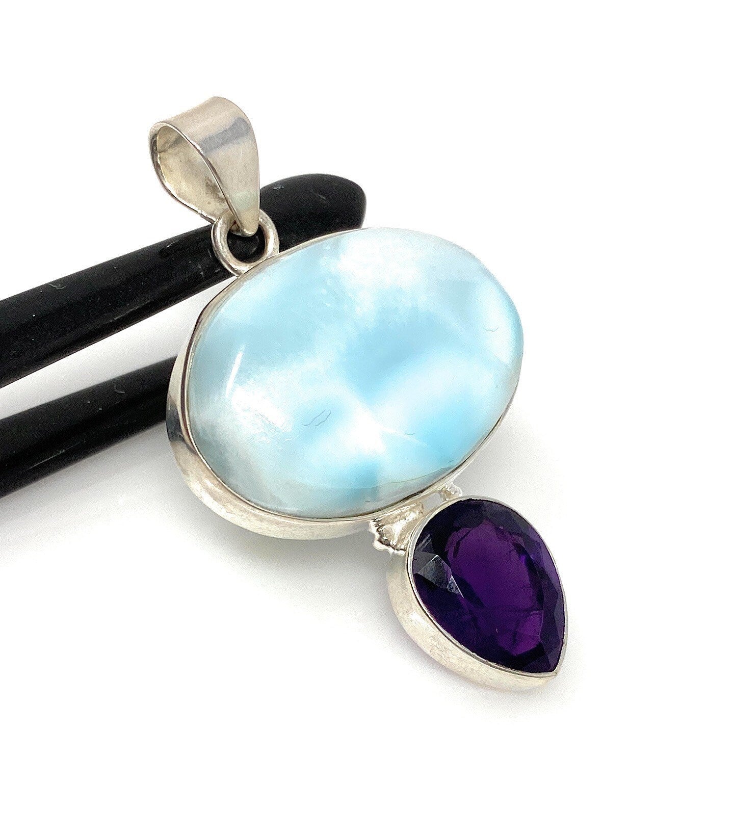 Natural Larimar and Amethyst Gemstone Pendant, Sterling Silver Jewelry, Larimar Pendant, Amethyst Pendant, Bohemian Jewelry