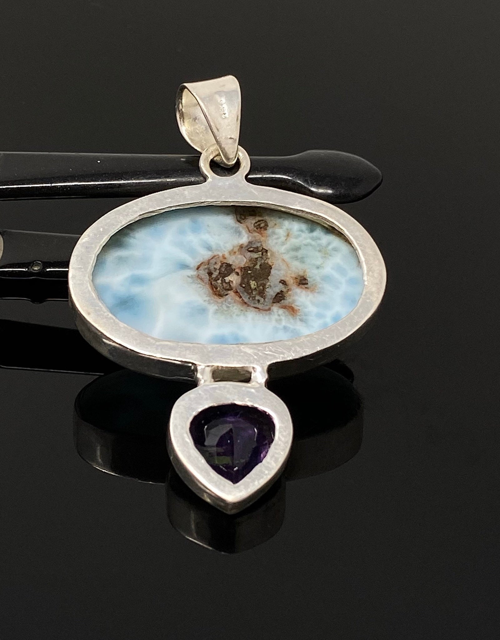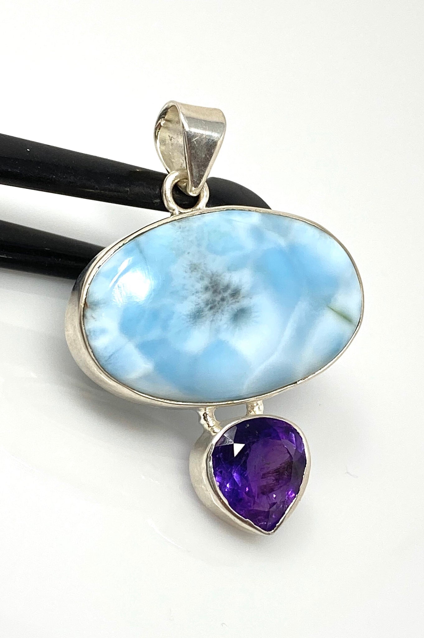 Natural Larimar and Amethyst Gemstone Pendant, Sterling Silver Jewelry, Larimar Pendant, Amethyst Pendant, Bohemian Jewelry