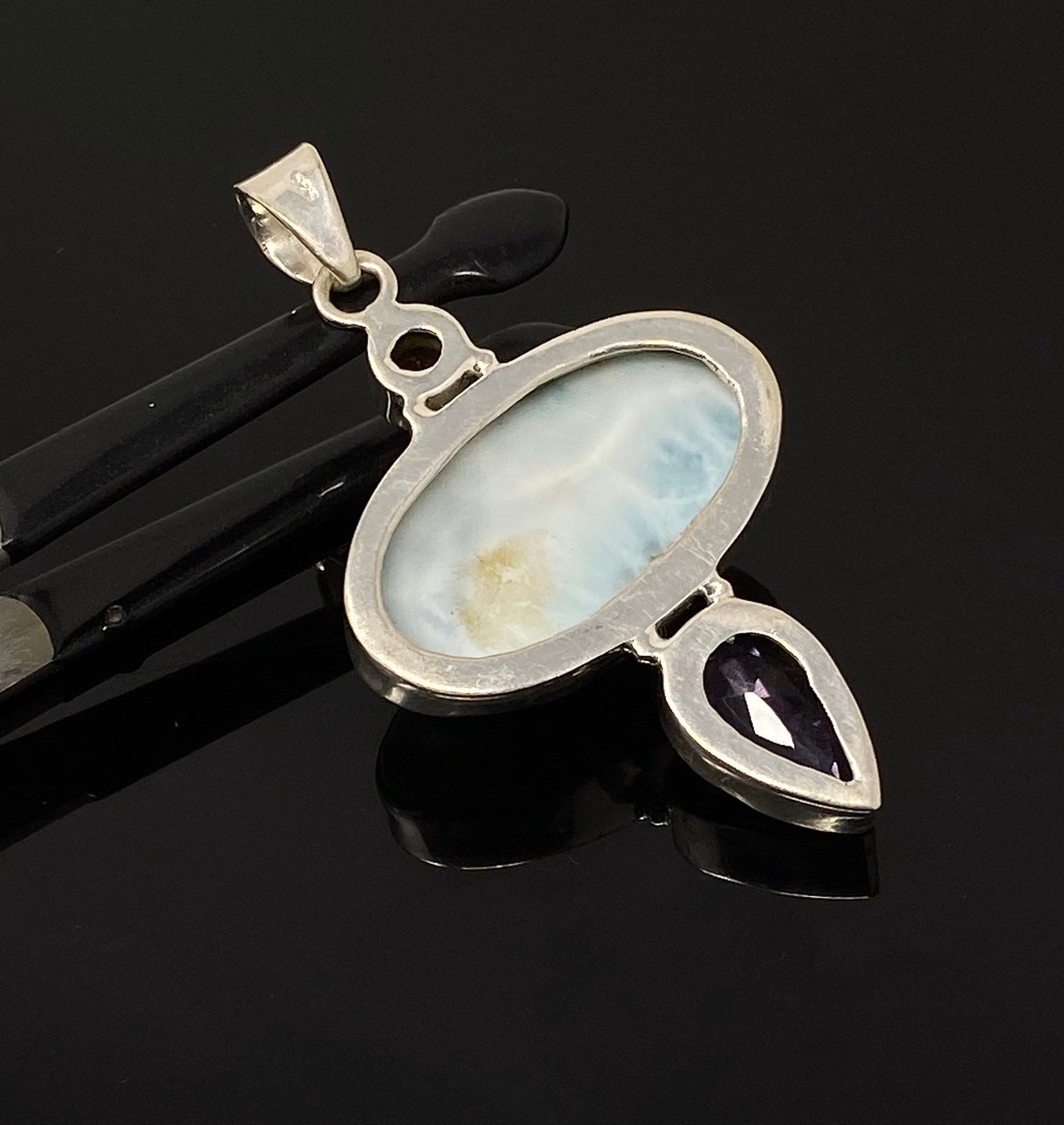This Beautiful Handmade 925 Sterling Silver Designer Large Pendant is made with using Smooth Larimar Cabochon, Cut Stone Garnet and Cut Stone Purple Amethyst and is an excellent choice for any occasion and makes a great gift for the loved ones.