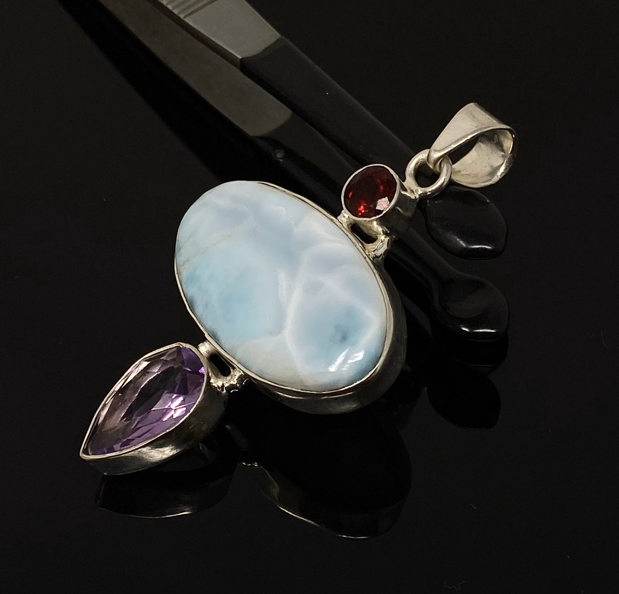 Natural Larimar, Garnet and Amethyst Gemstone Sterling Silver Pendant DIY Jewelry at Wholesale Price.