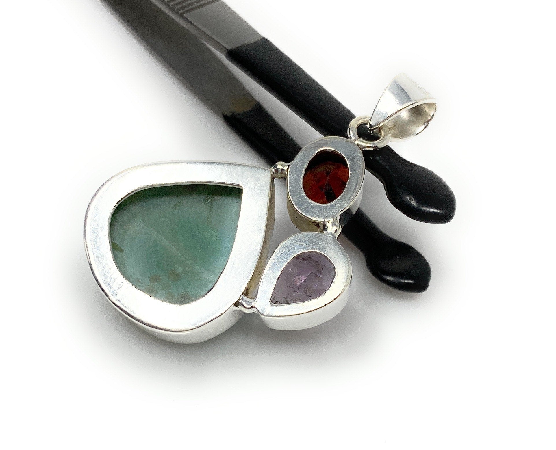 Natural Larimar, Garnet and Amethyst Gemstone Pendant, Sterling Silver Jewelry, Larimar Pendant, Amethyst Pendant, Bohemian Jewelry