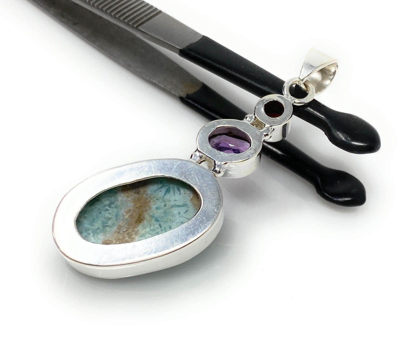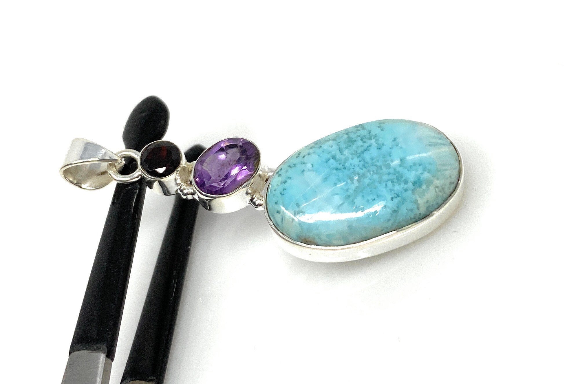 Natural Larimar, Garnet and Amethyst Gemstone Pendant, Sterling Silver Jewelry, Larimar Pendant, Amethyst Pendant, Bohemian Jewelry