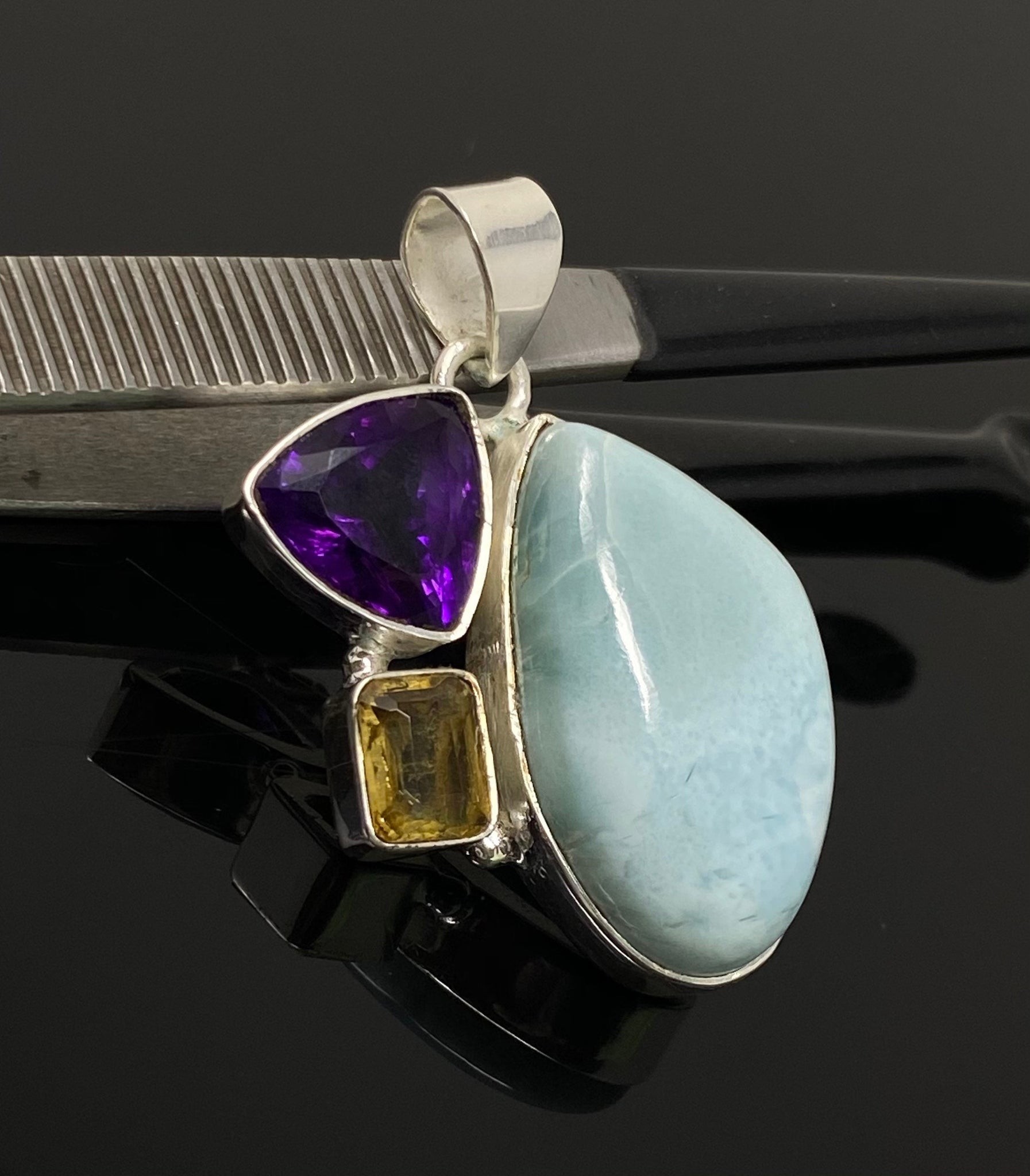 Natural Larimar with Amethyst and Citrine Gemstone Pendant, Sterling Silver Jewelry, Larimar Pendant, Amethyst Pendant, Bohemian Jewelry