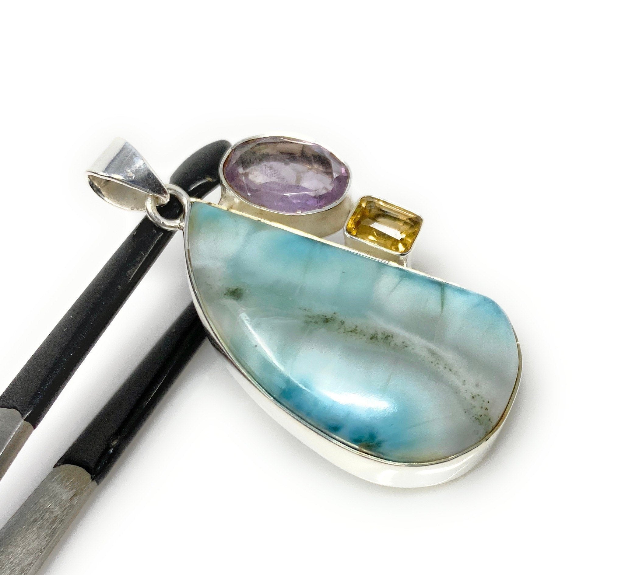 Natural Larimar with Amethyst and Citrine Gemstone Pendant, Sterling Silver Jewelry, Larimar Pendant, Amethyst Pendant, Bohemian Jewelry
