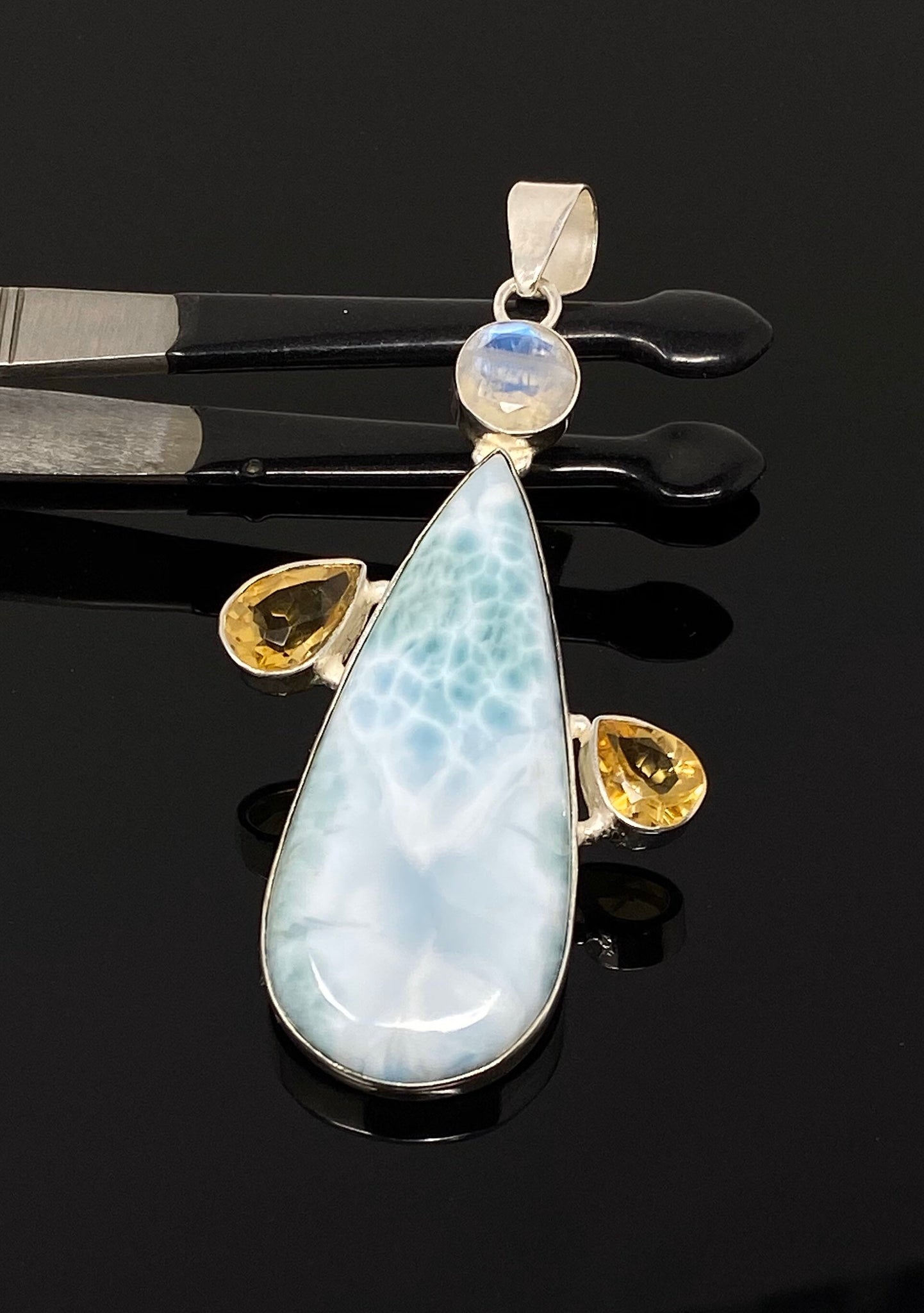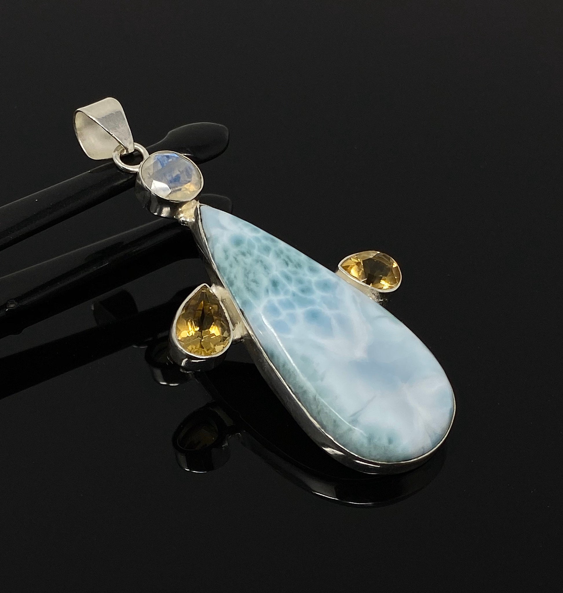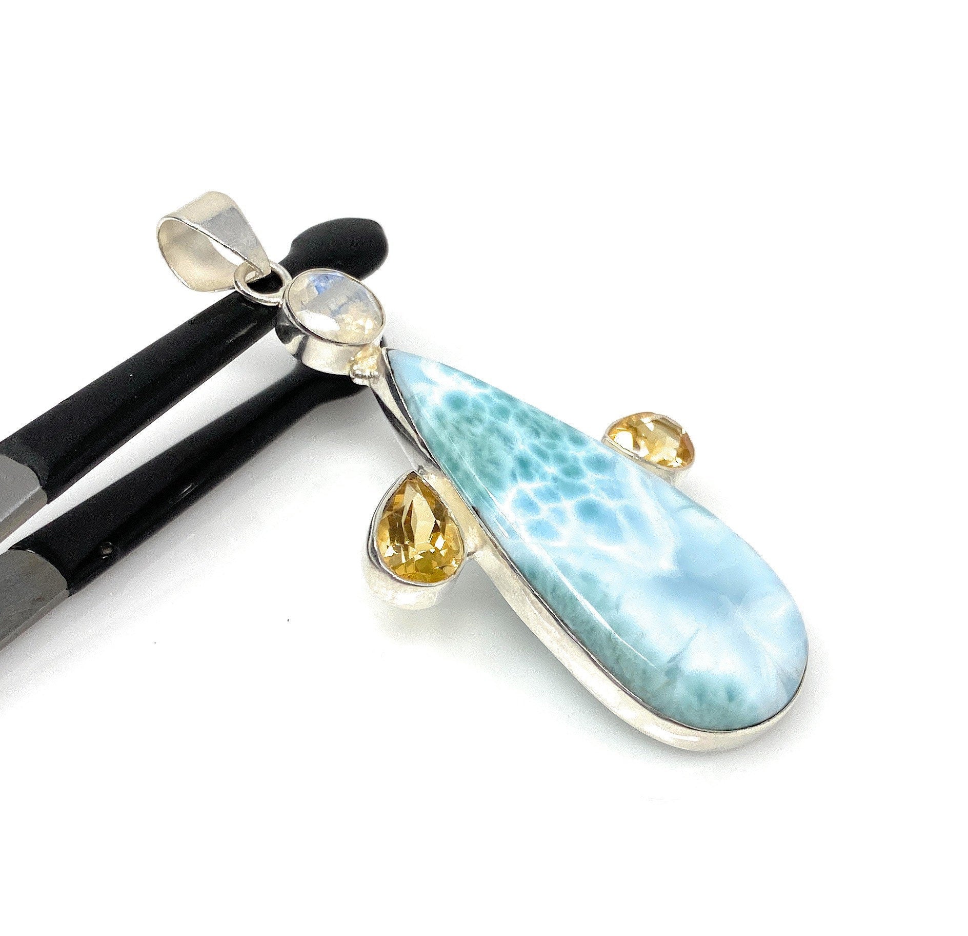 This Beautiful Handmade 925 Sterling Silver Designer Large Pendant is made with using Smooth Larimar Cabochon, Cut Stone Citrine and Rainbow Moonstone and is an excellent choice for any occasion and makes a great gift for the loved ones.
