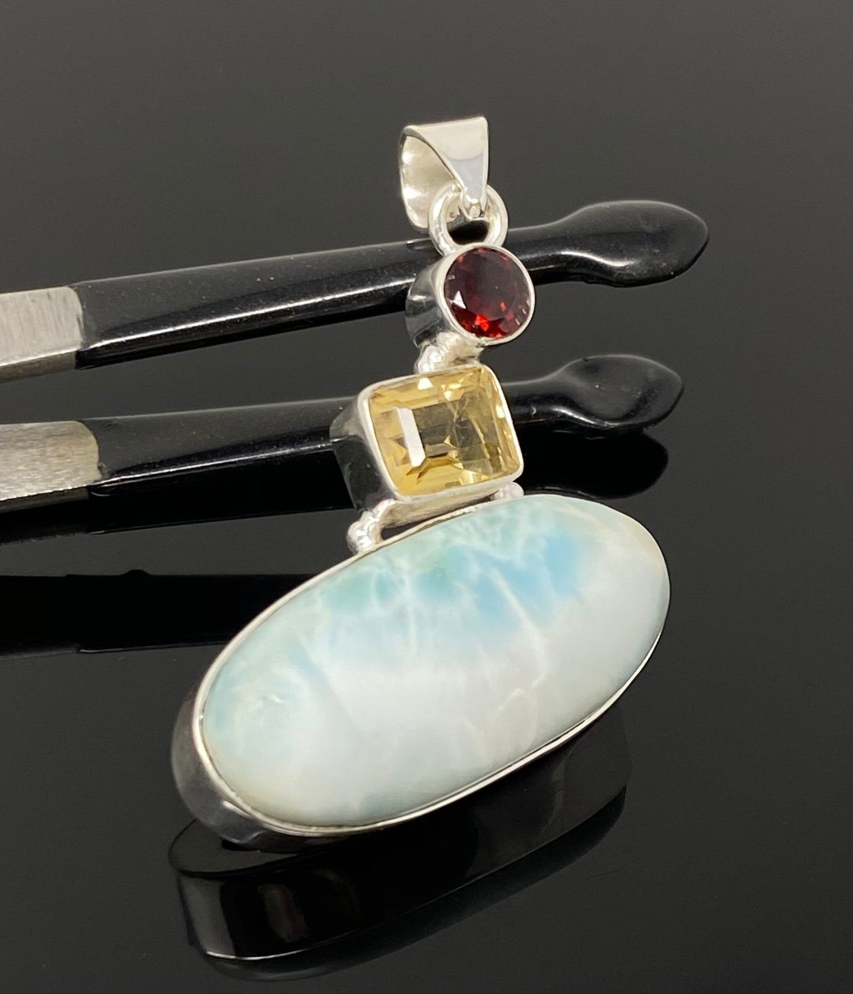 Natural Larimar with Garnet and Citrine Gemstone Pendant, Sterling Silver Jewelry, Larimar Pendant, Citrine Pendant, Bohemian Jewelry