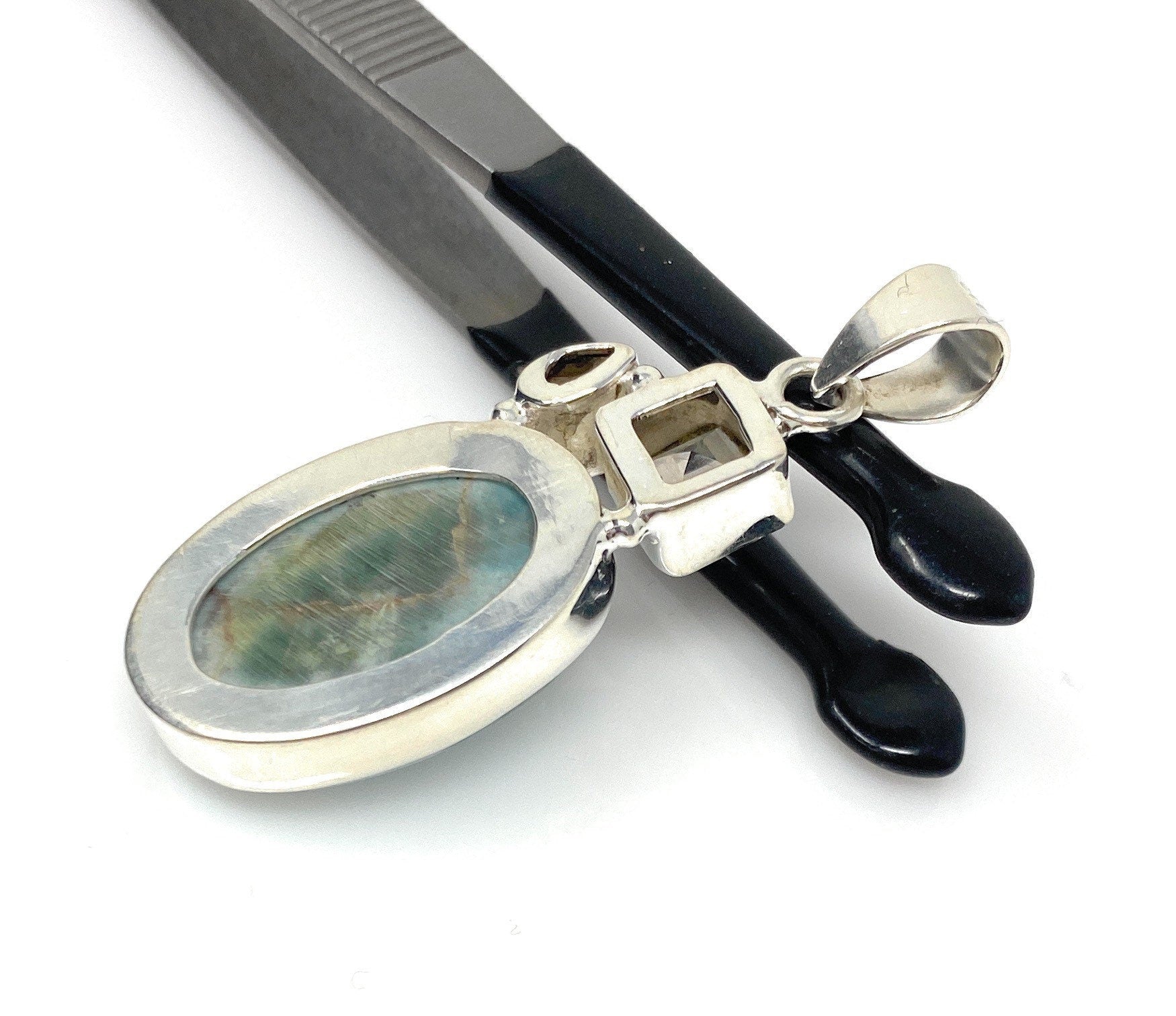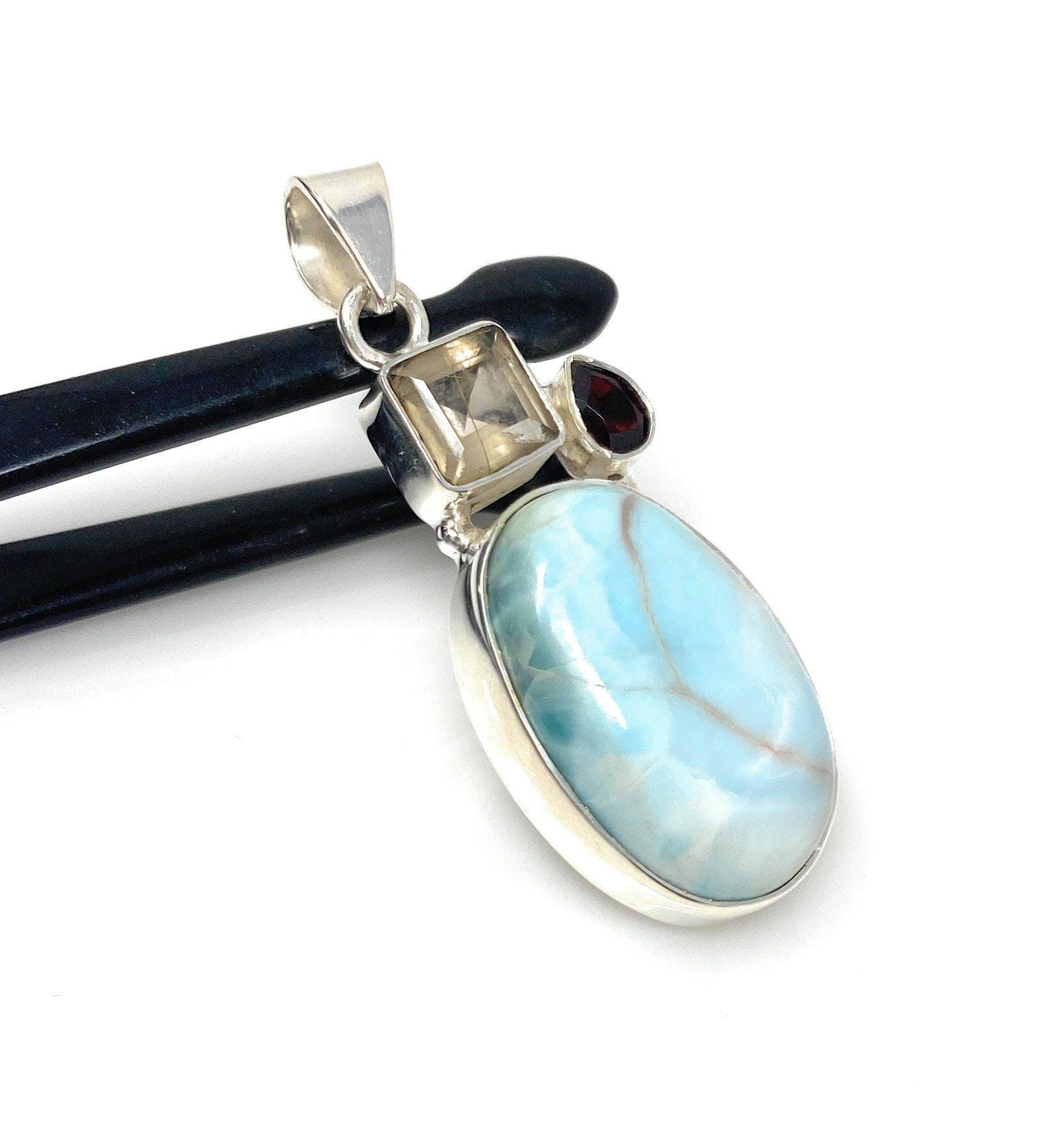 Natural Larimar with Garnet and Golden Rutile Gemstone Pendant, Sterling Silver Jewelry, Larimar Pendant, Bohemian Jewelry