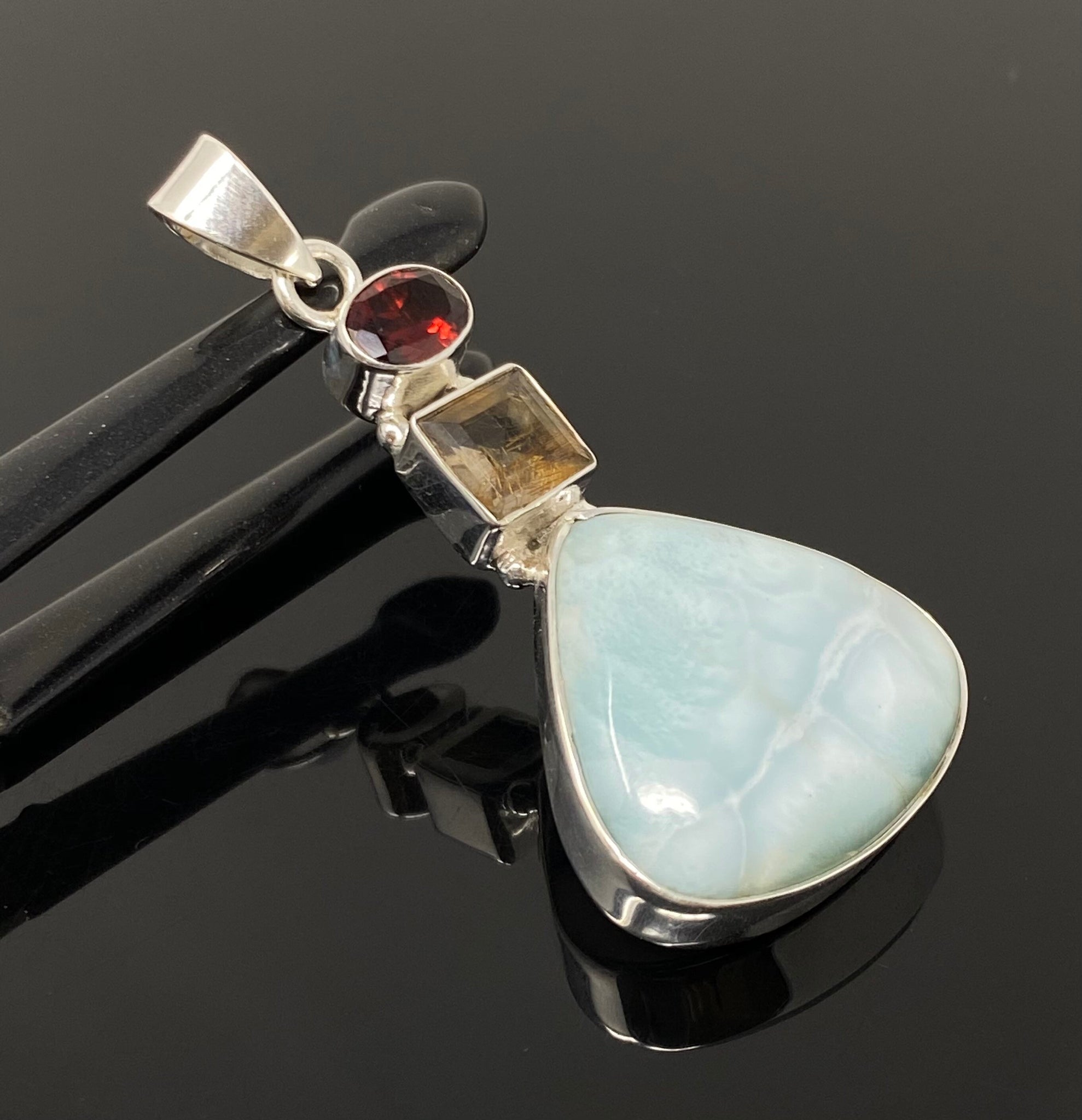 This Beautiful Handmade 925 Sterling Silver Designer Large Pendant is made with using Smooth Larimar Cabochon, Cut Stone Yellow Gold Rutile and Cut Stone Garnet and is an excellent choice for any occasion and makes a great gift for the loved ones.