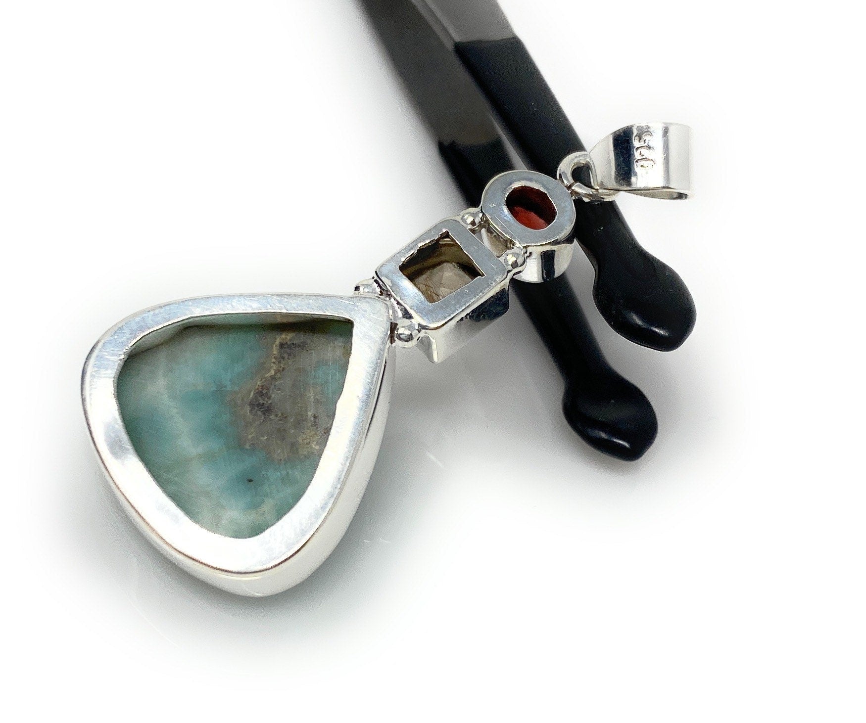 Natural Larimar with Garnet and Golden Rutile Gemstone Pendant, Sterling Silver Jewelry, Larimar Pendant, Bohemian Jewelry