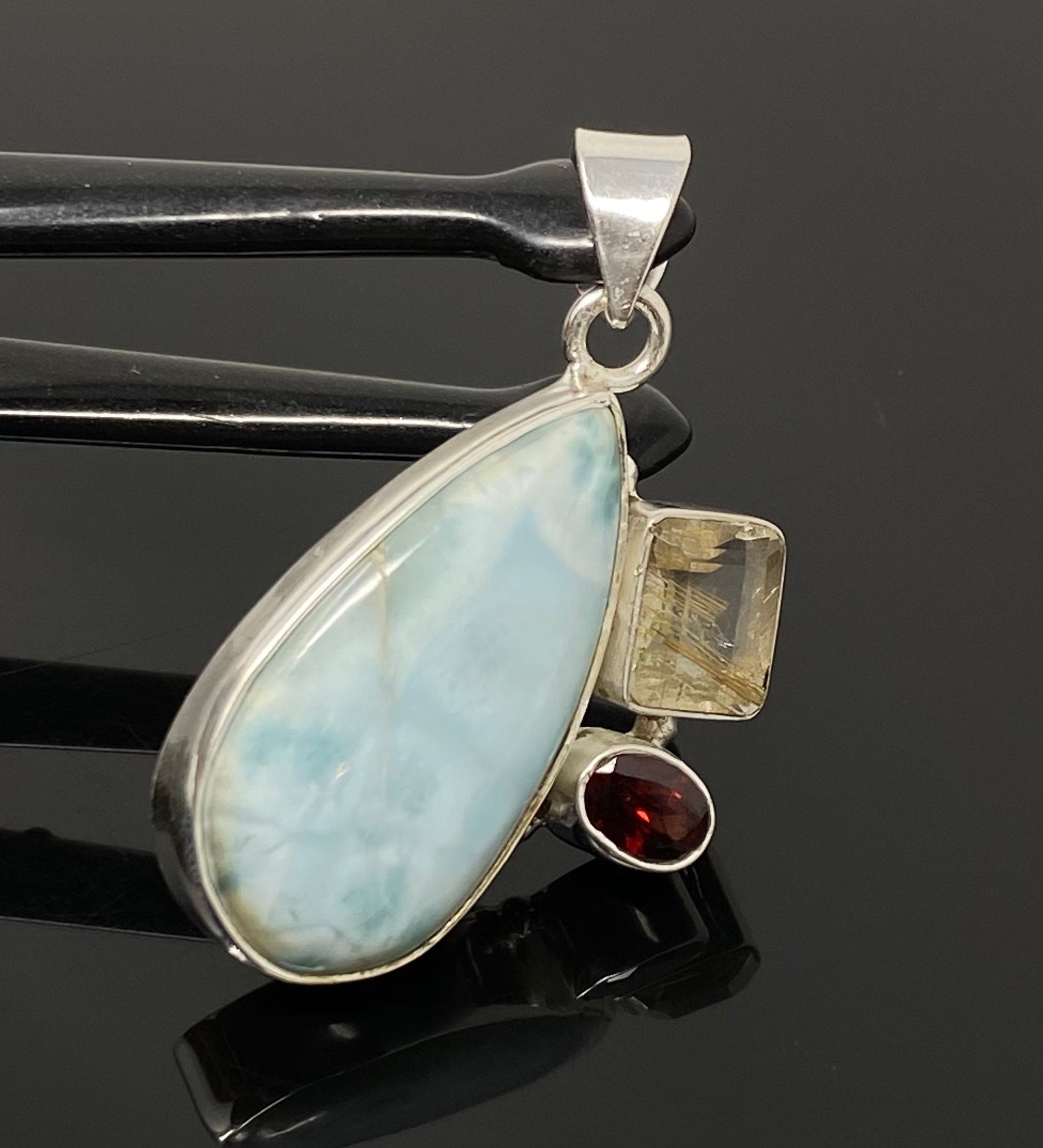 Natural Larimar with Garnet and Golden Rutile Gemstone Pendant, Sterling Silver Jewelry, Larimar Pendant, Bohemian Jewelry
