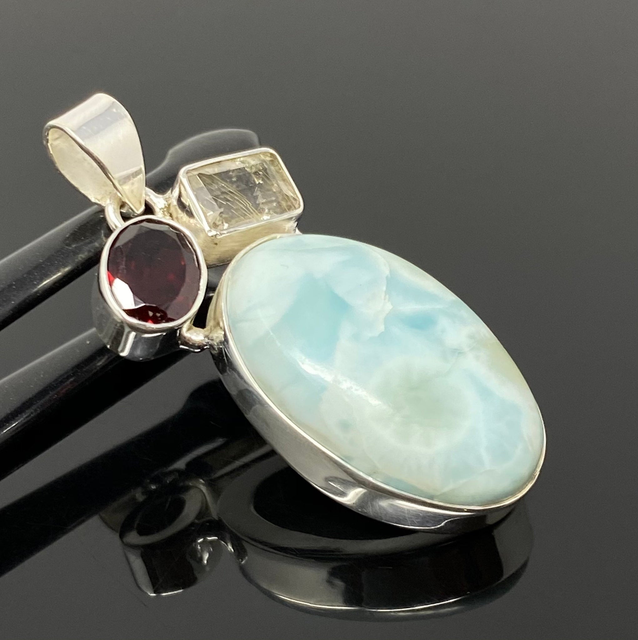 Natural Larimar, Garnet, and Golden Rutile Gemstone Sterling Silver Pendant DIY Jewelry at Wholesale Price.