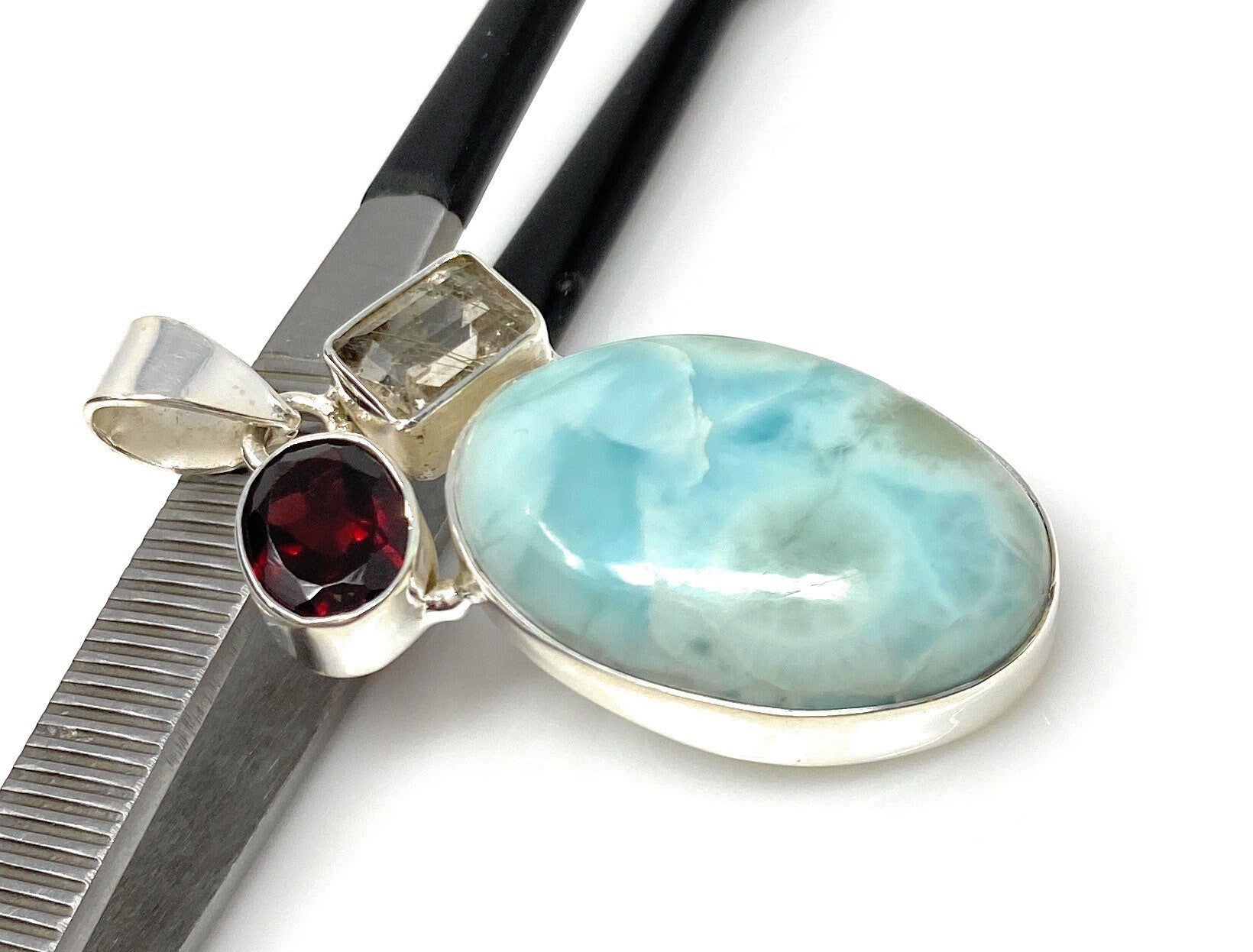 Natural Larimar with Garnet and Golden Rutile Gemstone Pendant, Sterling Silver Jewelry, Larimar Pendant, Bohemian Jewelry
