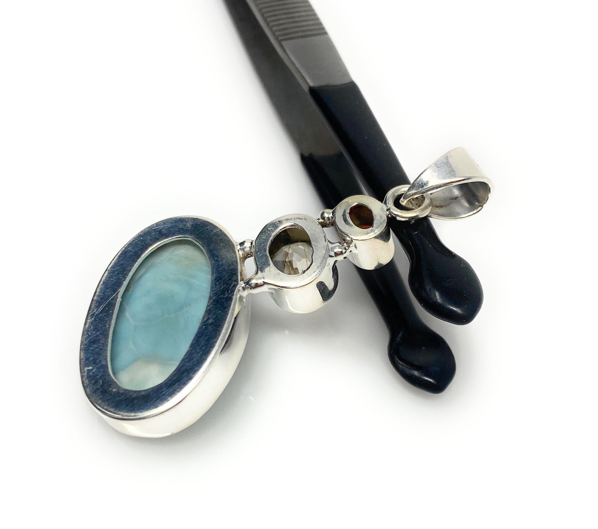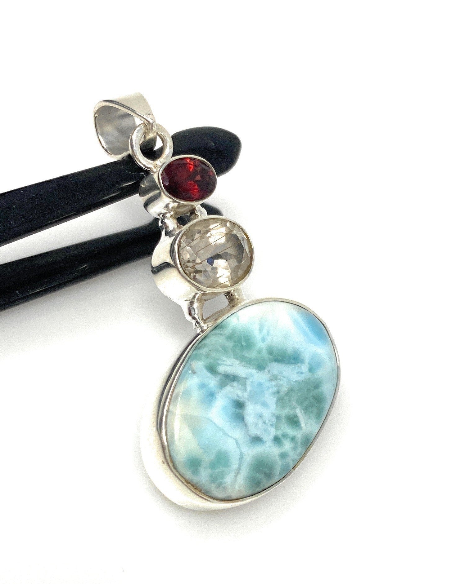 Natural Larimar with Garnet and Yellow Rutile Gemstone Pendant, Sterling Silver Jewelry, Larimar Pendant, Bohemian Jewelry