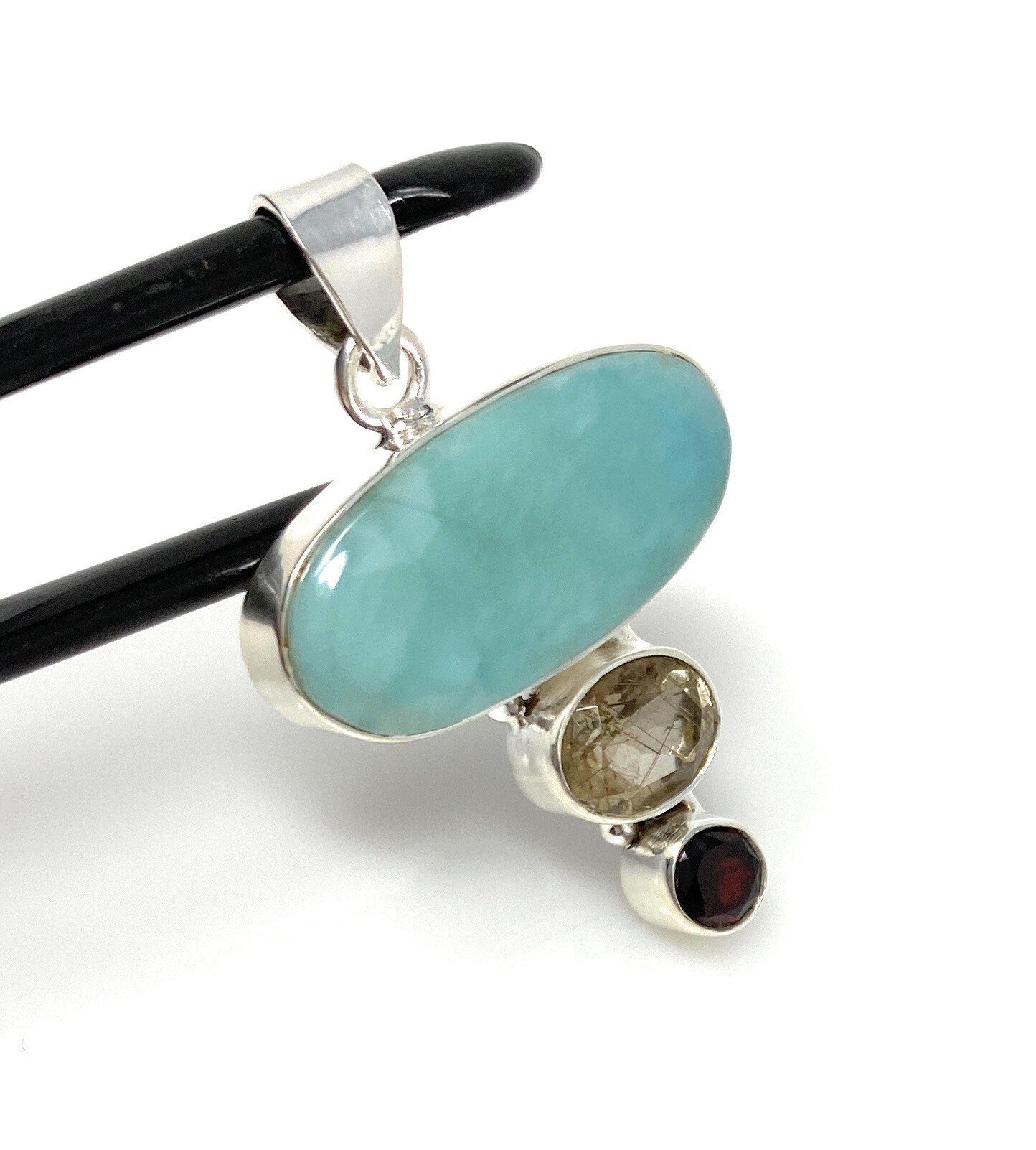 Natural Larimar with Garnet and Yellow Rutile Gemstone Pendant, Sterling Silver Jewelry, Larimar Pendant, Bohemian Jewelry