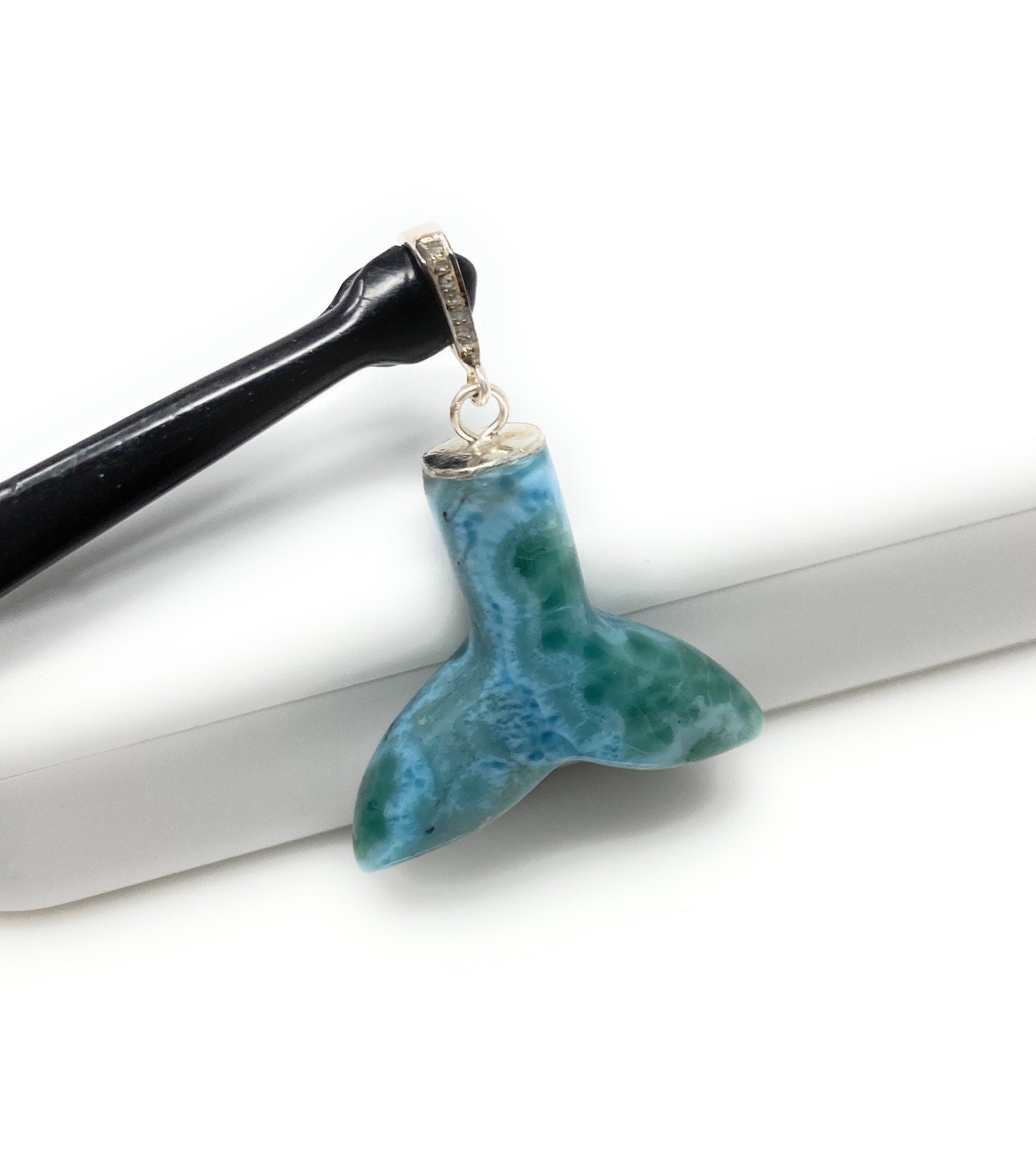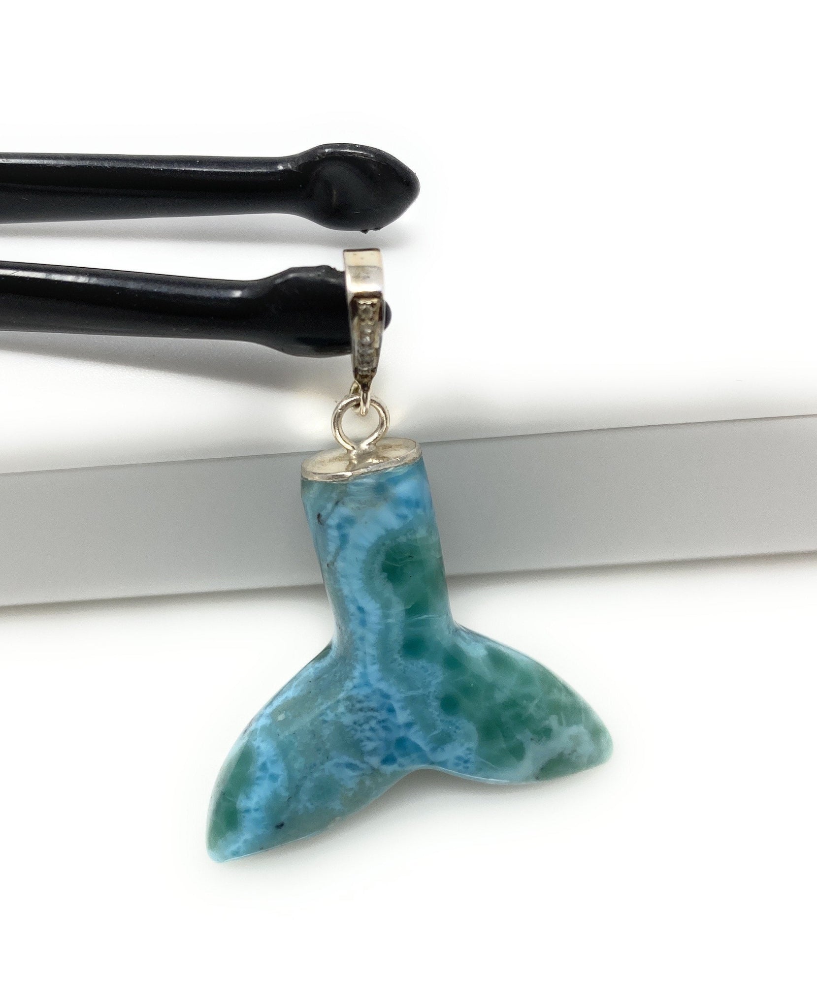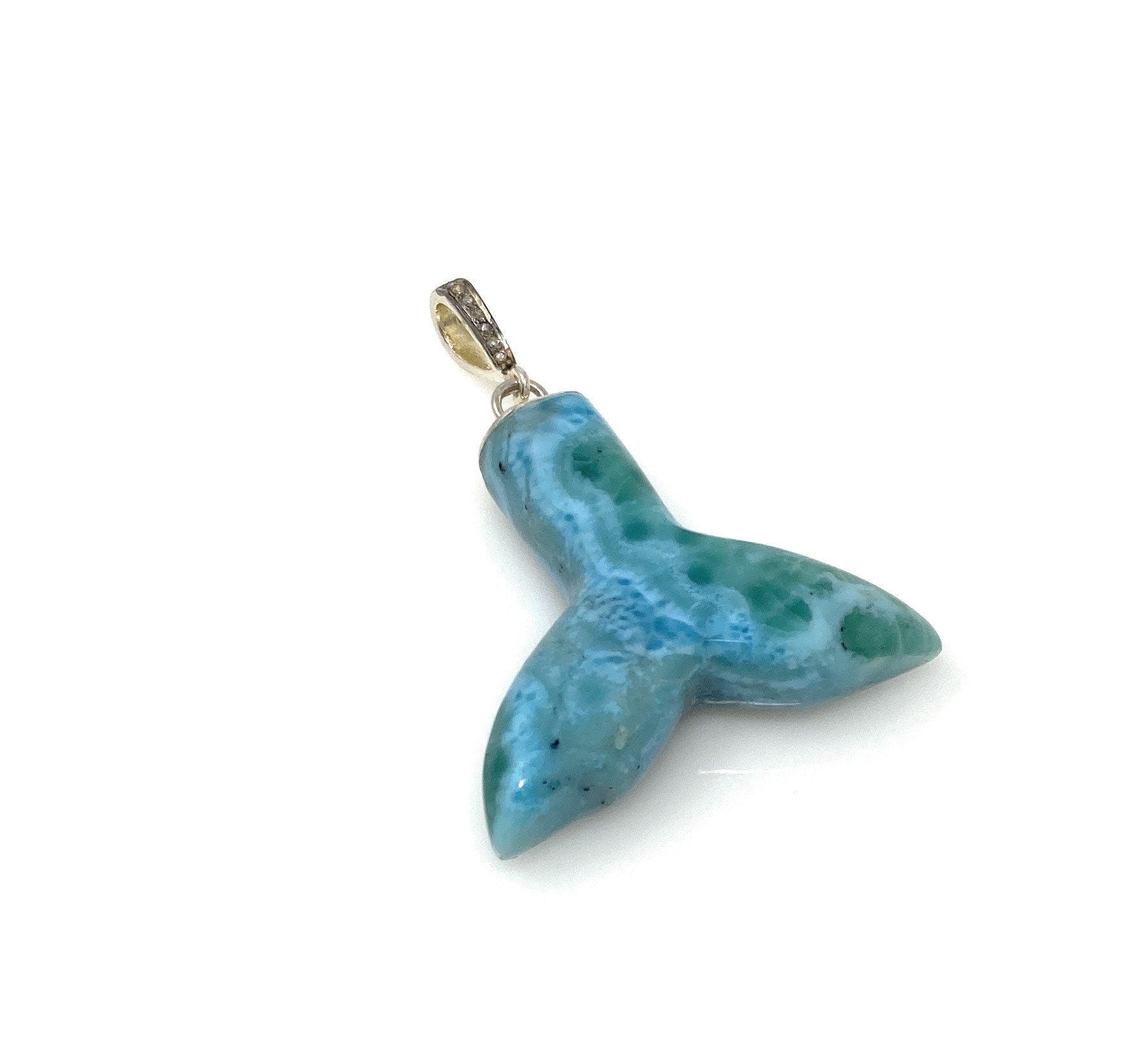 Rare Larimar Mermaid Tail Pendant, Sterling Silver Pave Diamond Pendant, Bohemian Jewelry, Large Larimar Whale Tail Pendant