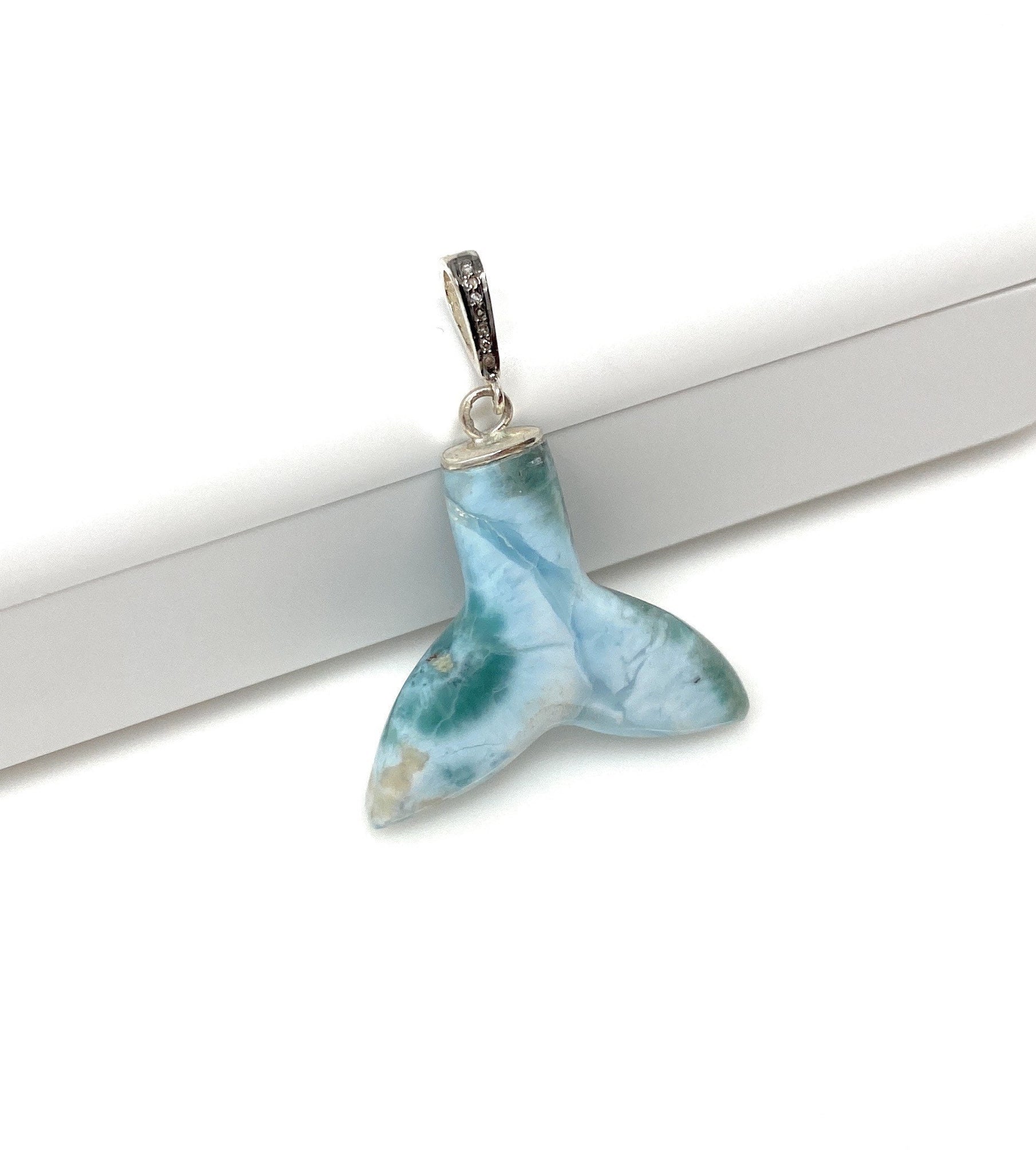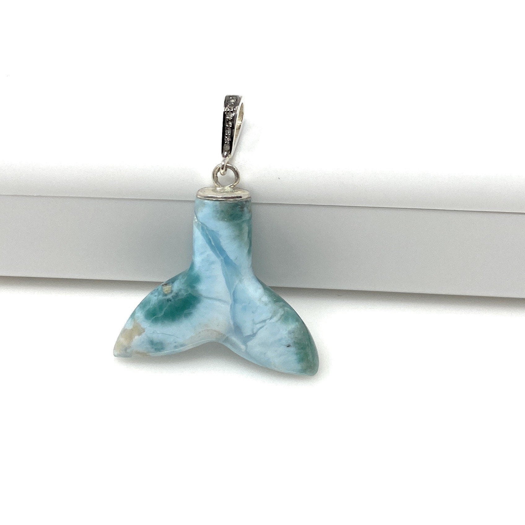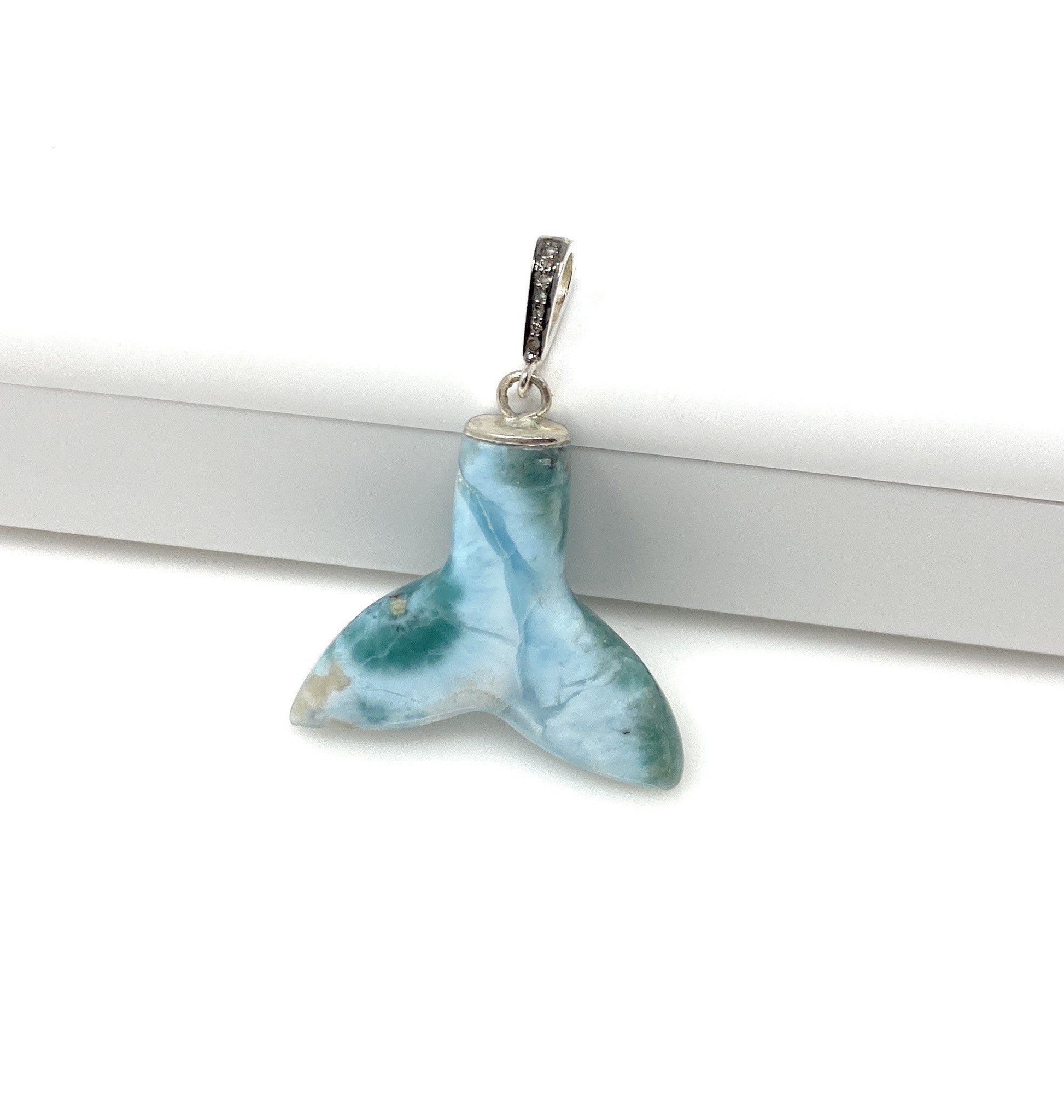 Rare Larimar Mermaid Tail Pendant, Sterling Silver Pave Diamond Pendant, Bohemian Jewelry, Larimar Whale Tail Pendant